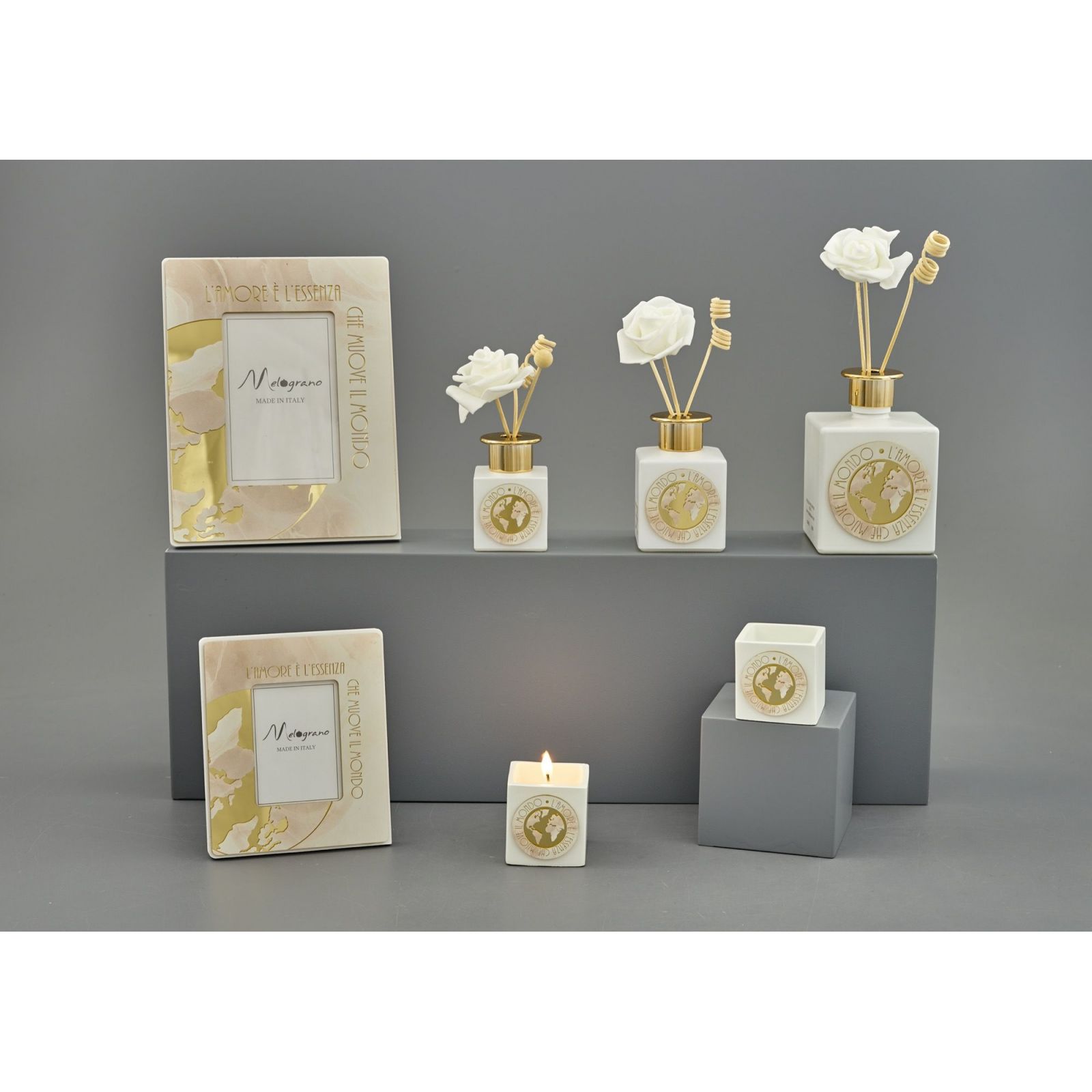 Il profumatore con mappamondo, tappo oro e la frase "L'amore è l'essenza che muove il mondo" creano un'atmosfera di pace e serenità.Il colore bianco con dettagli color oro conferisce un tocco di eleganza. Si tratta di un'idea utile e completa che si adatta ad ogni tipo di matrimonio, anniversario, ma anche per una prima comunione, o un'occasione speciale a tema viaggio.