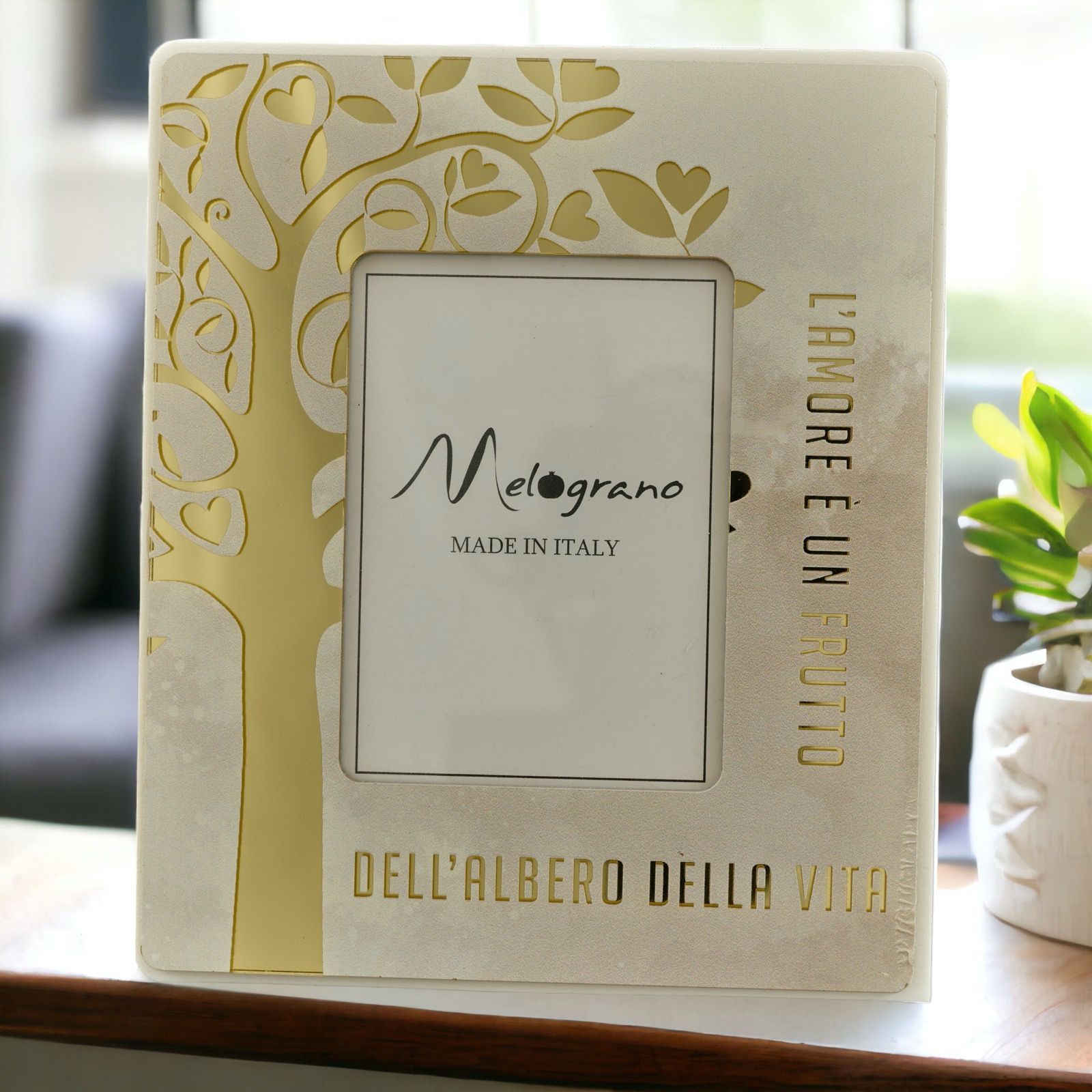 Regala una bomboniera speciale, unica ed elegante. Questa cornice con albero della vita e frase incisa "l'amore è un frutto dell'albero della vita è la bomboniera ideale per un matrimonio, nozze o anniversario. Un regalo particolare per i testimoni e gli invitati al tuo matrimonio o come idea originale e economica come dono per il 50° Anniversario delle nozze d'oro. Disponibile in due misure, Standard : H.16X13CM(foto interna 7x10); Grande: H.23X18CM(foto interna 10x15) in colore oro e tortora, e realizzata con materiali di grande qualità. Nella stessa confezione una scatola regalo inclusa. La tua bomboniera sarà completa e pronta per essere regalata.