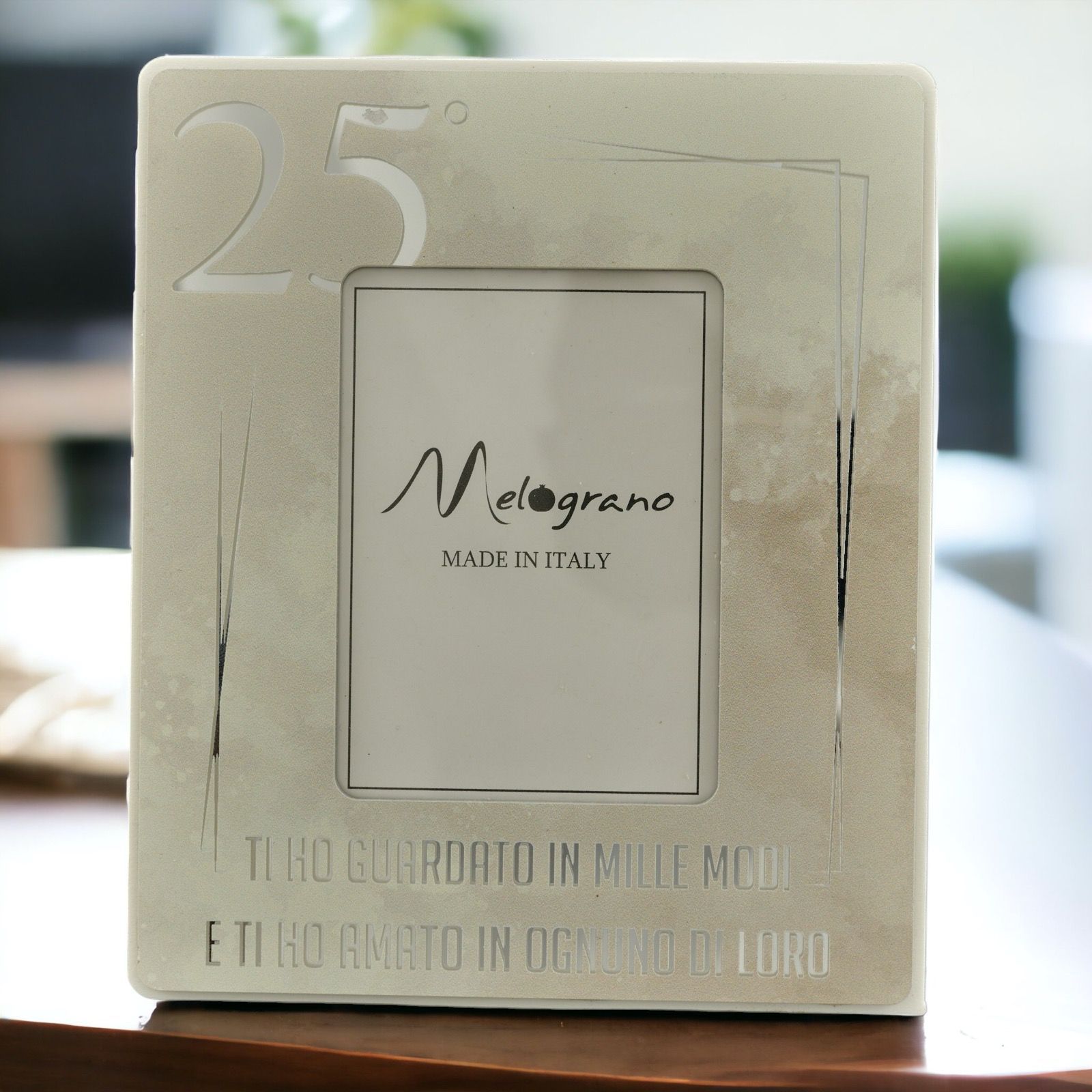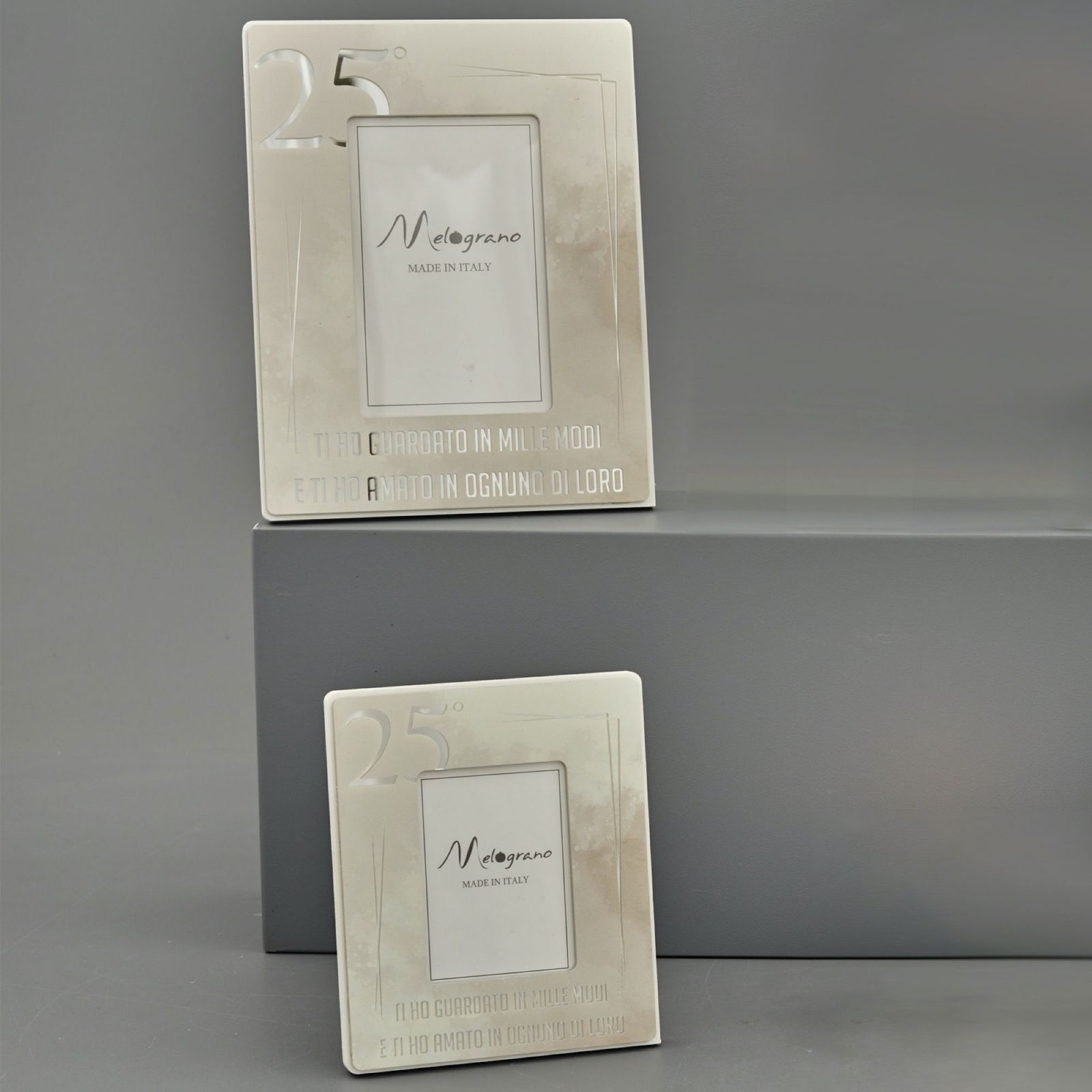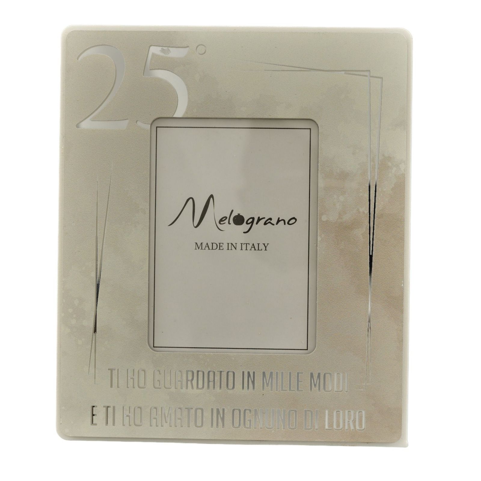 Questa cornice con dettagli color argento, numero 25° e la frase "ti ho guardato in mille e modi e ti ho amato in ognuno di loro", è un regalo particolare e significativo per ricordare lo speciale traguardo raggiunto. Realizzata in color tortora e argento, con due misure (Standard : H.16X13CM; Grande: H.23X18CM) e con scatola regalo inclusa nel prezzo, questa bomboniera è un'idea completa ed elegante per le nozze d'argento a un prezzo economico.