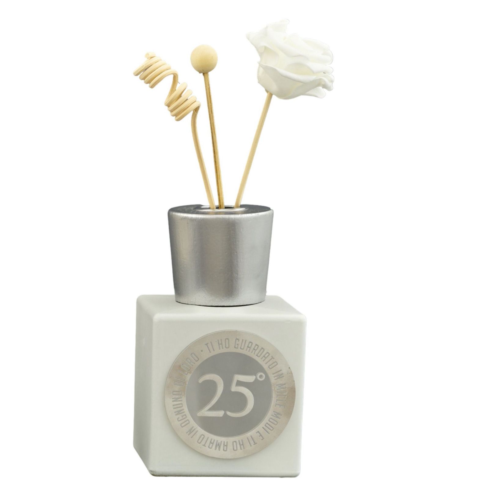 Regala un profumatore tondo dal centro color argento e con la frase "ti ho guardato in mille modi e ti ho amato in ognuno di loro" per festeggiare gli invitati al 25° anniversario. Queste bomboniere eleganti e raffinate sono un omaggio unico ed originale che i tuoi ospiti apprezzeranno. La misura di 8,7x8,7x3 cm circa e il materiale in gesso conferiscono al profumatore un aspetto davvero particolare. La scatola regalo è inclusa.