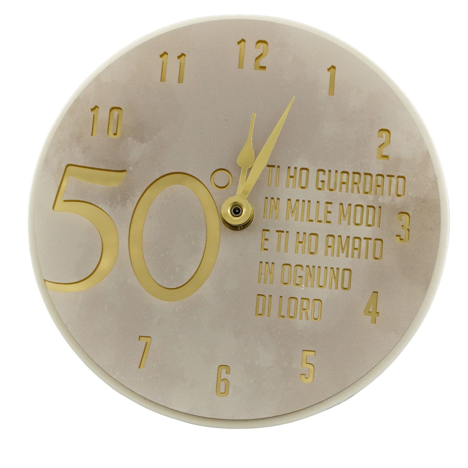 Regala un ricordo indimenticabile con questo speciale orologio con numero 50 oro! Un utile e originale dono per festeggiare un anniversario o nozze con una bomboniera che gli ospiti non dimenticheranno mai. È un orologio dal diametro di 15 cm che celebra l'amore con la frase "Ti ho guardato in mille modi e ti ho amato in ognuno di loro". Un regalo prezioso e originale da donare agli invitati: un dono che non passerà mai di moda. Ogni ordine contiene una scatola regalo per sistemare al meglio la bomboniera.