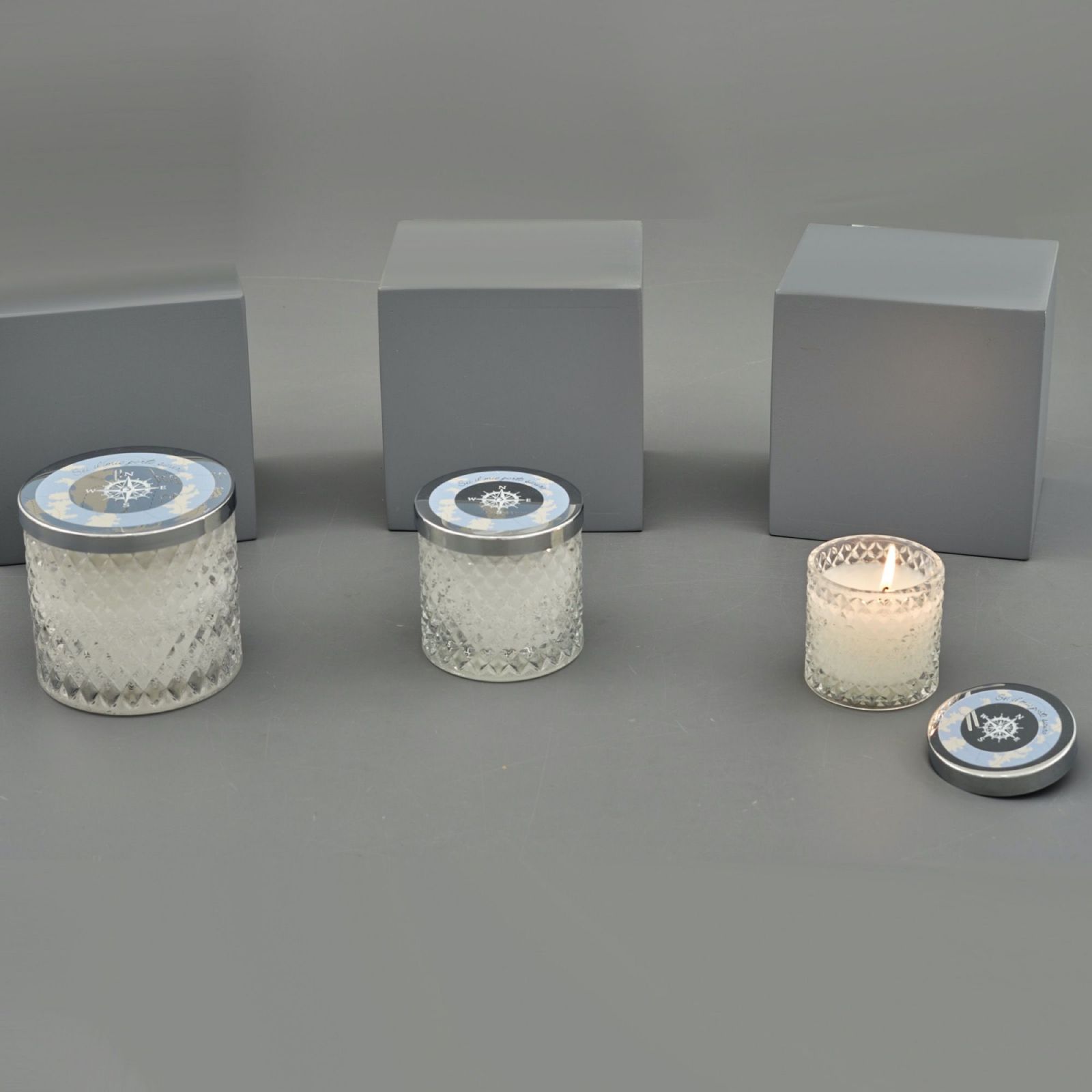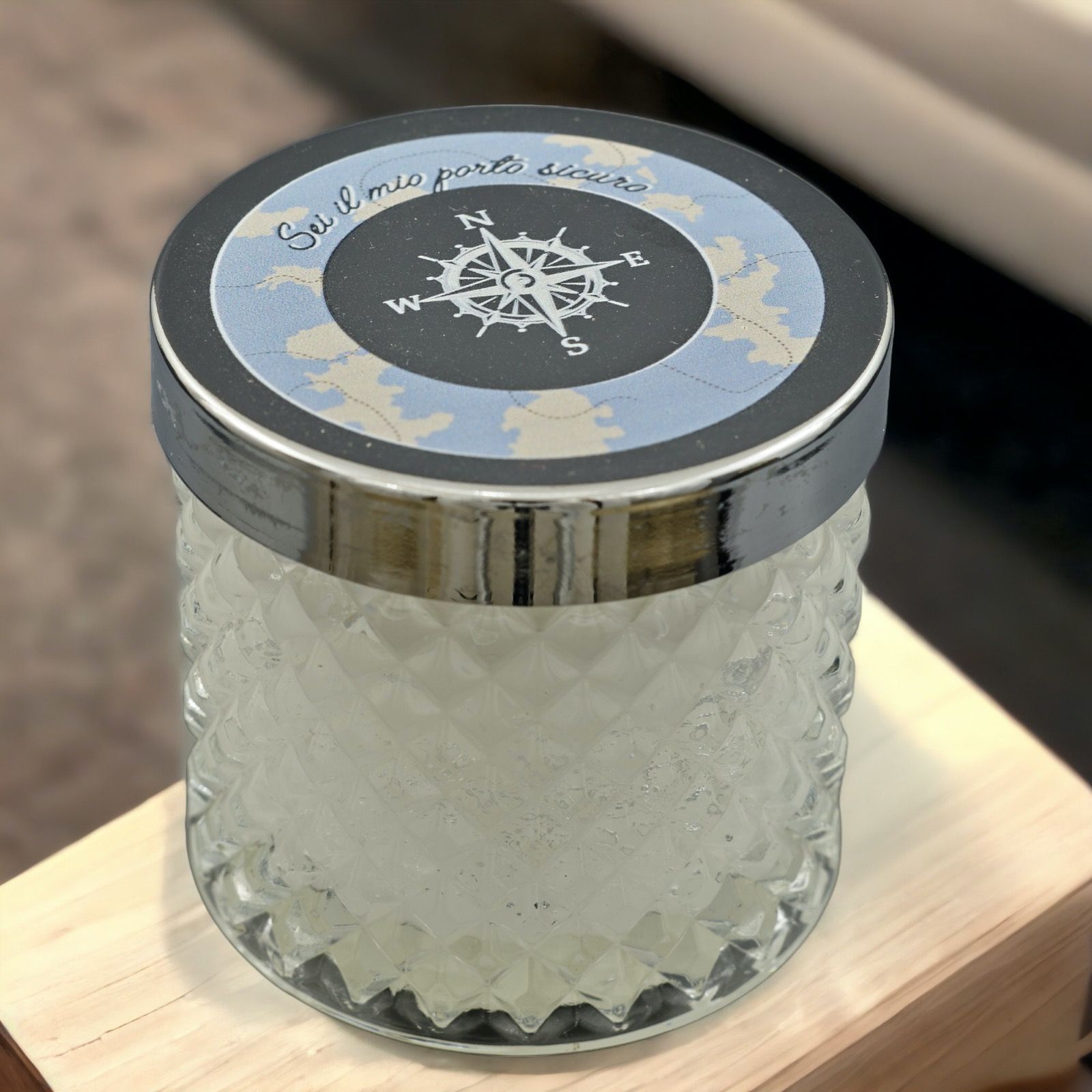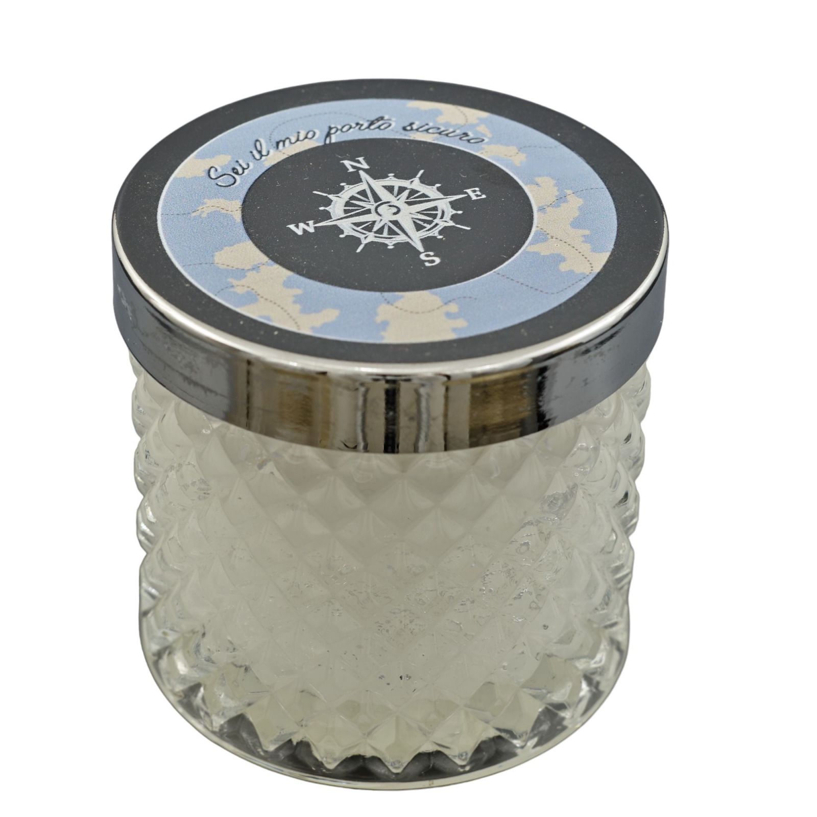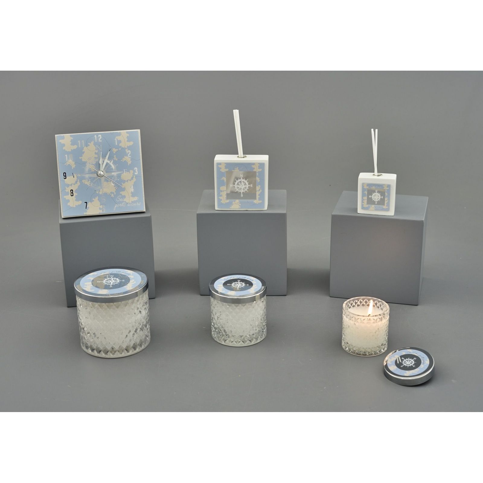 Il portacandela è disponibile in tre dimensioni: Standard : H.8X7X7CM; Grande: H.8,5X8,5X8,5CM; Maxi: H.10X11X11CM. Lo sfondo blu con mappa beige e il tappo argento con forma di rosa dei venti creano un design affascinante e raffinato.