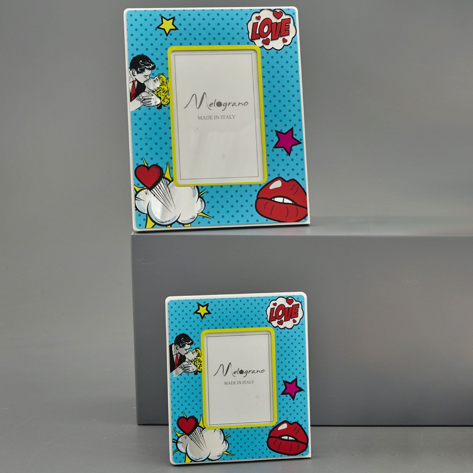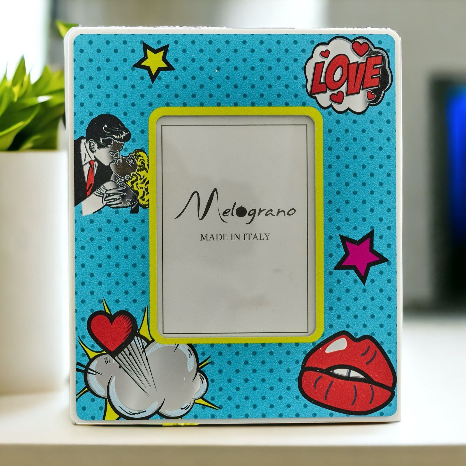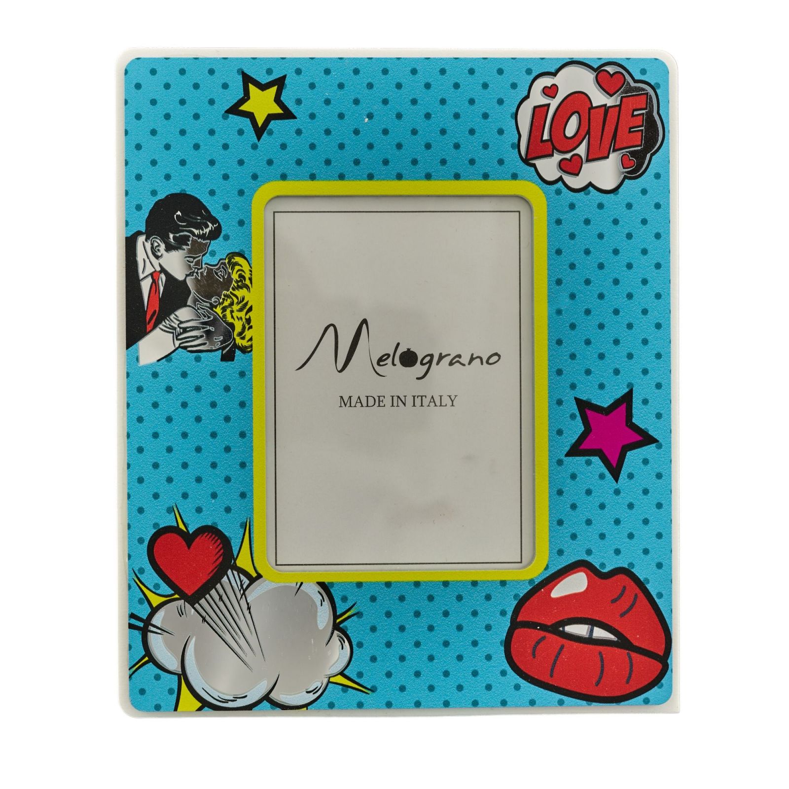 La cornice foto stile pop art con ragazzi che si baciano, labbra, scritta love, nuvola cuore e stelle si adatta a qualsiasi evento come matrimonio, anniversario o promessa.