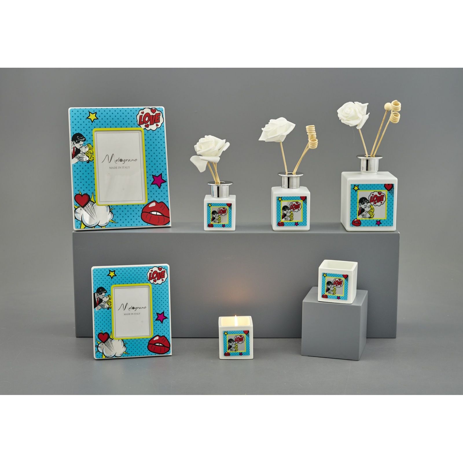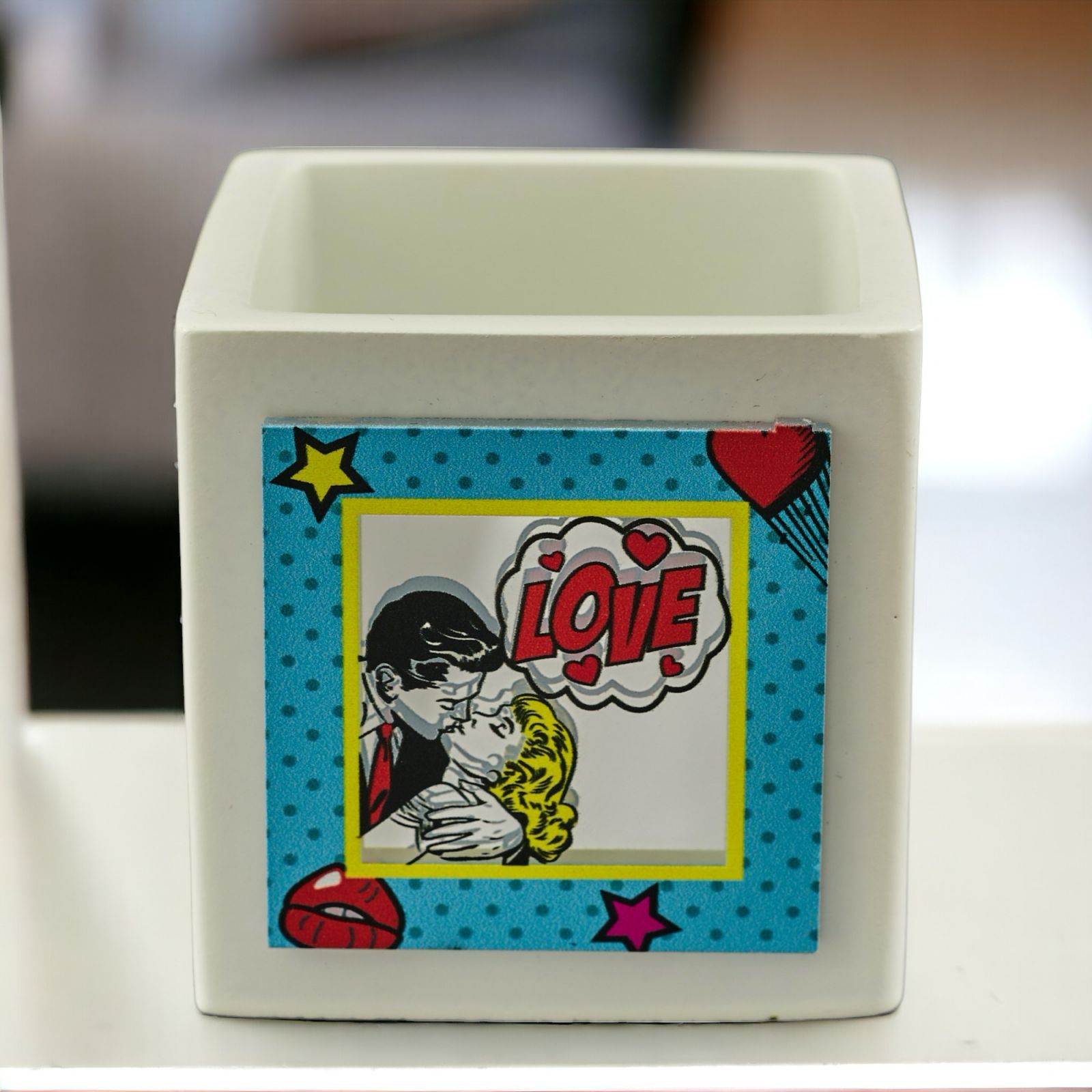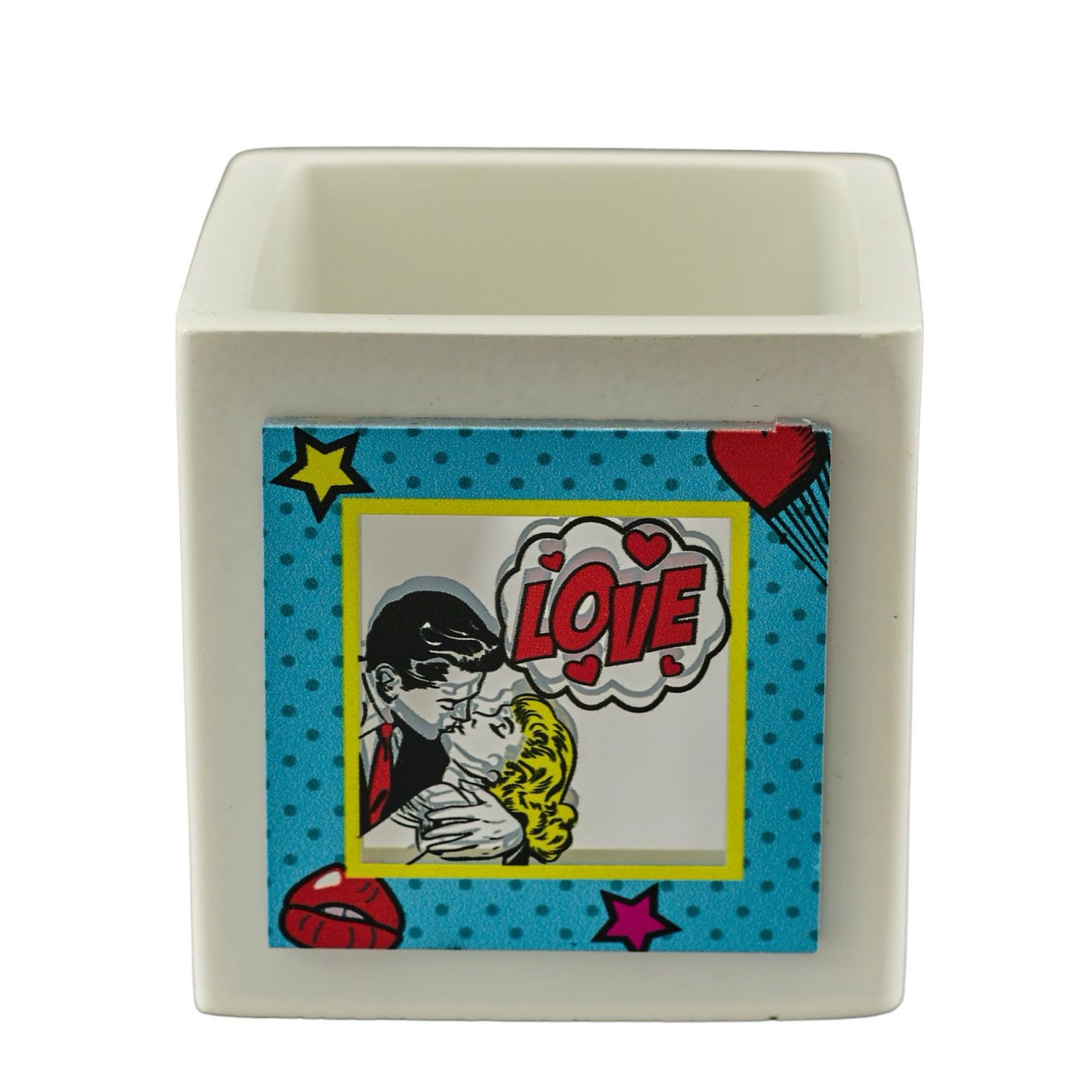Regala una bomboniera originale ed elegante per i tuoi eventi più importanti come un matrimonio, un anniversario o una promessa. Questo portacandele in stile pop art a forma di cubo con ragazzi che si baciano e scritta love è l'idea perfetta e dà un tocco di originalità al tuo evento.