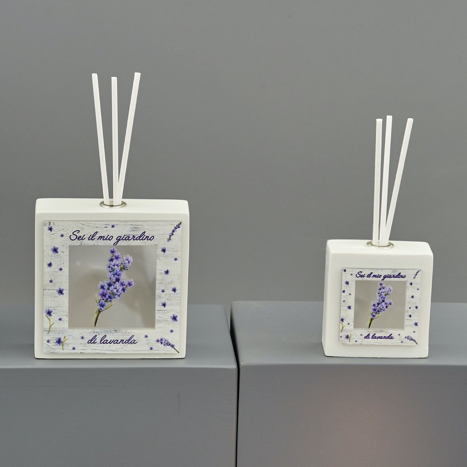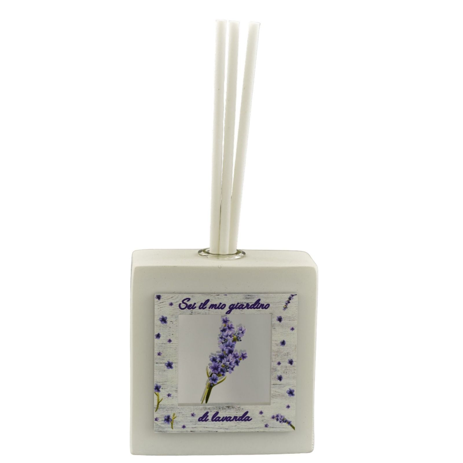Regala un'atmosfera di pace e benessere con questa bomboniera dalle linee semplici ed eleganti! Questo profumatore quadrato decorato con fiori di lavanda e una frase romantica "Sei il mio giardino di lavanda" è disponibile in due misure: Standard 6,2x 6,2x3 cm circa, Grande: 8,7x8,7x3 cm circa. Originali e eleganti, sono realizzati in gesso bianco con fiorellini e frase viola. Un'idea originale per stupire gli ospiti dei tuoi eventi: matrimonio, anniversario, promessa, prima comunione, santa cresima, nozze d'oro o argento. Una bomboniera che diventa diffusore di essenze, grazie alla presenza di un Standard foro, è un dono che ricorda ai vostri amici e parenti la gioia e il piacere di un momento speciale.