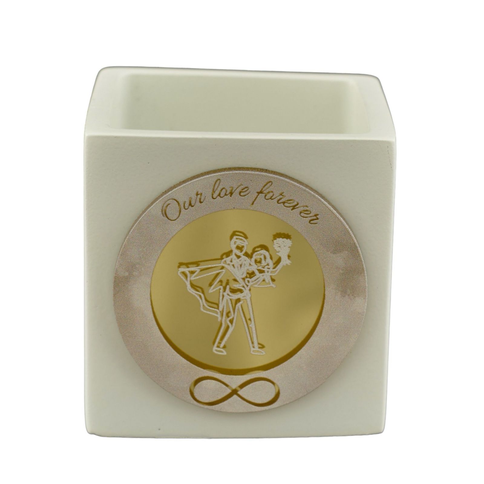 Regala uno dei più dolci simboli d'amore con questo meraviglioso vaso a cubo con sposa in braccio allo sposo, simbolo infito e frase "Our love forever".