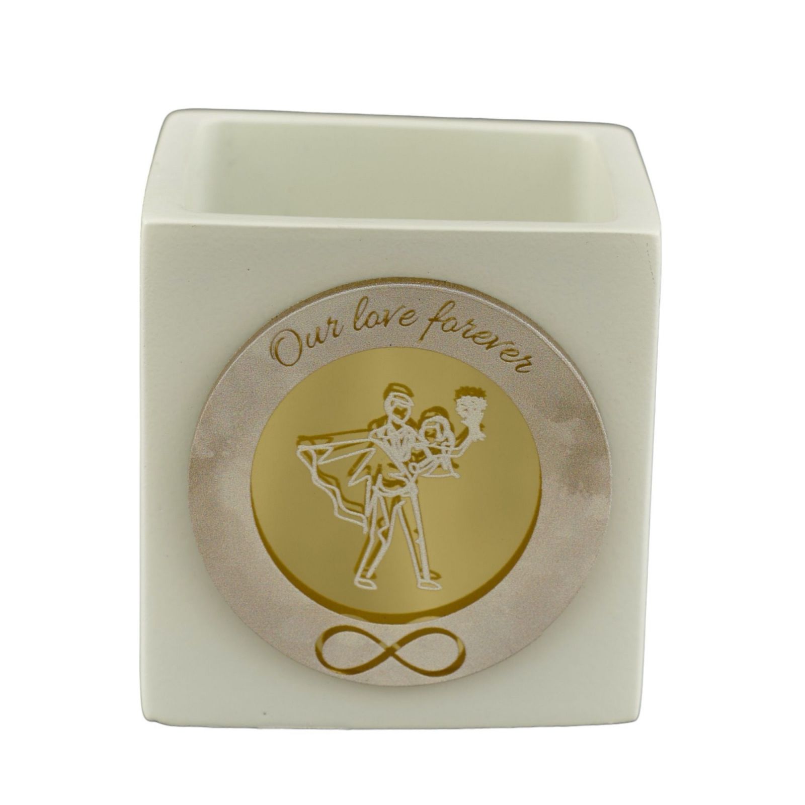 La bomboniera a cubo con sposa in braccio allo sposo, simbolo infinito e frase "Our Love Forever", è la scelta ideale per le partecipazioni di nozze più complete ed eleganti. Di dimensione H.6X6X6CM e realizzata in materiale resistente, la candela bianca è impreziosita dalla frase e dalla raffigurazione color oro che conferiscono un tocco di originalità e di particolarità. Una bomboniera economica e utile allo stesso tempo, perfetta per celebrare matrimoni o anniversari.