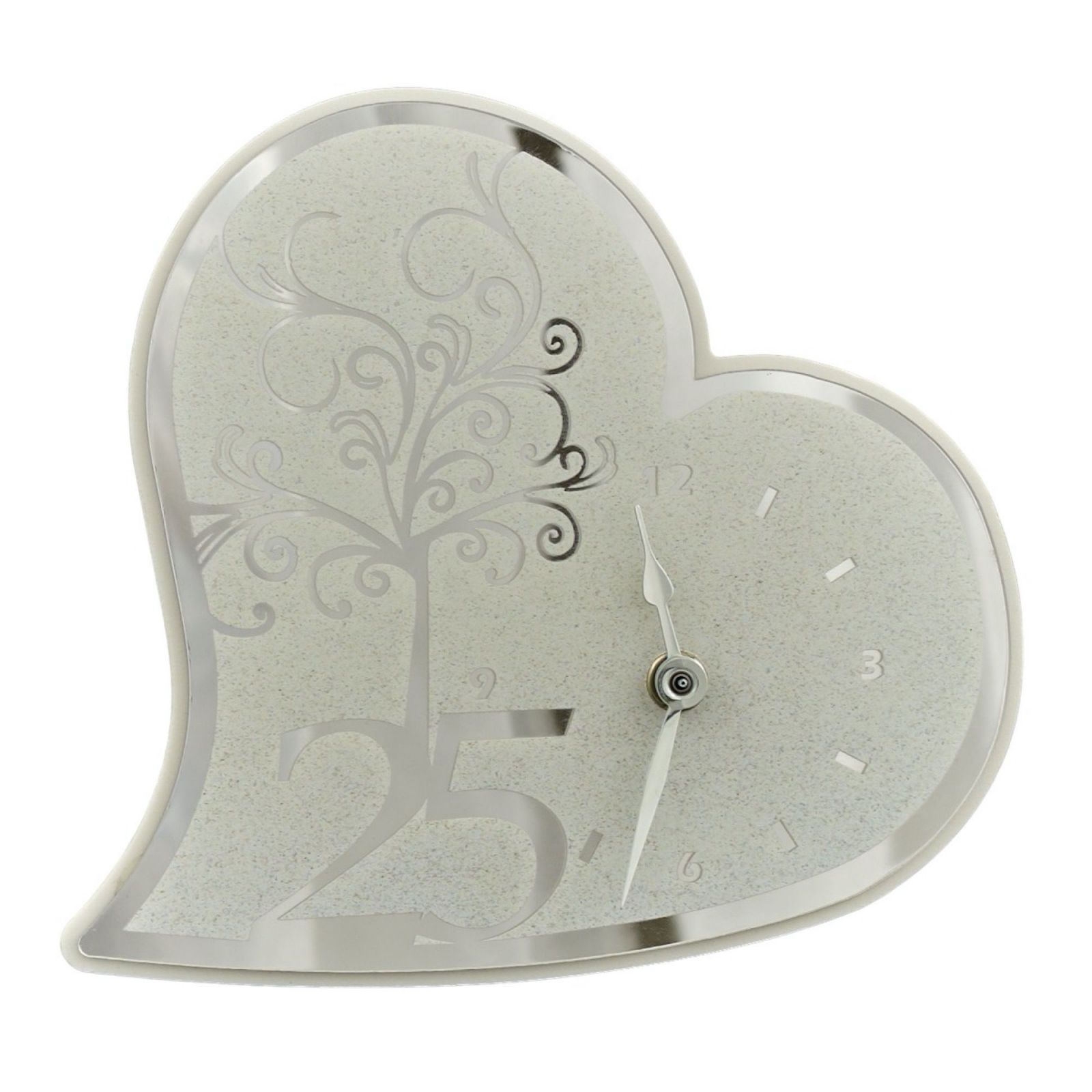 Regala uno splendido orologio in forma di cuore con albero della vita e contorni color argento con numero 25 per celebrare l'anniversario delle nozze d'argento. Realizzata in plexiglass, questa bomboniera di grande impatto regalerà un sorriso a tutti gli invitati dell'evento. La sua dimensione di 20,5X17,5X4cm circa e l'accostamento di colori bianco e argento la rendono un'idea originale, elegante e particolare. Le bomboniere complete e economiche sono proposte in una bellissima scatola regalo inclusa per un regalo perfetto.