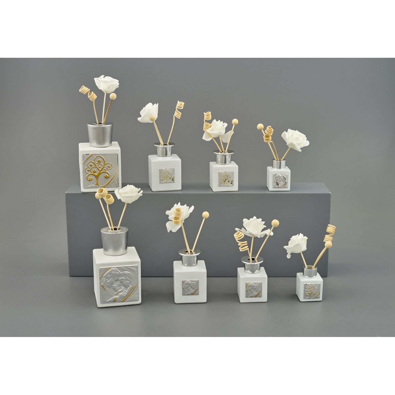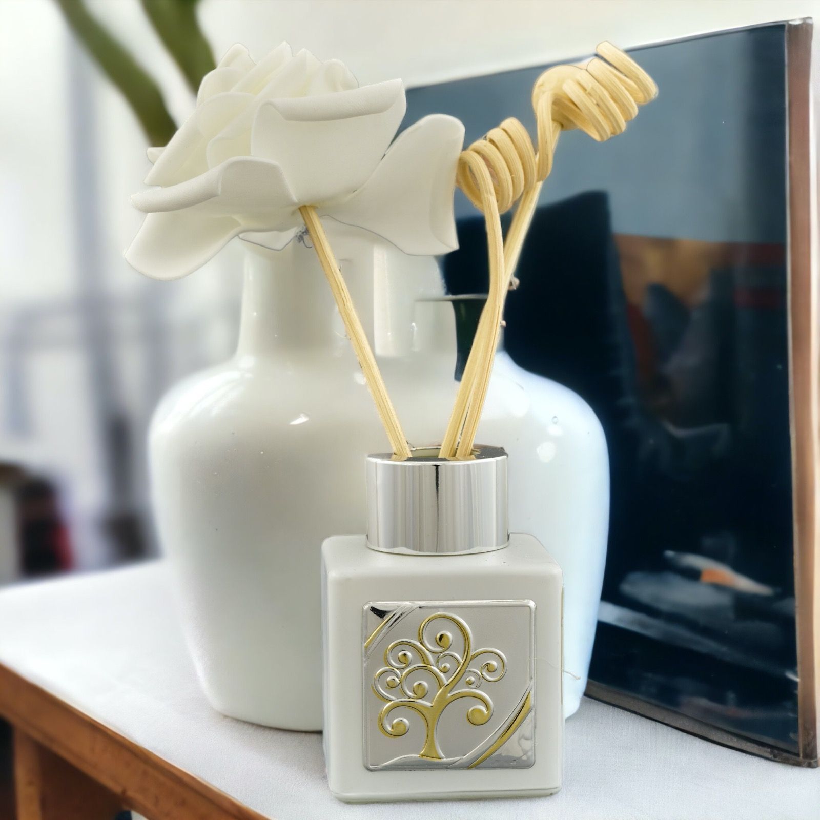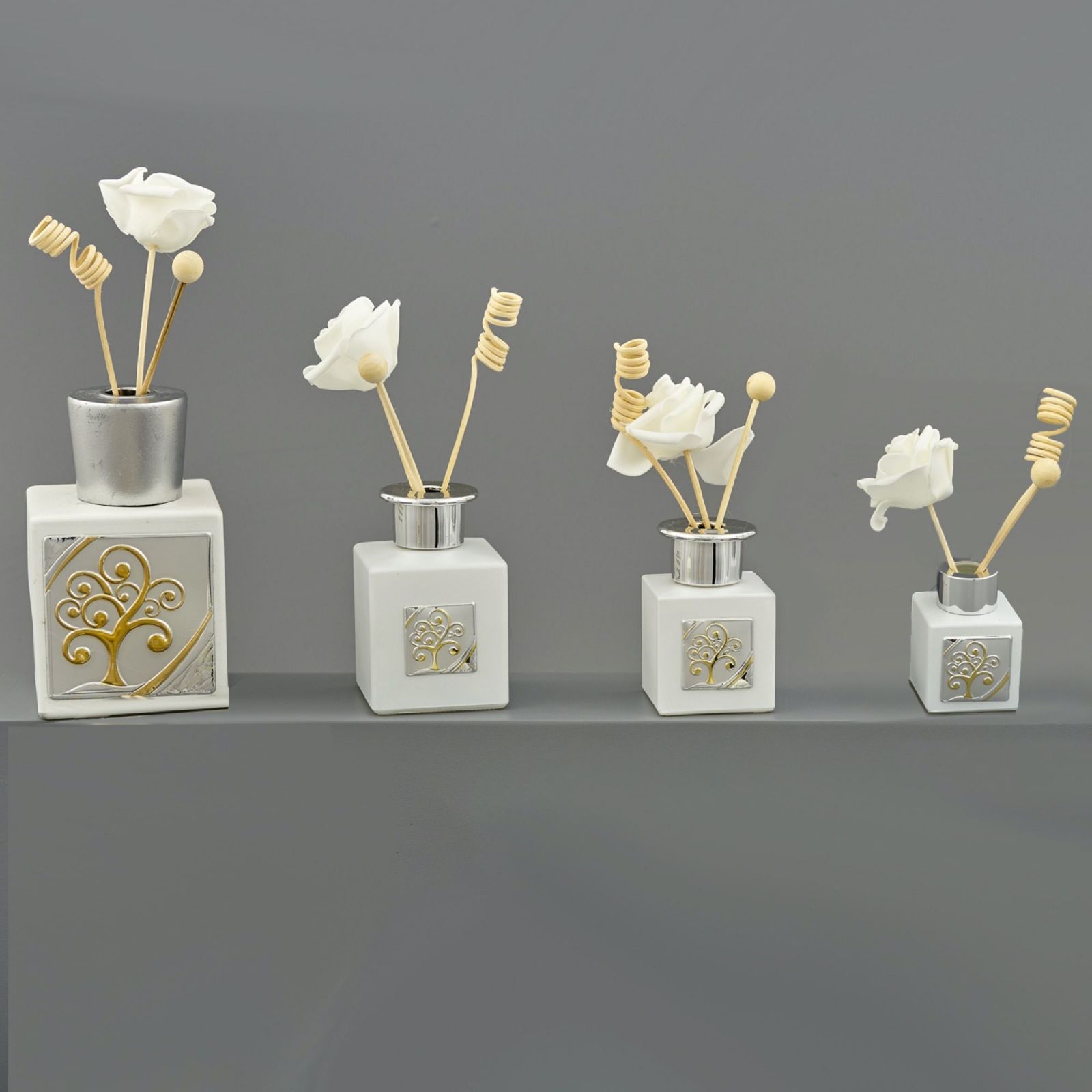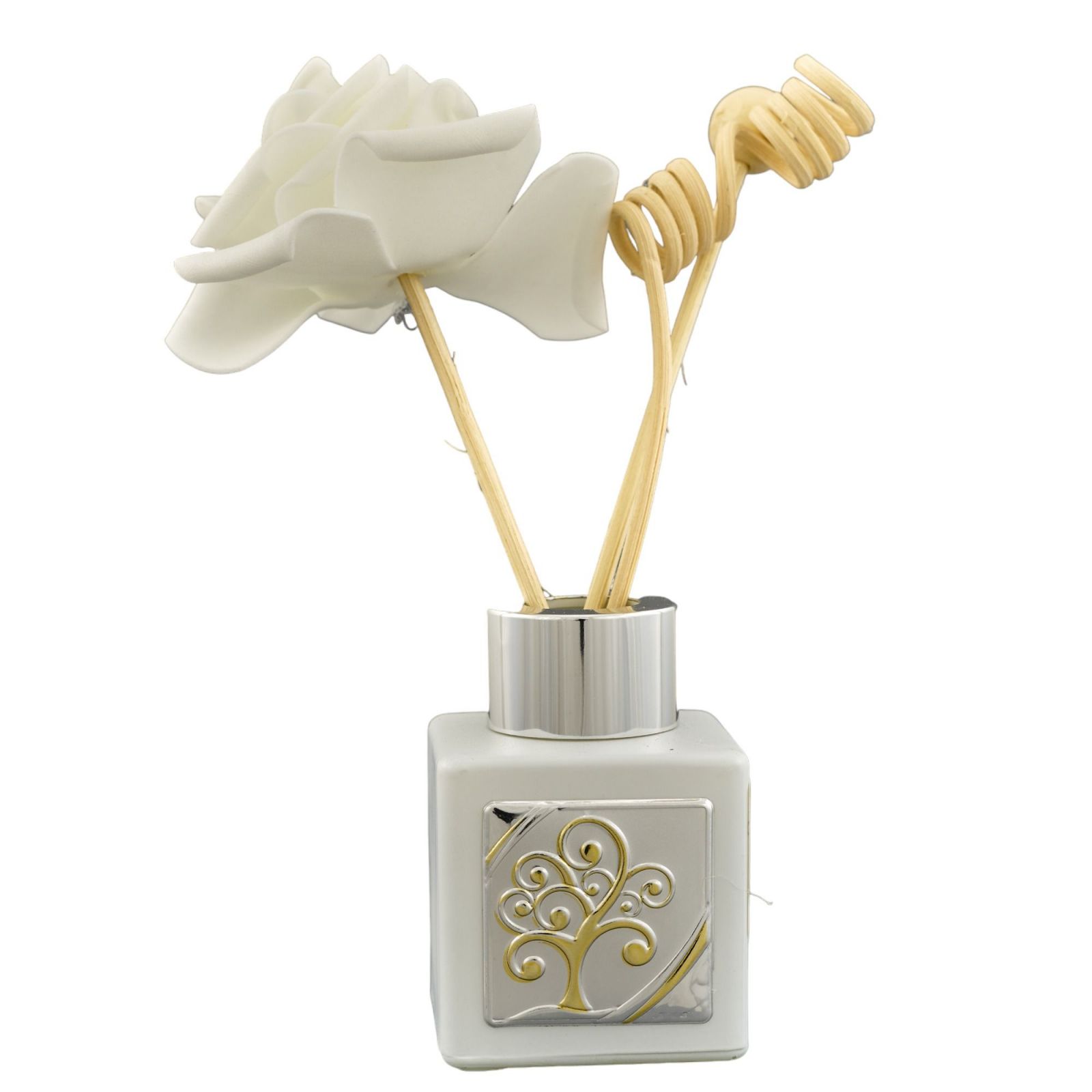 Un profumatore ambiente con tappo argento e piastrina con albero della vita color argento e foglie color oro. Un'idea regalo unica e originale, dallo stile elegante e dal sapore classico, che soddisferà ogni esigenza di bomboniere e oggettistica. Un dono utile ed economico che darà un tocco particolare agli eventi come il Battesimo, la Prima Comunione, la Santa Cresima, il Matrimonio, l'Anniversario o le Nozze.