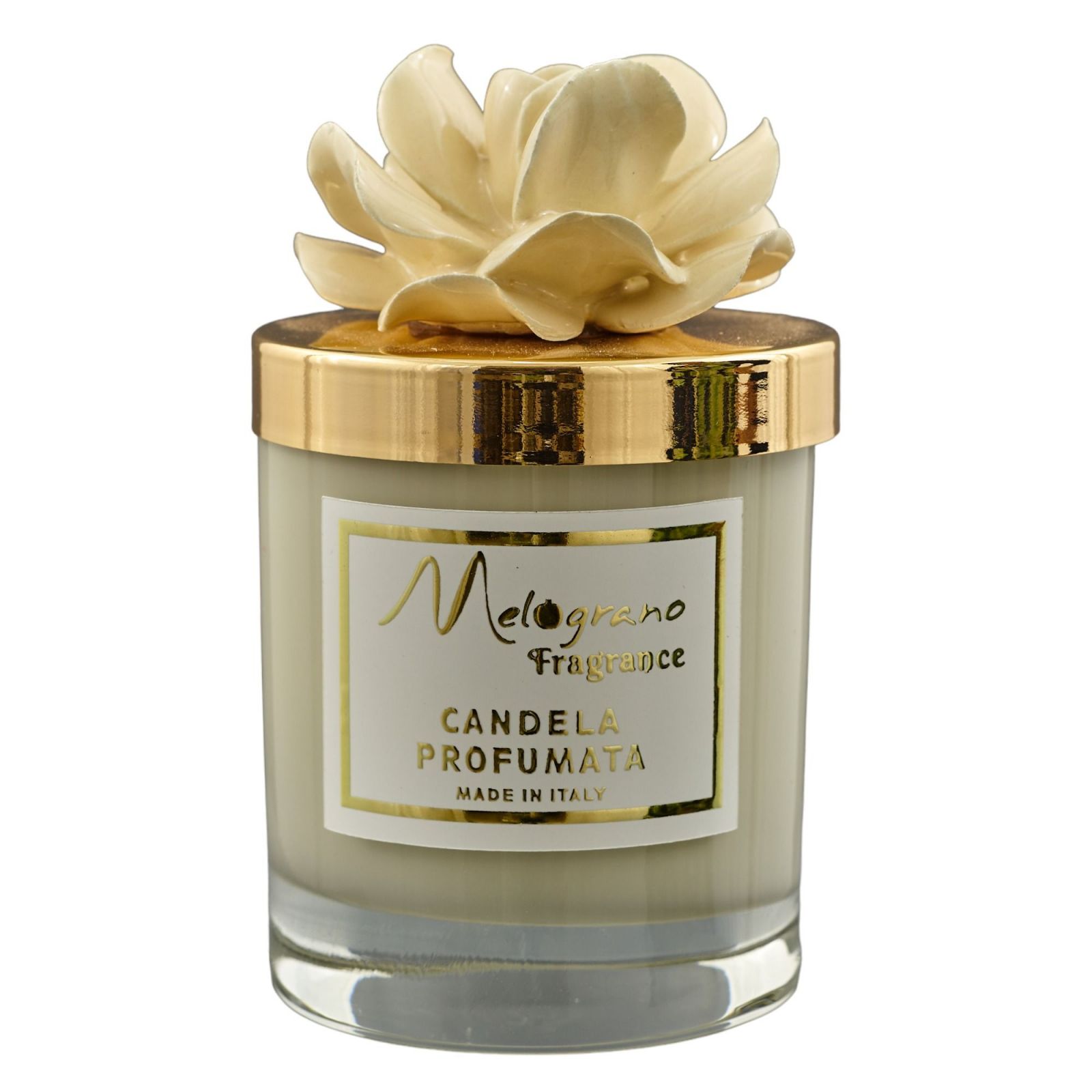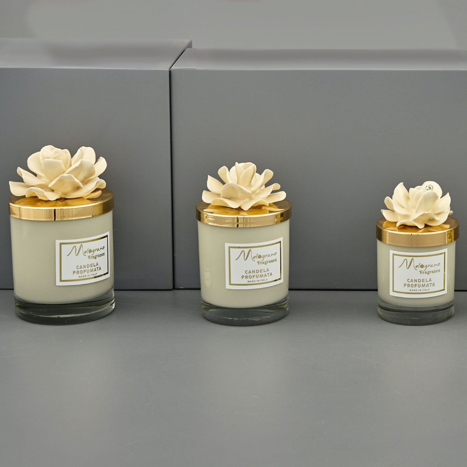Un portacandela con candela profumata e un tappo in oro con una rosa in capodimonte avorio: questo prodotto è l'ideale per le tue bomboniere per eventi speciali come Battesimo, Prima Comunione, Cresima, 18 anni, Matrimonio e Anniversario.