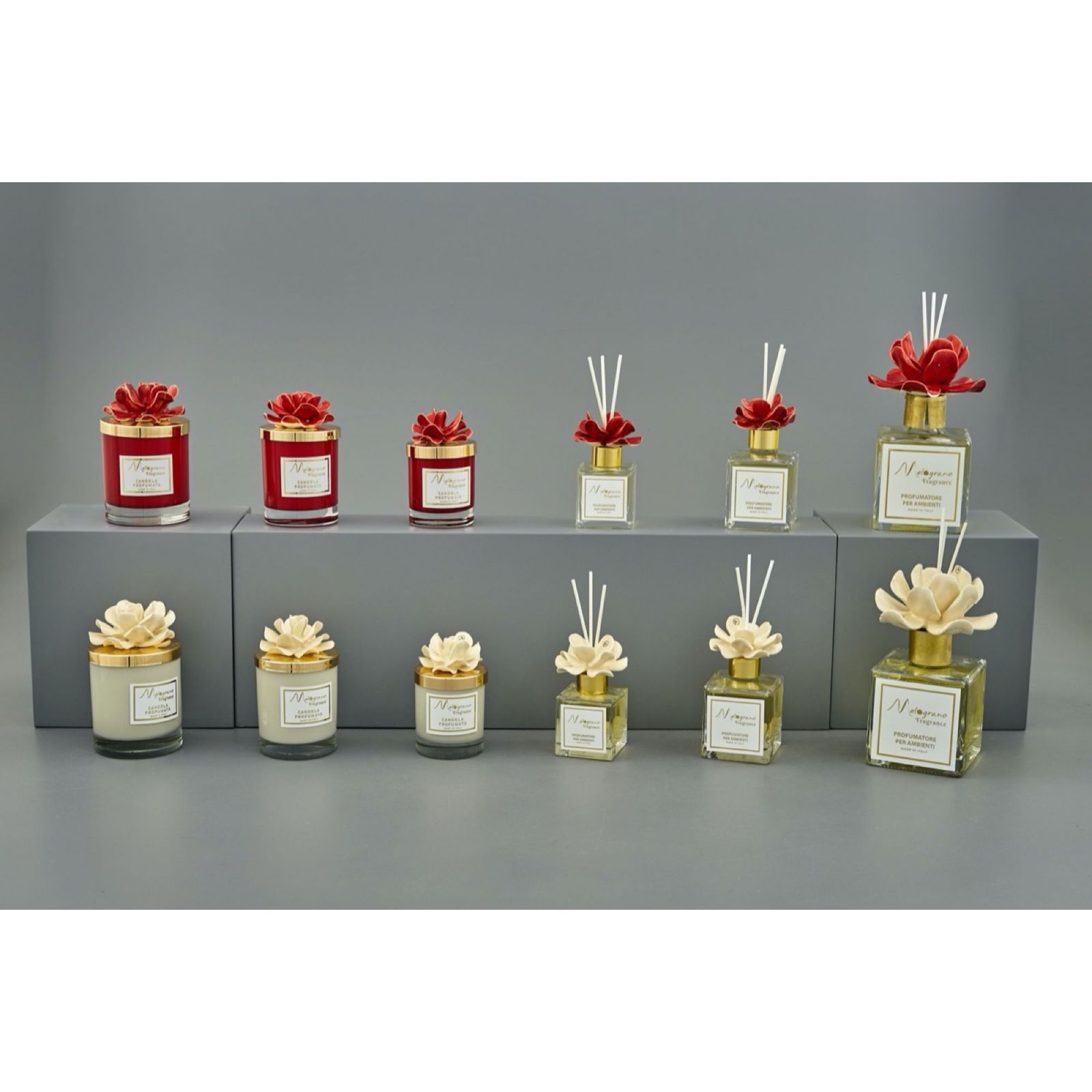 Questo portacandela è disponibile in tre diverse dimensioni: Standard h.12cm x d.7 cm; Grande h. 14cm x d. 8cm; Maxi h.14,5 cm x 8,8 d.. Il tappo e la rosa sono di colore oro e avorio. Il portacandela è realizzato con materiali di qualità: il vetro, la candela in cera di soia e la rosa in capodimonte.