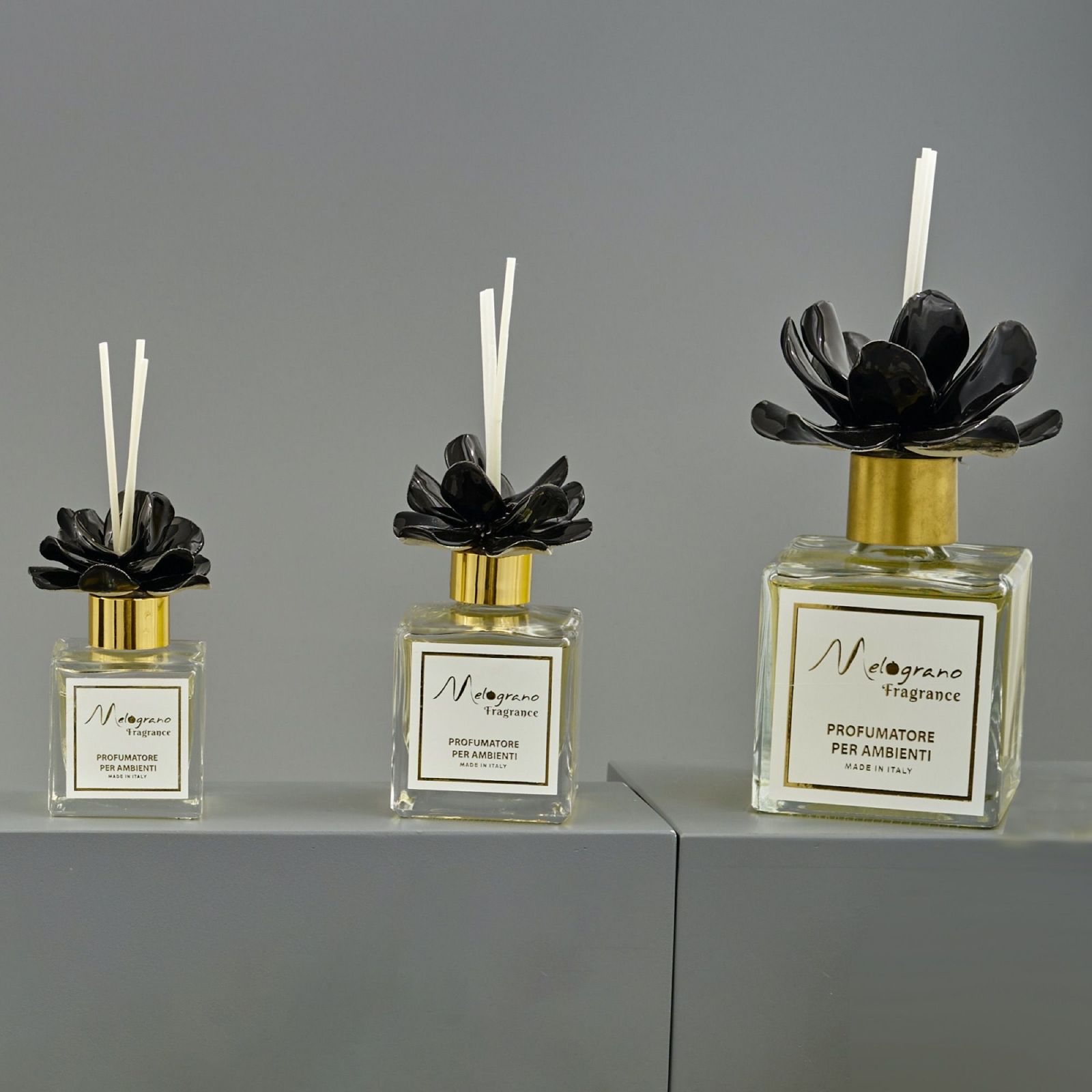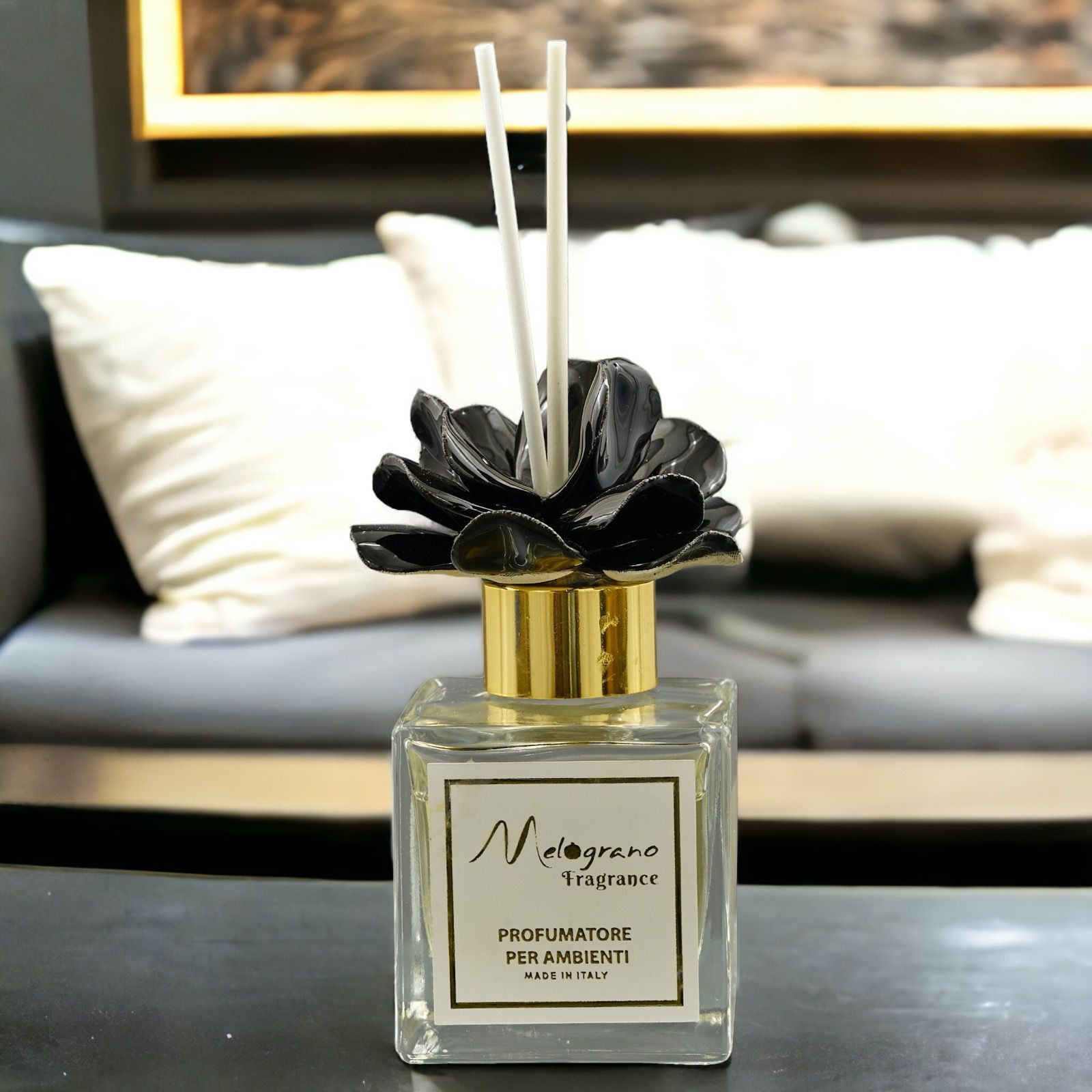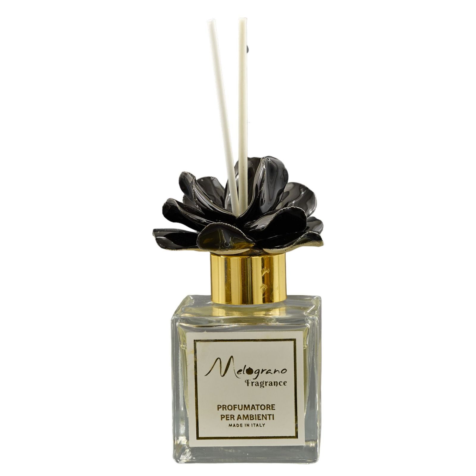Il colore della rosa nera e l'uso sapiente di materiali pregiati come vetro e capodimonte conferiscono un tocco di eleganza e originalità. Ogni profumatore è confezionato con cura in una scatola regalo inclusa nel prezzo ed è completto dalle bacchetter di essenza.