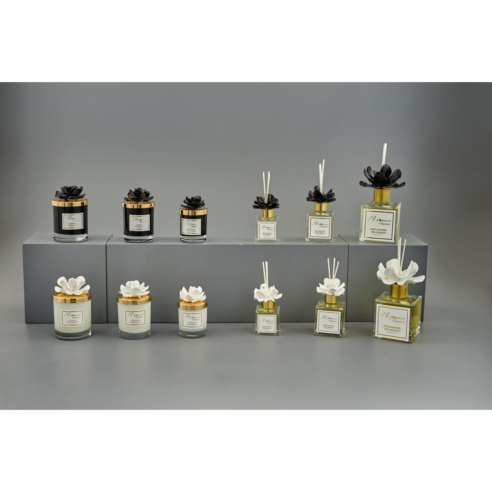 Disponibile in tre dimensioni: Standard (H.8X6X6CM, 100 ml), Grande (H.9,5X6X6CM, 200 ml), Maxi (H.15X9X9CM, 500 ml). Scegli la taglia che si adatta al tuo evento e lasciati avvolgere dalla sua fragranza avvolgente e inebriante.