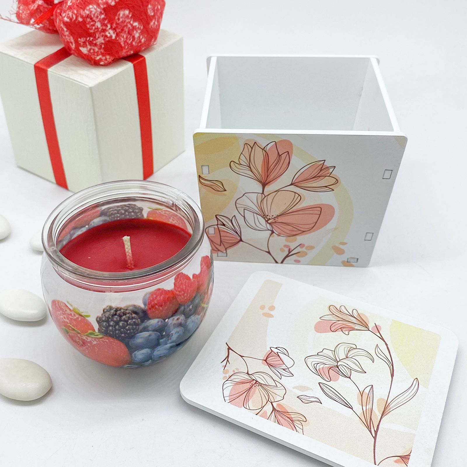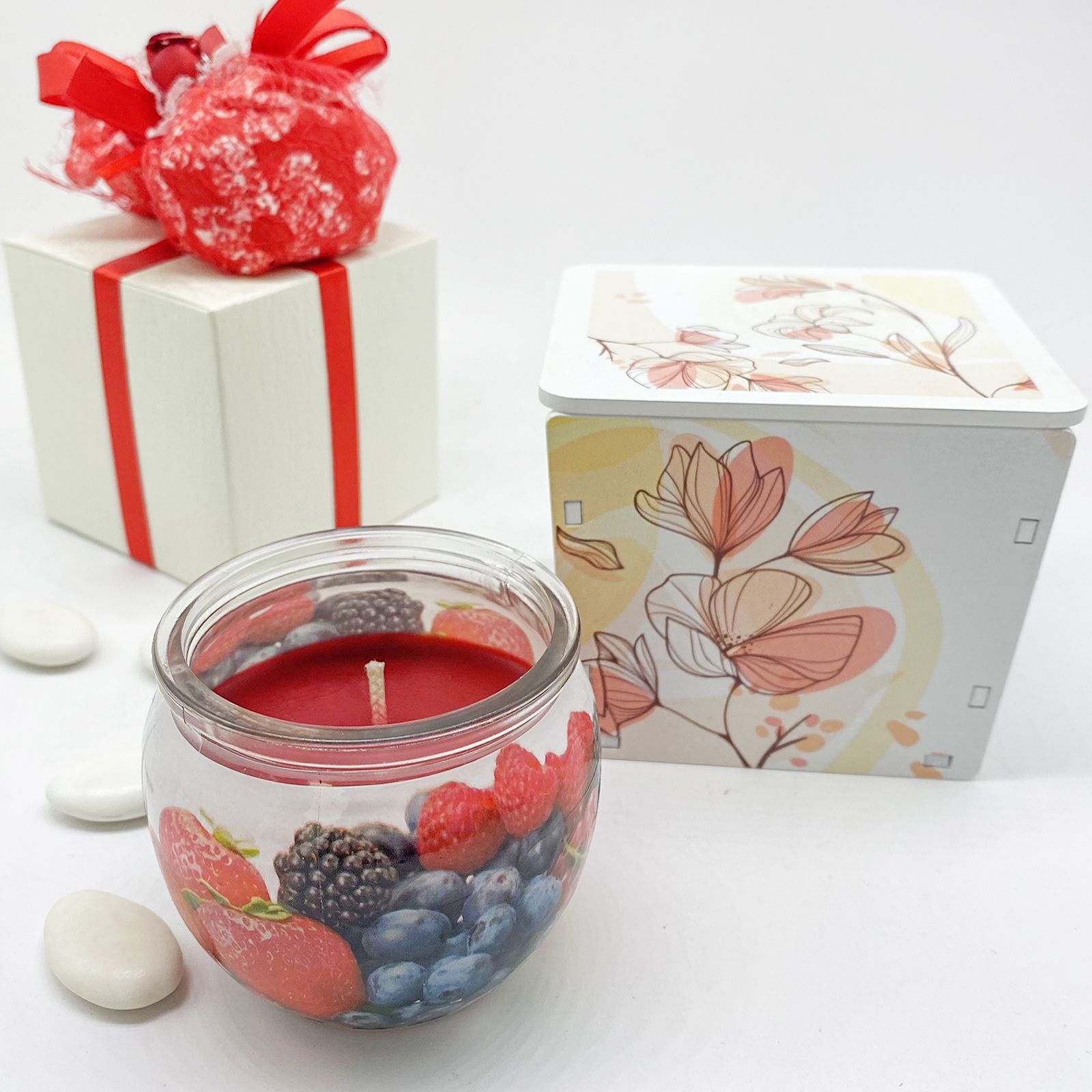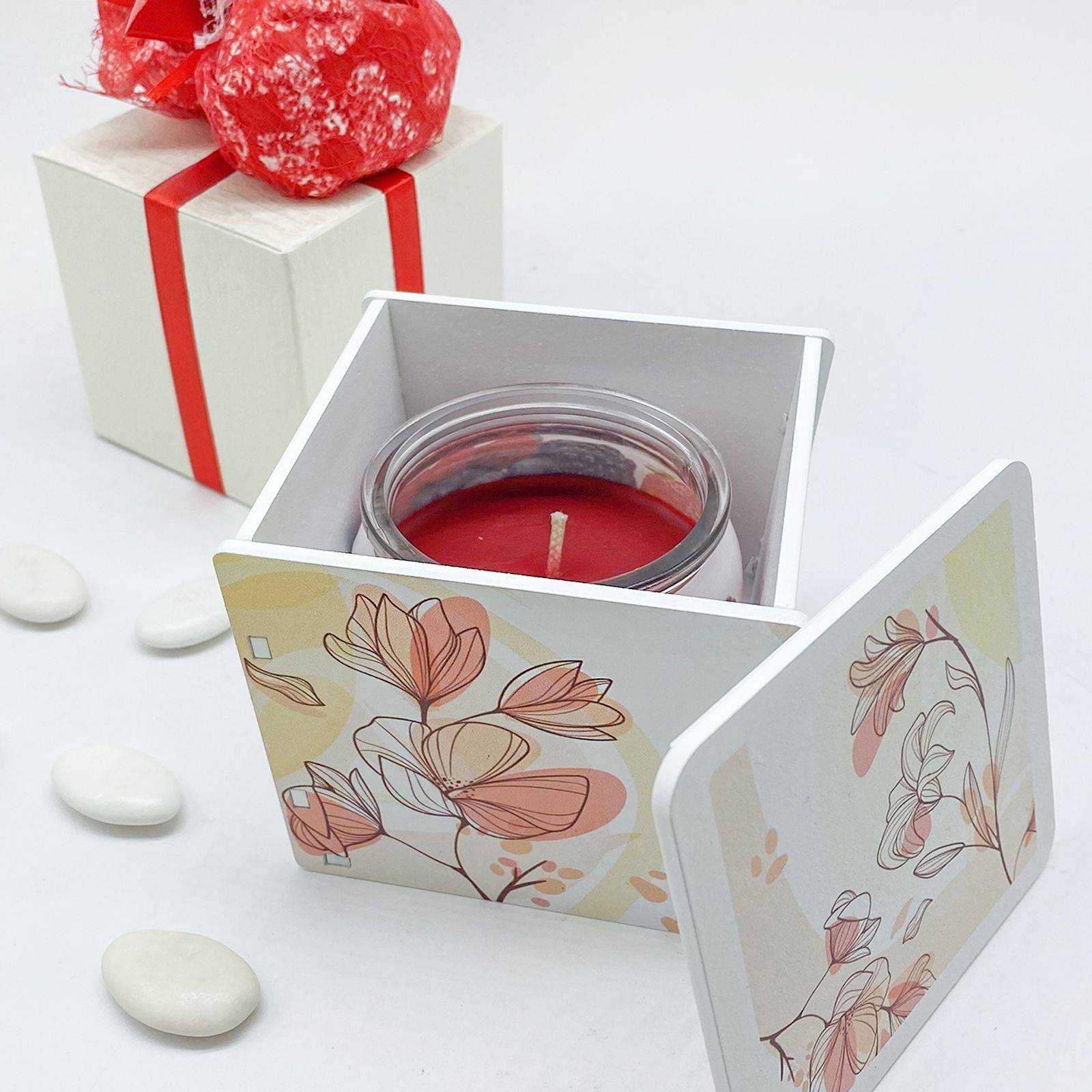 Sorprendi e ringrazia i tuoi ospiti con la nostra esclusiva Candela Profumata ai Frutti di Bosco, presentata con eleganza in un portacandela decorato con deliziosi fiori. Questo regalo raffinato è pensato per celebrare eventi indimenticabili come matrimoni, prime comunioni, cresime, anniversari e il raggiungimento dei 18 anni.