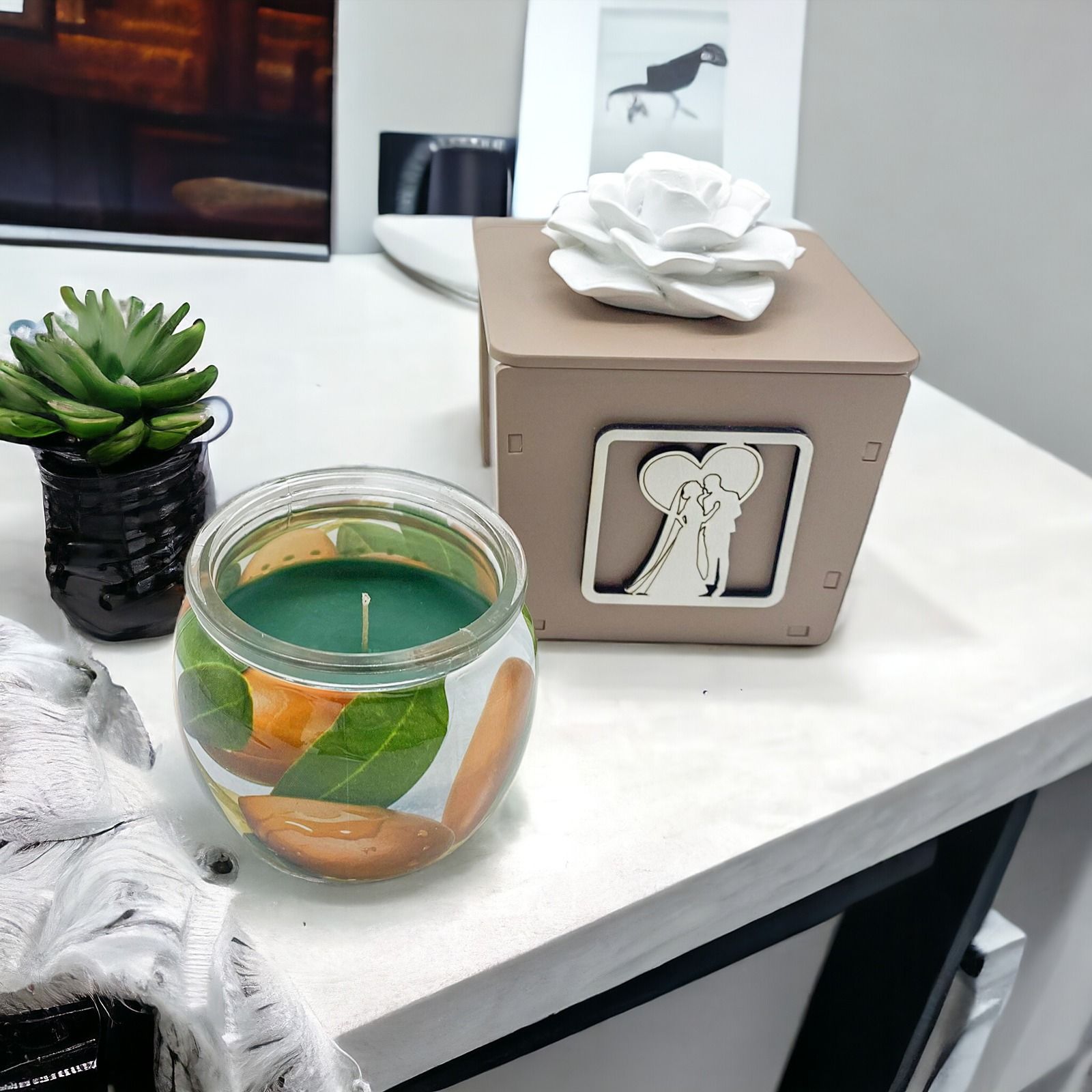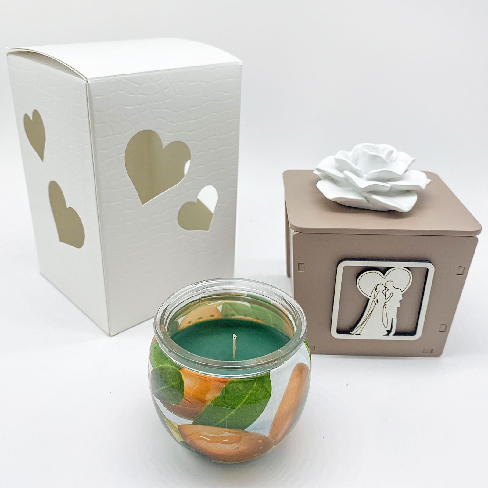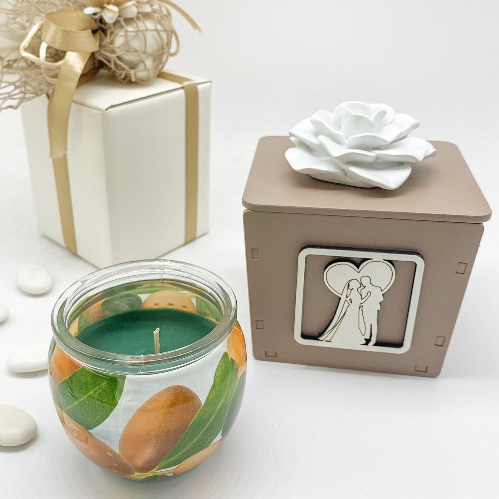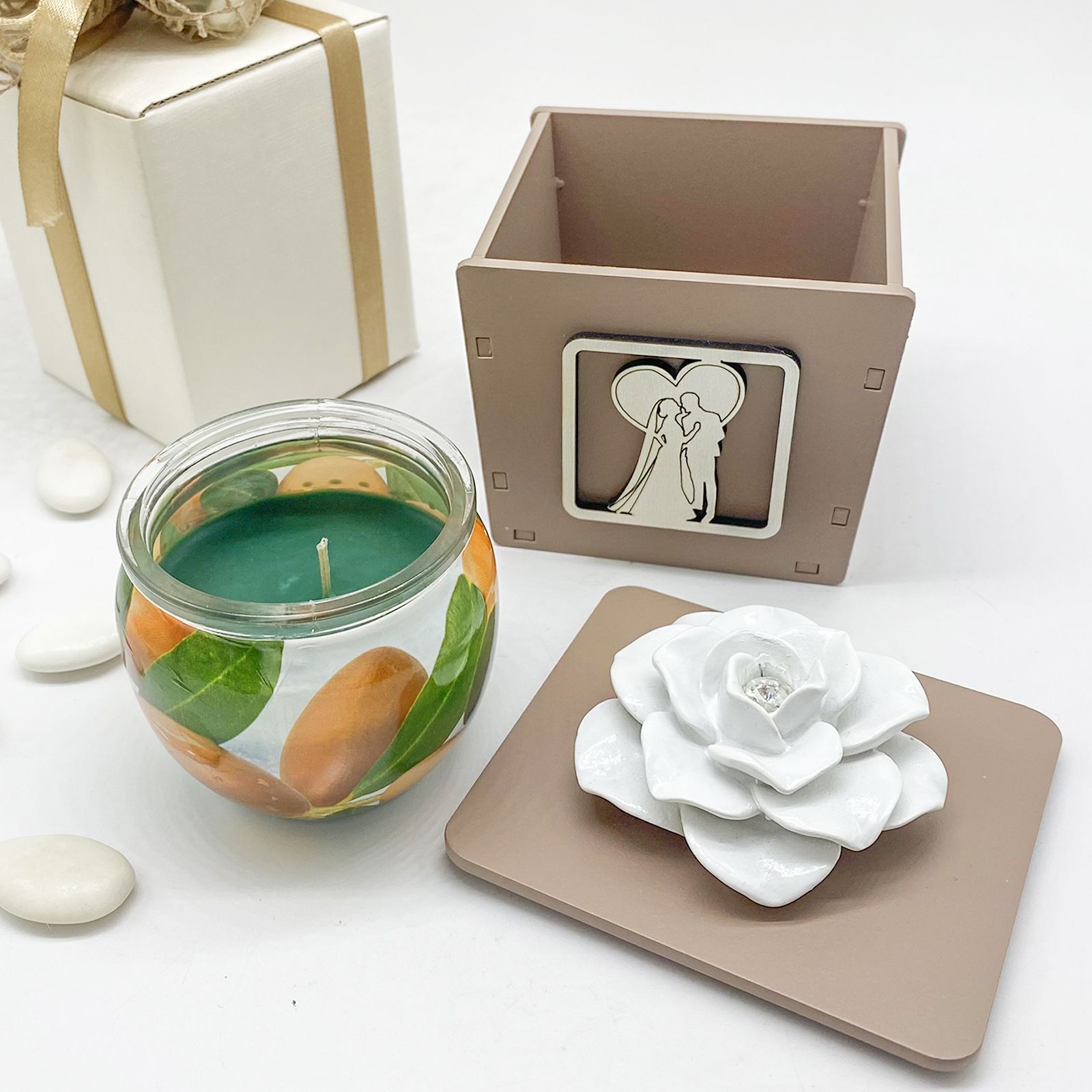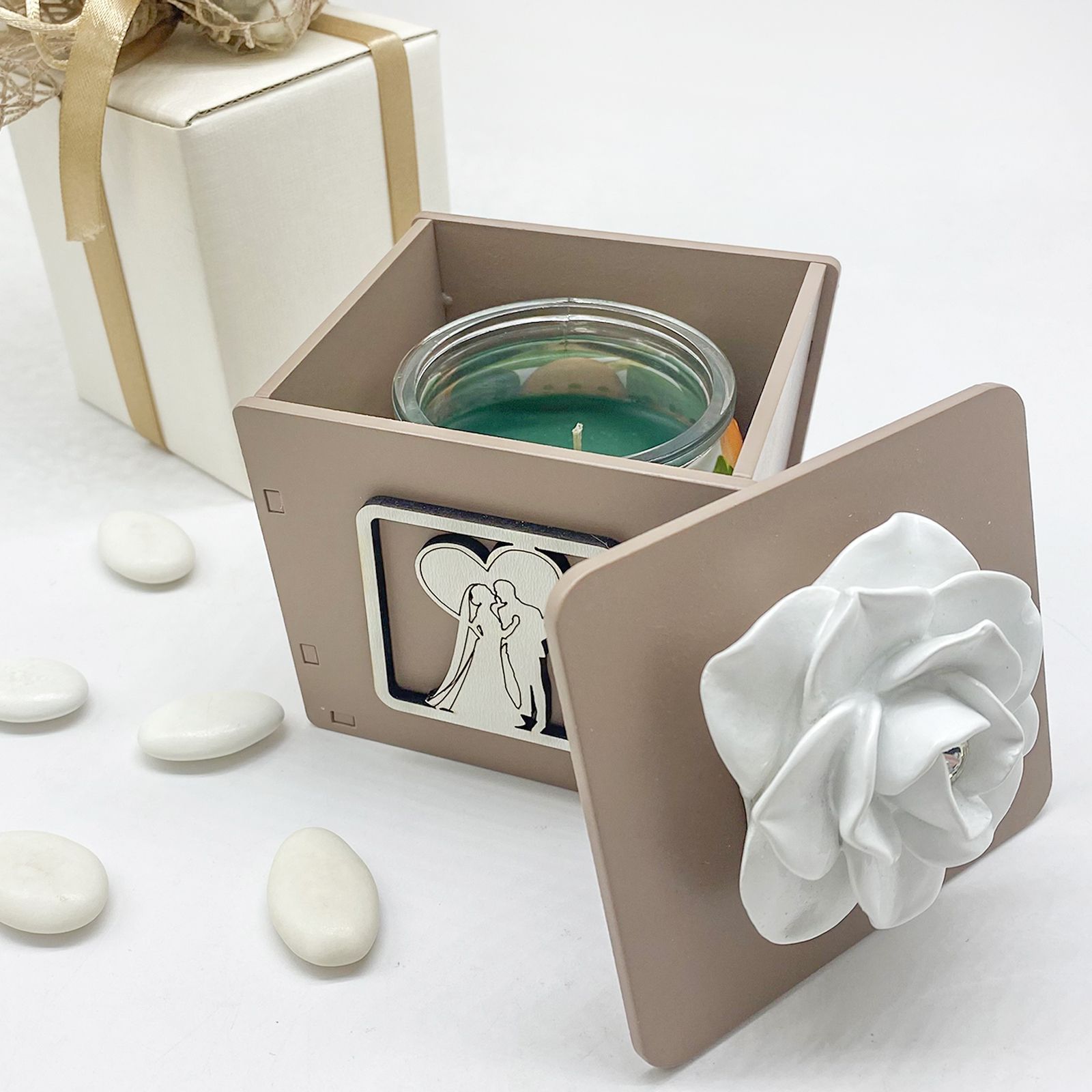 Regala una bomboniera unica ed elegante ai tuoi invitati. Questa candela profumata con portacandele in legno color tortora è decorata con sposi vestiti con abiti eleganti che si abbracciano racchiusi in un cuore. Il coperchio è decorato con una rosa in ceramica bianca con strass centrale. Un'idea originale ed elegante per i tuoi invitati.