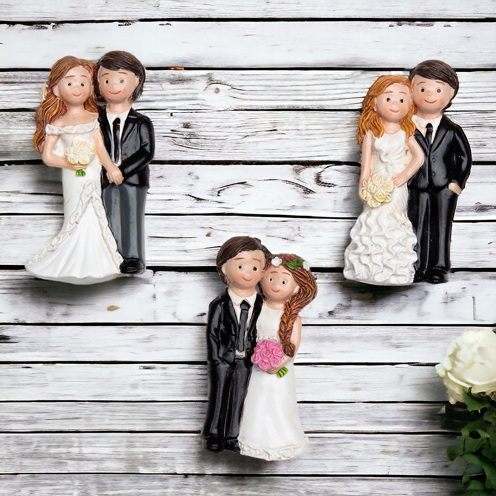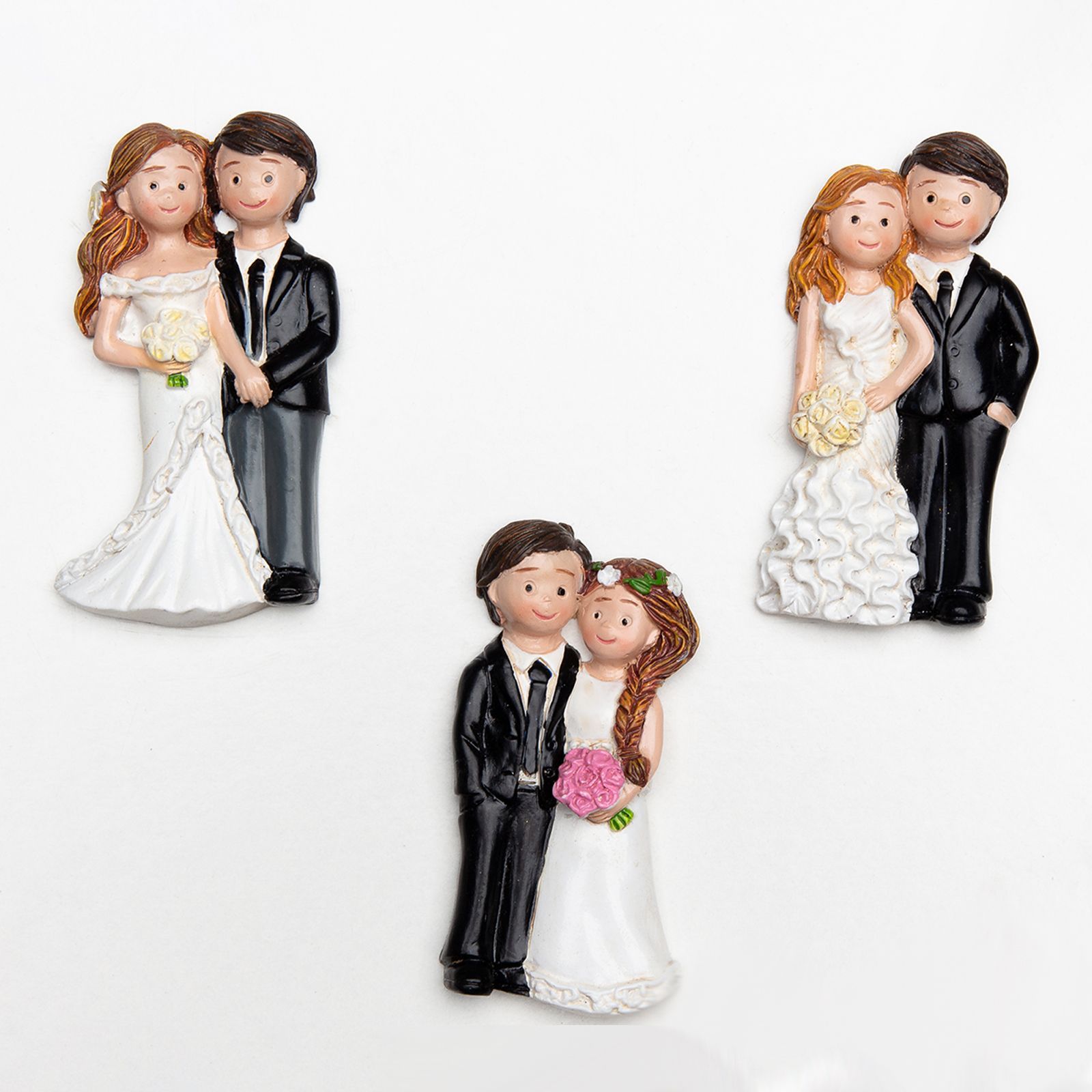 Ogni coppia di sposi è delicatamente rappresentata in abiti eleganti, creando un'atmosfera di raffinatezza e romanticismo. Le calamite sono un'idea regalo originale e utile, perfetta per completare la tua confettata nozze o come segnaposto raffinato.