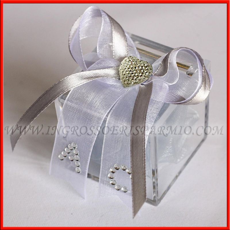 Scatole per confetti in plexiglass trasparente, confezionata a mano da laboratori specializzati ed arricchita con nastri in raso e tulle, sulla parte superiore della scatola. Al centro, è applicato un cuoricino argentato e lucente che impreziosisce l'intera composizione. Il dettaglio di maggior rilievo è rappresentato dalla stampa delle iniziali dei festeggiati realizzata con strass argentati sul nastro in tulle.