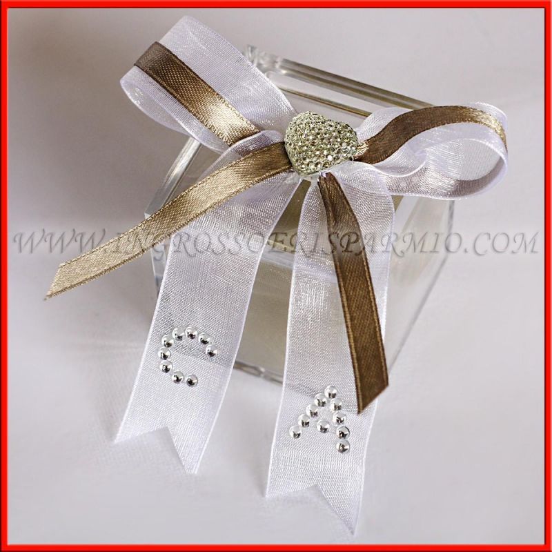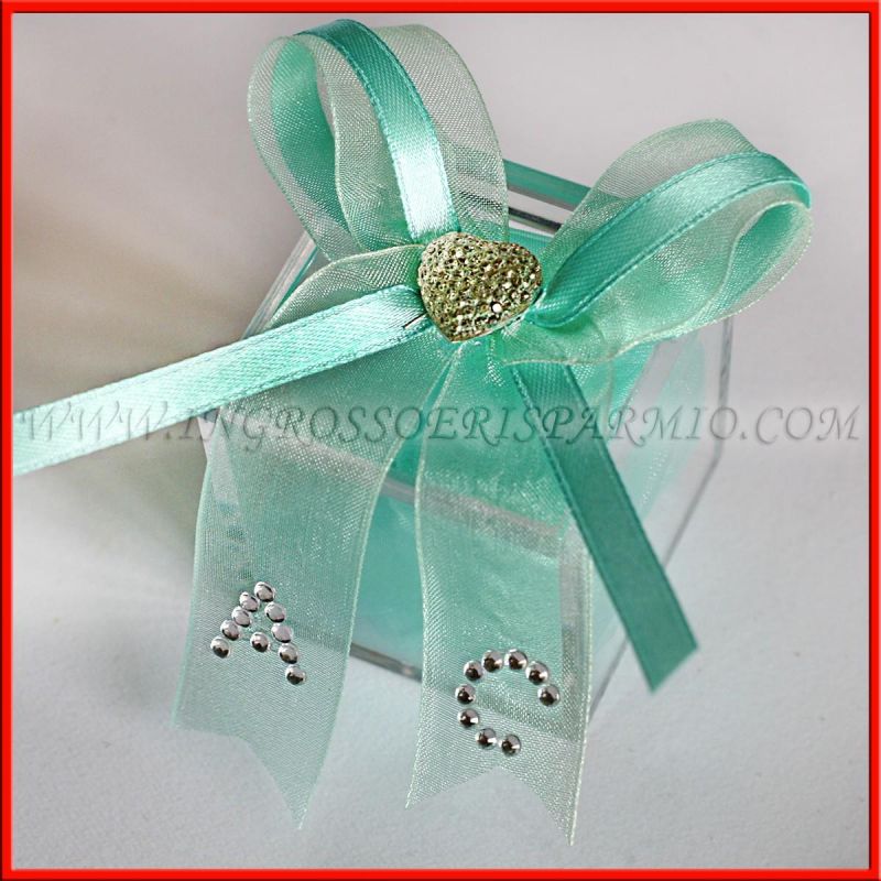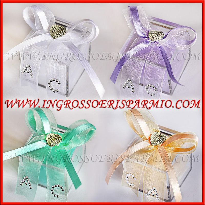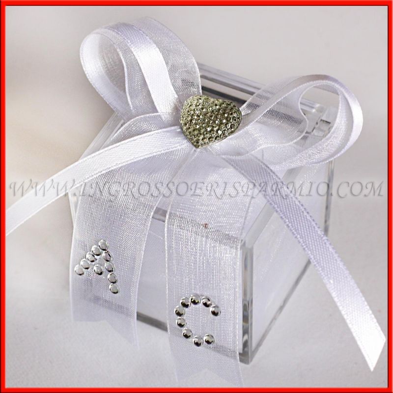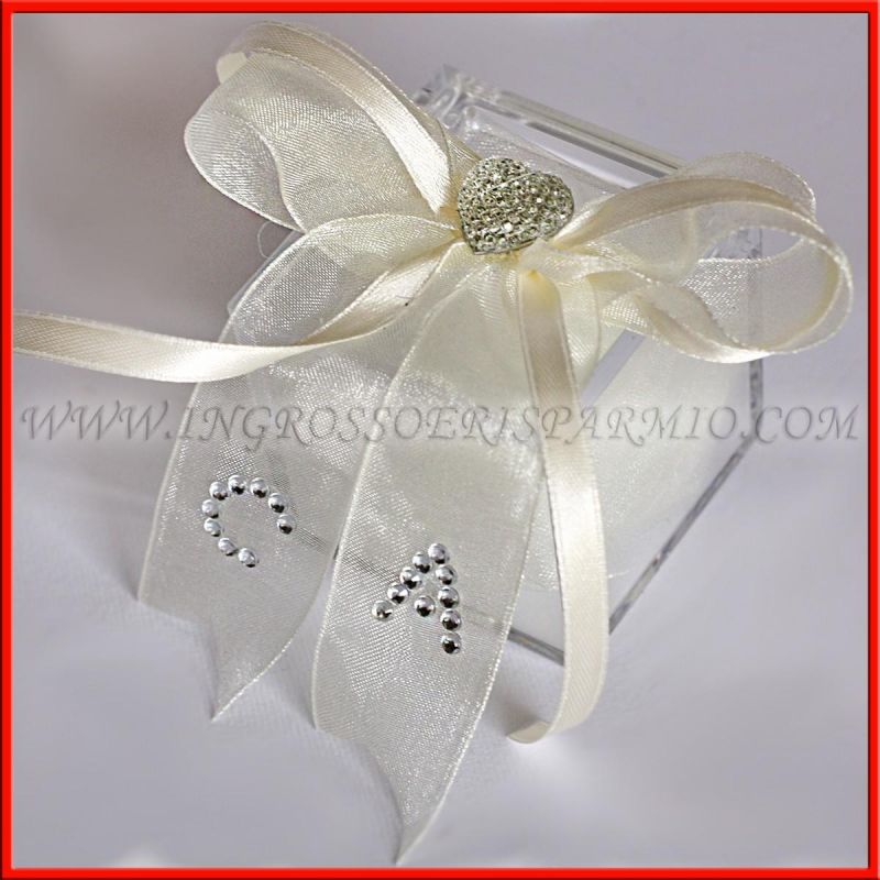 Scatole per confetti in plexiglass trasparente, confezionate a mano da esperti ed arricchiti da numerosi dettagli: una composizione a fiocco con nastri in raso e tulle, con al centro un'applicazione a forma di cuoricino. Sul nastro in tulle è possibile inserire le iniziali degli sposi, realizzate con dei piccoli strass argentati.