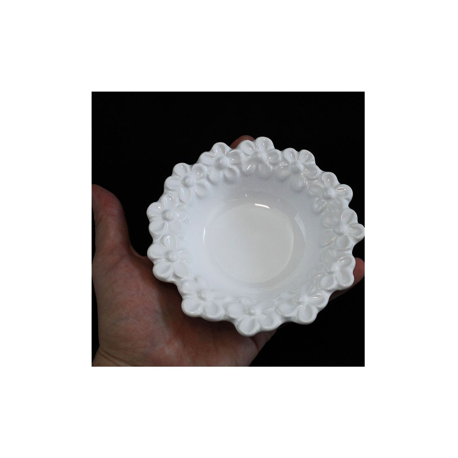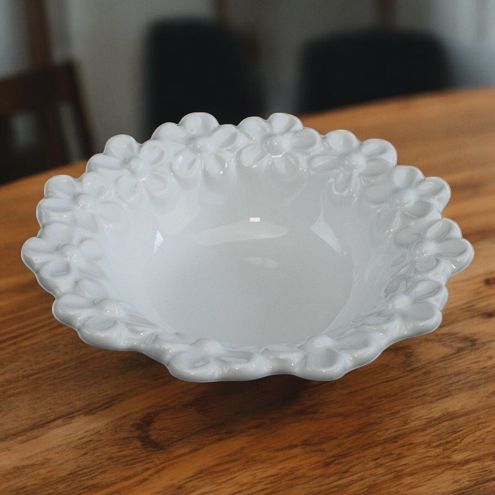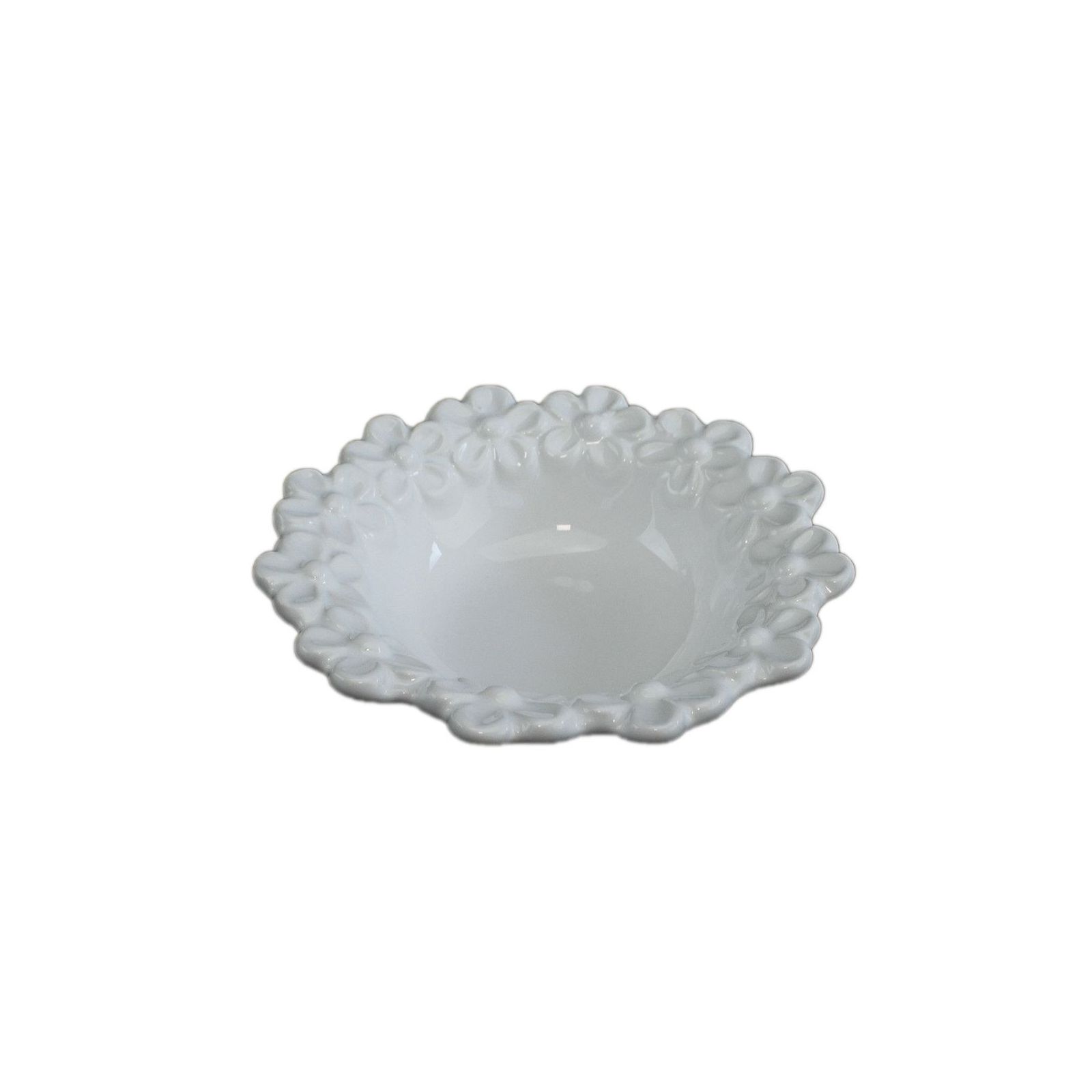 Scopri la nostra elegante bomboniera tonda in porcellana bianca con bordi di margherite in rilievo, ideale per comunioni, cresime, matrimoni e anniversari.