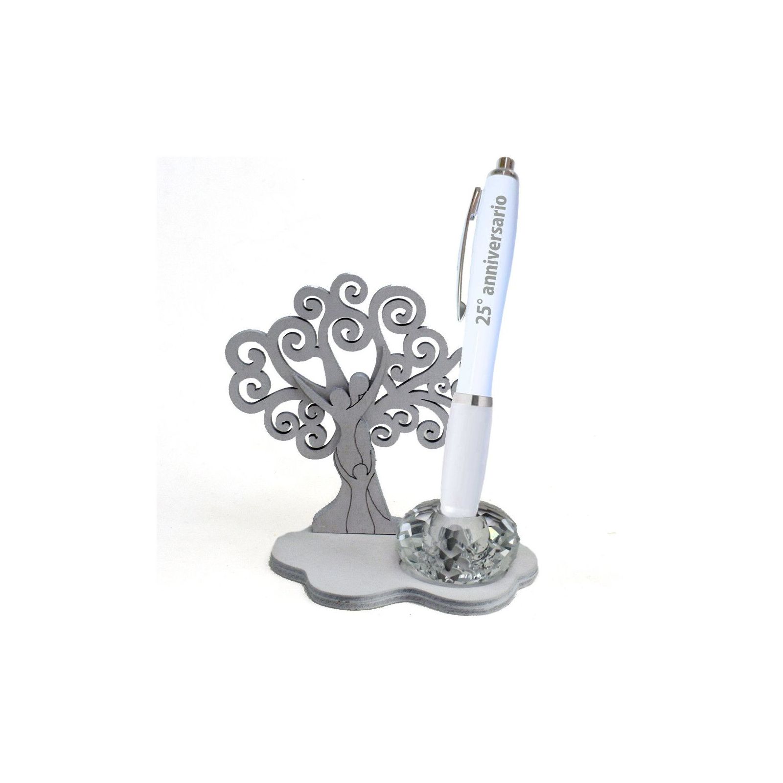 Festeggia il 25° anniversario con una bomboniera che unisce eleganza e simbolismo. La nostra base in legno con un delicato albero della vita raffigura una famiglia che si abbraccia, evocando amore e unità duraturi. Questo set include anche un portapenne in cristallo e una penna bianca con scritta color argento "25° anniversario", rendendolo un ricordo perfetto per i tuoi ospiti.