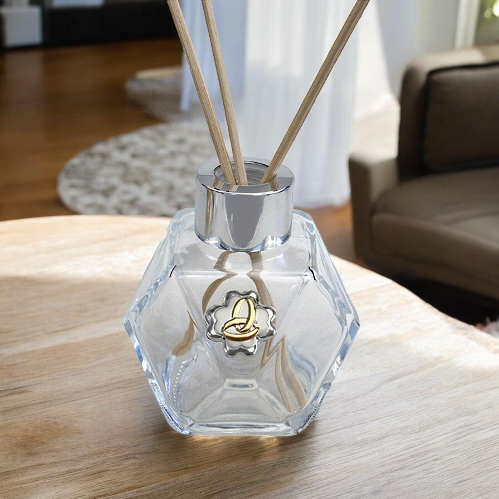Realizzato in vetro trasparente, questo profumatore è arricchito da una lamina a forma di quadrifoglio color argento, simbolo di buona fortuna, e da fedi color oro, che rappresentano l'amore eterno. Con dimensioni di circa 9 cm di altezza e 4 cm di base, è perfetto per qualsiasi superficie.
