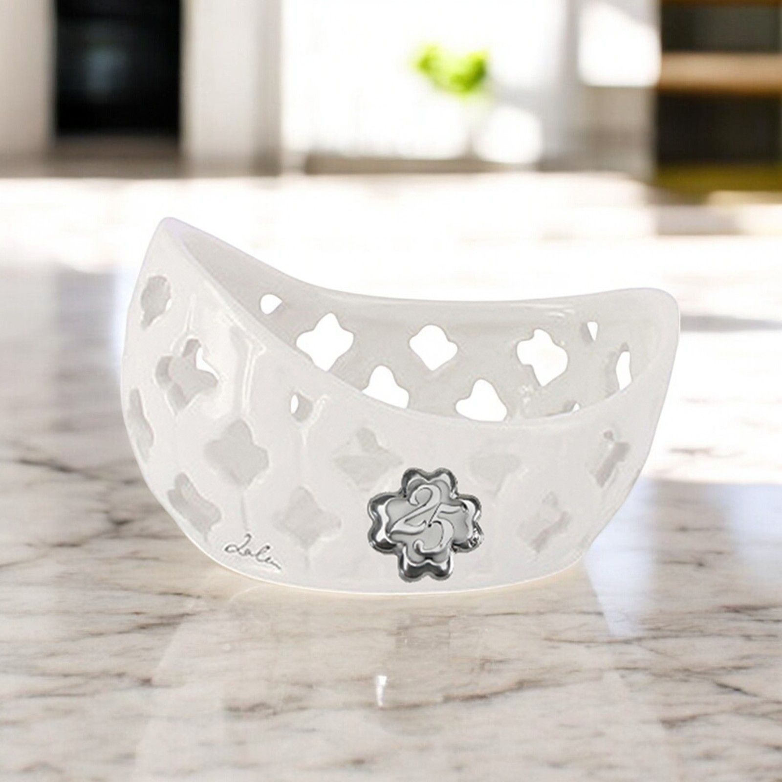 Stai cercando un modo unico e significativo per sorprendere i tuoi ospiti in occasione del compleanno o dell'anniversario di una persona speciale? Questa bomboniera è l'idea particolare e originale che fa per te. Realizzata in ceramica bianca, ha una dimensione di circa 8 x 6 cm e presenta una lamina a forma di quadrifoglio con il numero 25, simbolo di fortuna e prosperità.