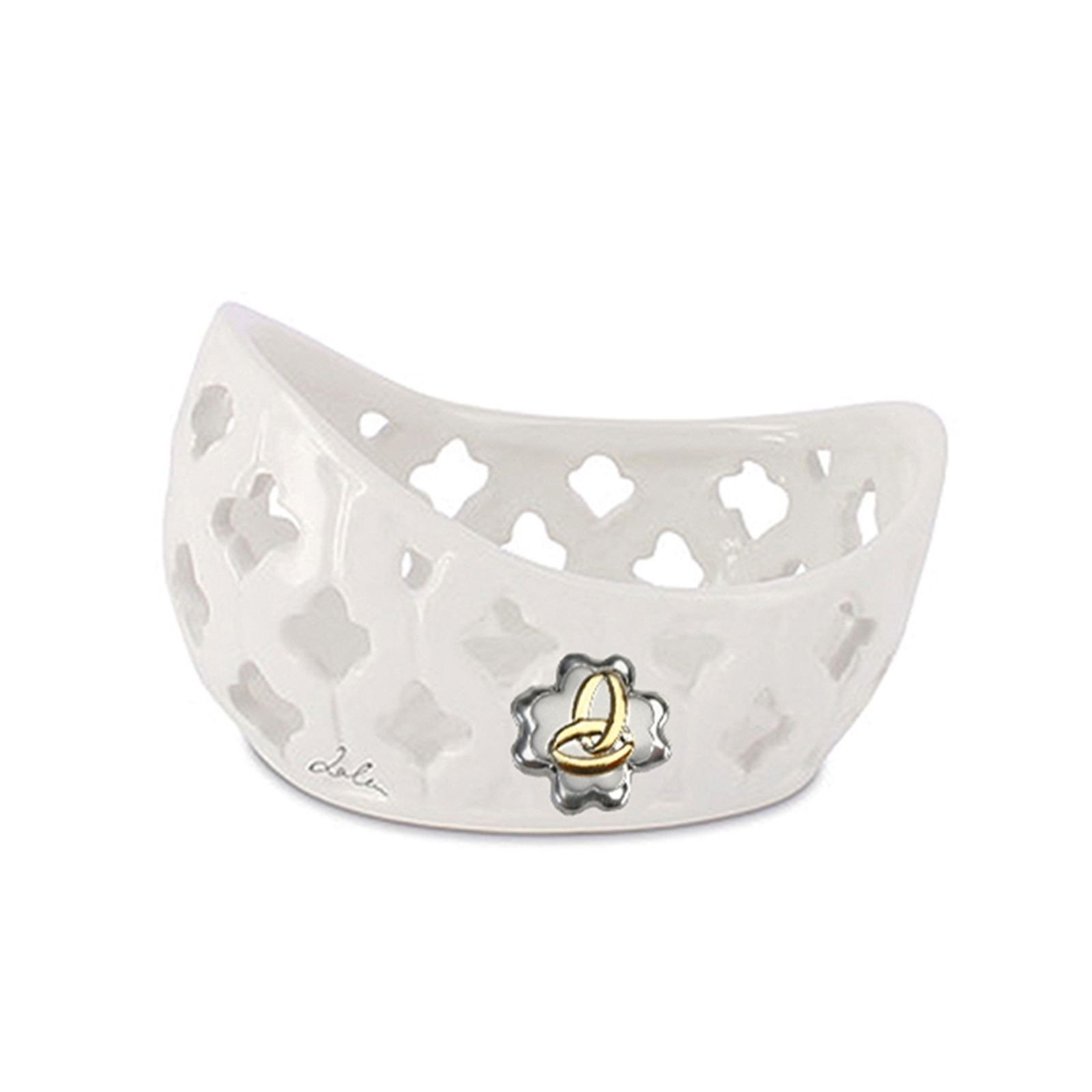 Scopri un'elegante e raffinata bomboniera: uno svuotatasche in ceramica bianca, impreziosito da una lamina a forma di quadrifoglio con fedi. Con dimensioni di circa 8 x 6 cm, è perfetto anche per essere utilizzato come portacandela traforato, aggiungendo un tocco di stile a qualsiasi ambiente.
