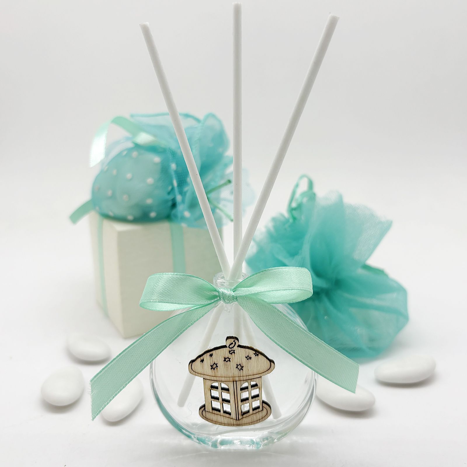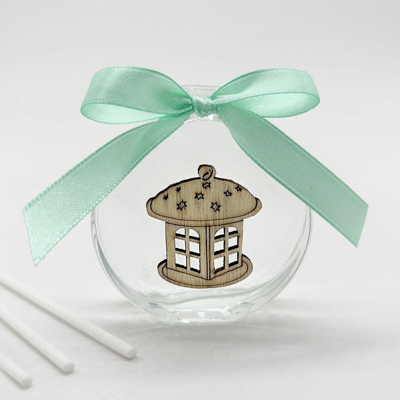 Le dimensioni della bomboniera sono di circa 6.5 x 6 cm, mentre l'applicazione lanterna misura circa h 3.5 x 3 cm. Questo profumatore ambiente è un oggetto elegante e raffinato che si adatta perfettamente a qualsiasi tipo di arredamento.
