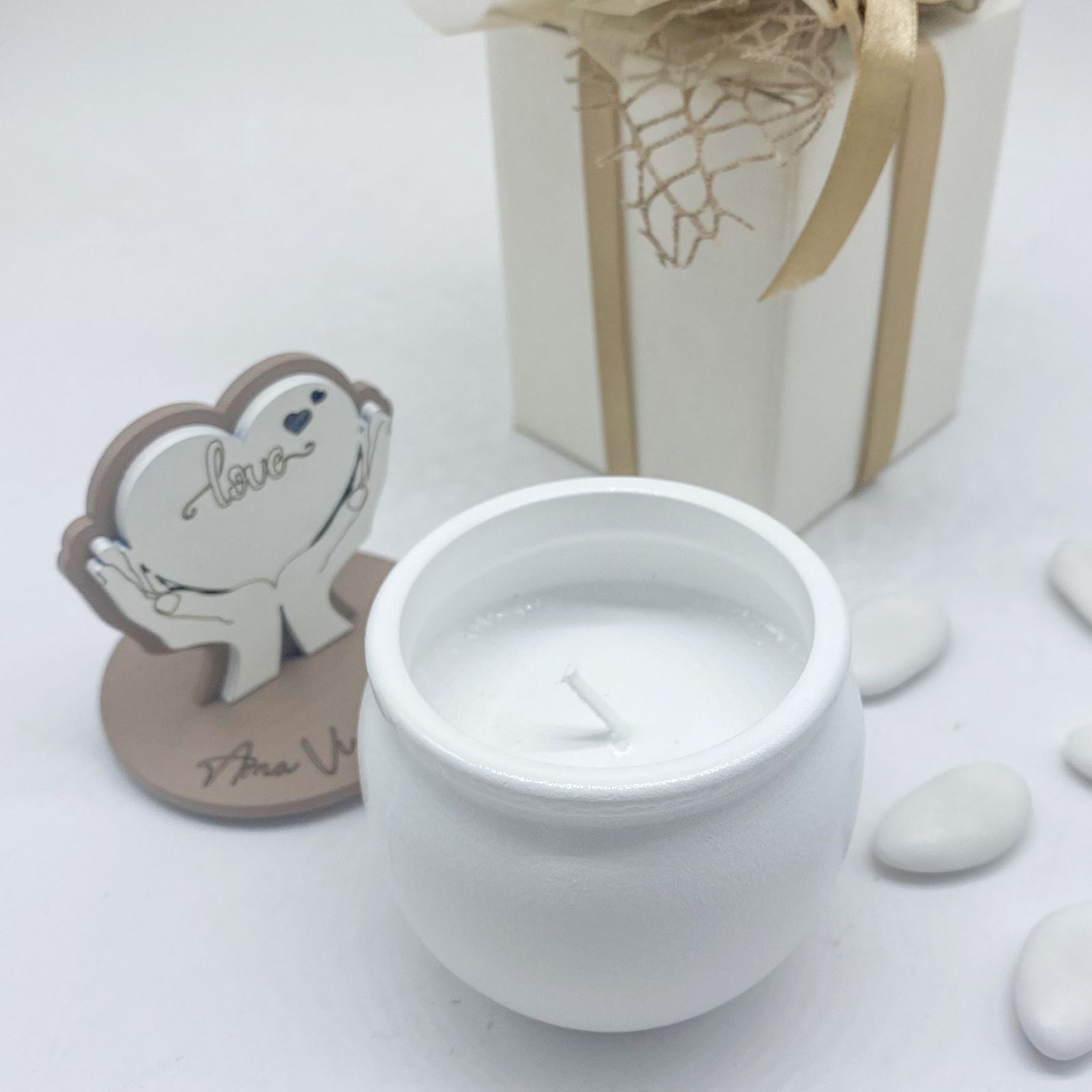 Questa bomboniera completa è l'idea perfetta per chi cerca una combinazione di utilità e bellezza, con una candela profumata che lascia una traccia olfattiva indimenticabile. È una scelta economica ma particolare, adatta a chi desidera sorprendere con un dono di classe.