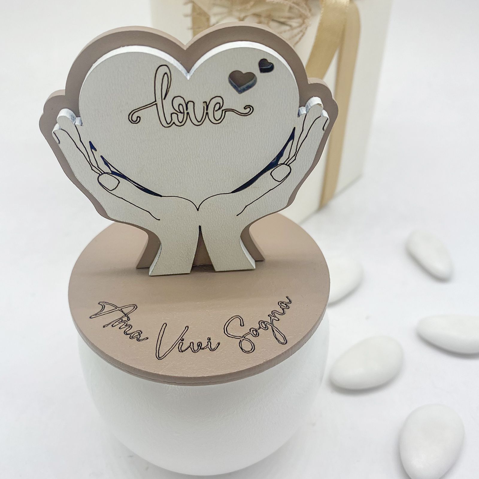 La nostra candela profumata con coperchio inciso con le parole "Ama Vivi Sogna" è una bomboniera originale e dal profondo significato, perfetta per matrimoni, anniversari e promesse. L'applicazione in legno con un cuore e la scritta "Love" sostenuta da delle mani simboleggia amore, cura e unione, rendendo questo oggetto un ricordo speciale per i tuoi ospiti.