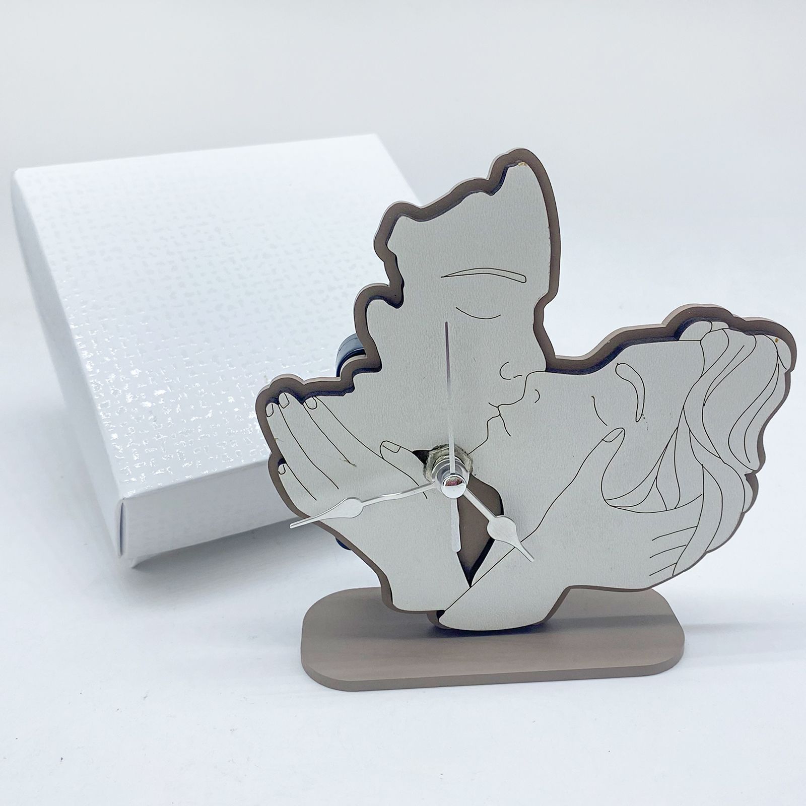 Proponiamo una bomboniera perfetta per matrimoni e anniversari: un orologio dalla forma unica e romantica che raffigura una coppia di innamorati che si baciano. Con le sue dimensioni di 12 x 13 cm, questo elegante oggetto in legno aggiunge un tocco raffinato a qualsiasi ambiente.