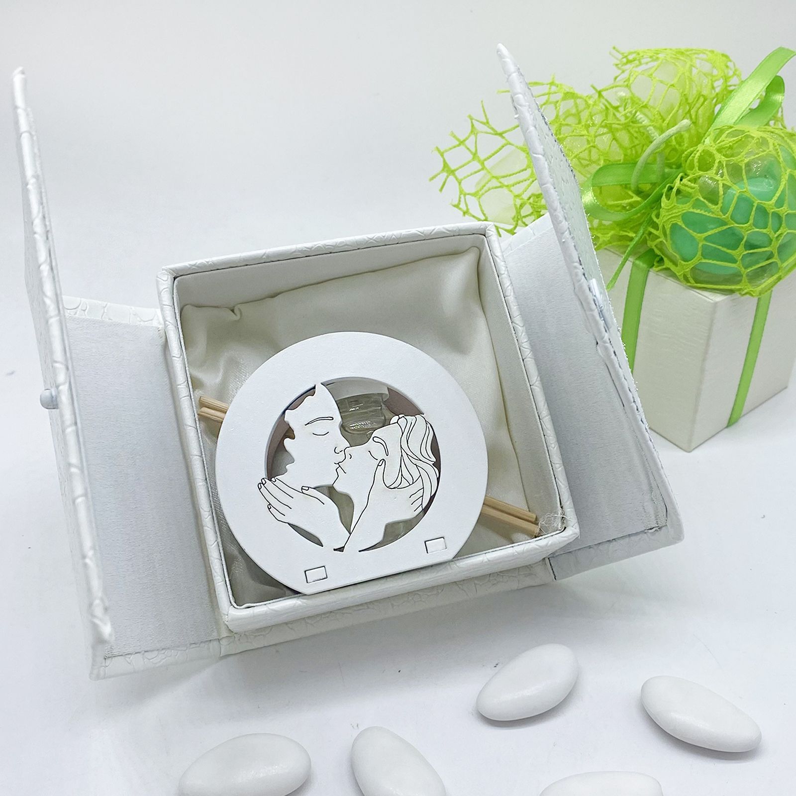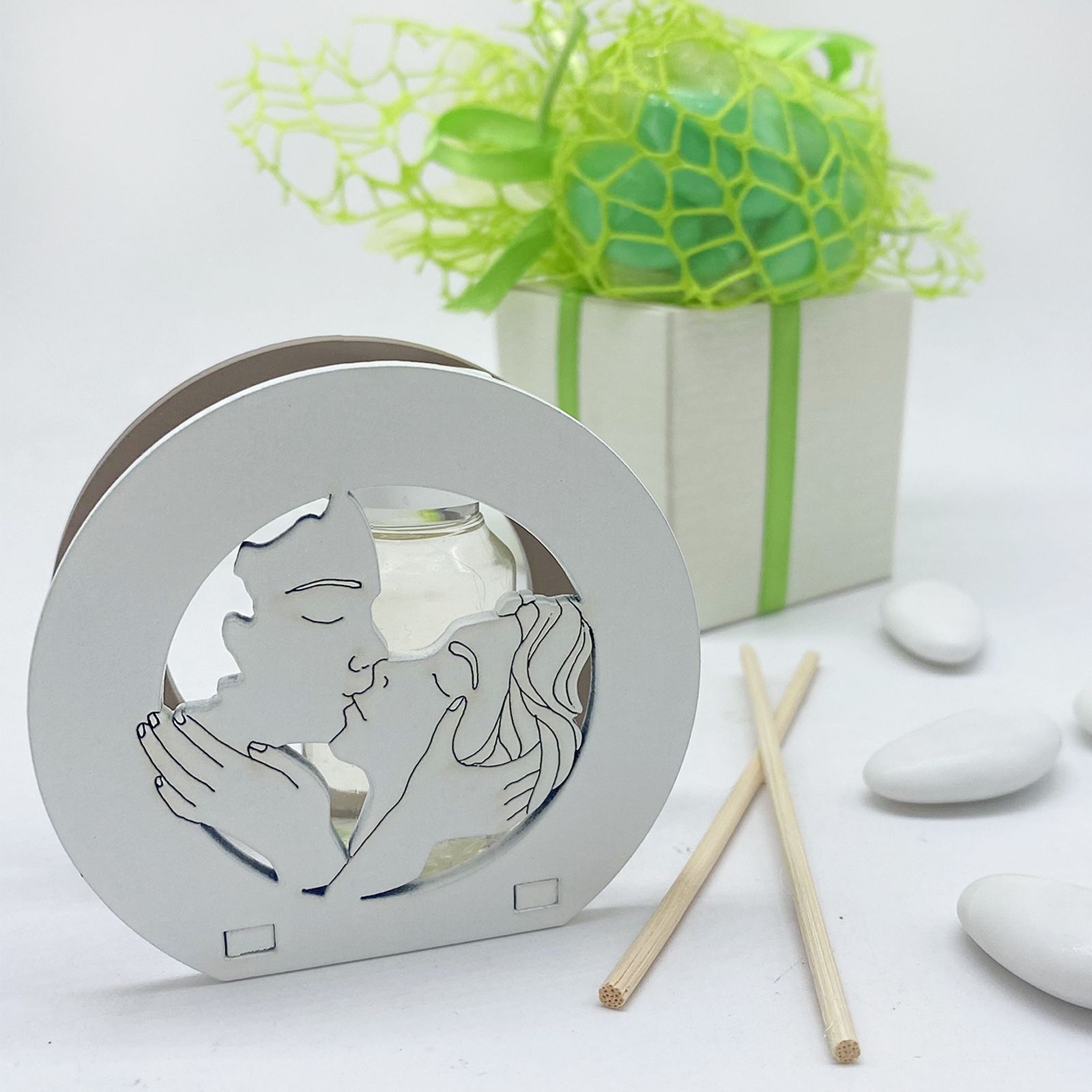 Optare per questa bomboniera significa offrire un dono che combina eleganza e utilità. L'immagine traforata dei due ragazzi abbracciati e baciati trasmette un messaggio di amore e affetto, rendendo questo mini profumatore un omaggio significativo e apprezzato. È il modo ideale per creare ricordi duraturi dei vostri eventi speciali.
