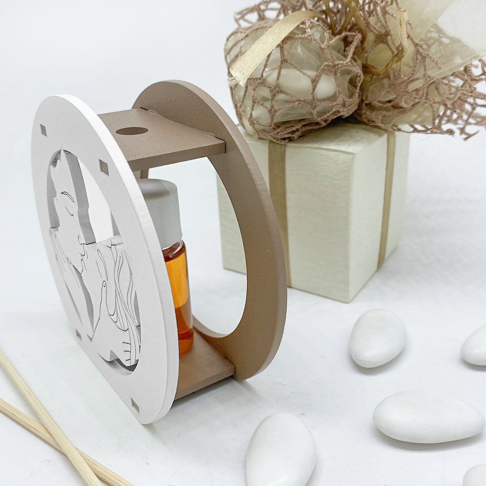 Il profumatore con l'immagine traforata di due ragazzi abbracciati rappresenta una scelta particolarmente elegante per celebrare eventi speciali come matrimoni e anniversari. Questo delicato oggetto, è disponibile in due dimensioni, Standard: 6 x 7 cm circa; Grande: 10 x 9 cm circa, è realizzato in legno di alta qualità e si distingue per il suo design originale e romantico.