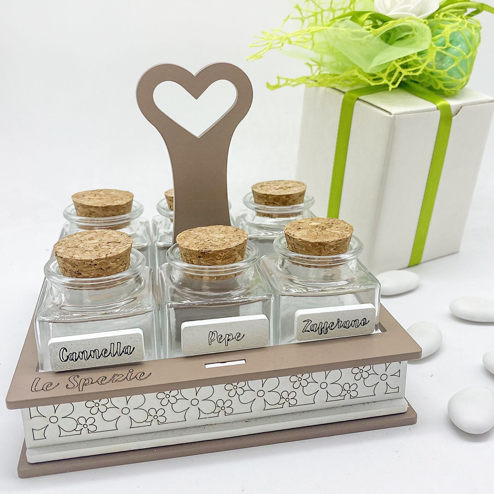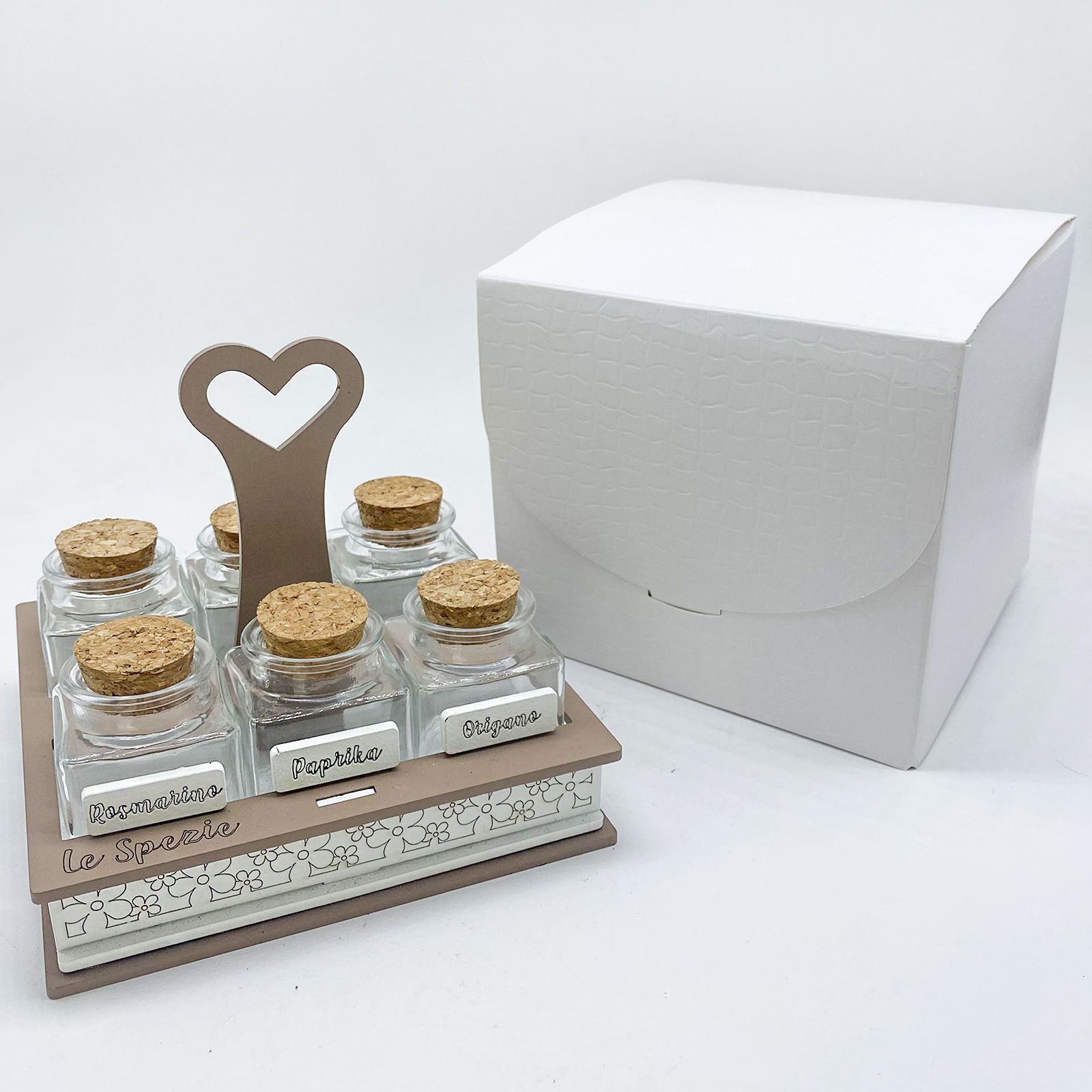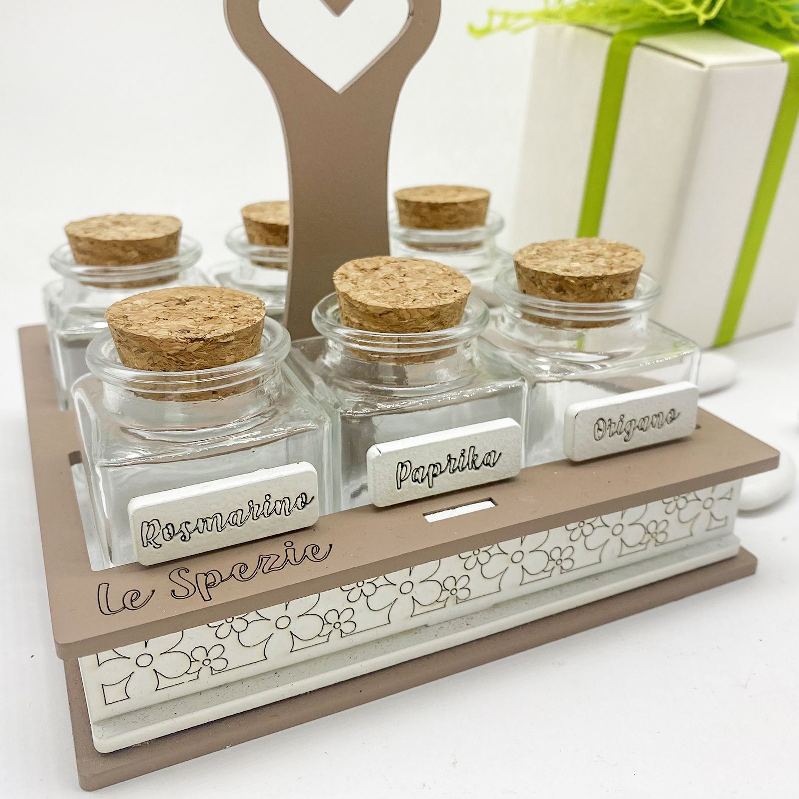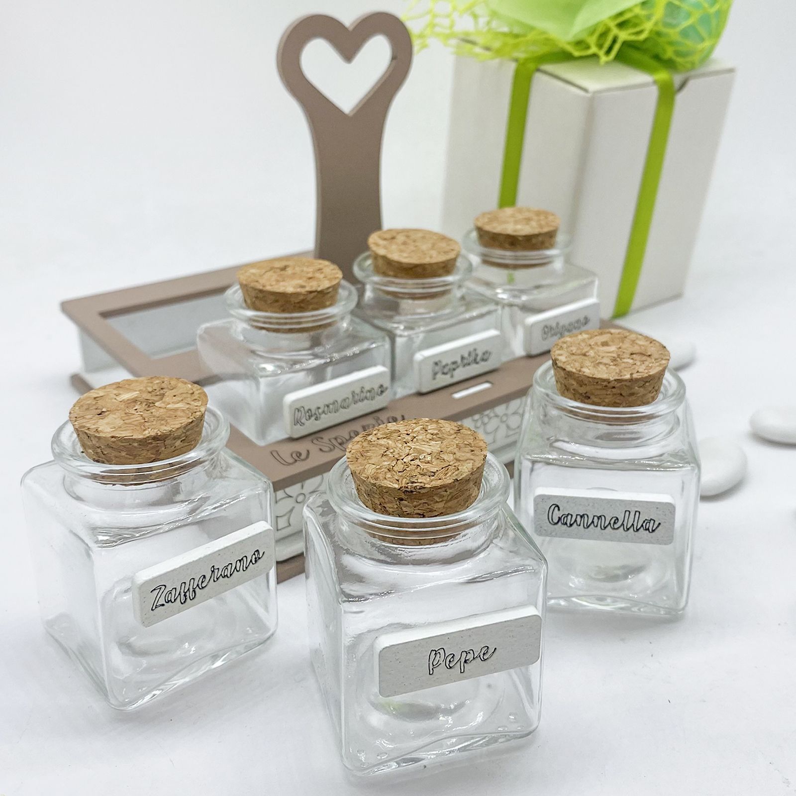 Stai cercando un modo unico per sorprendere i tuoi ospiti? Questo elegante portaspezie con manico a forma di cuore è la scelta perfetta! Con 6 barattolini in vetro e tappo in sughero, ognuno con una targhetta per spezie zafferano, origano, rosmarino, paprika, cannella e pepe, aggiungerà un tocco di raffinatezza al tuo evento.