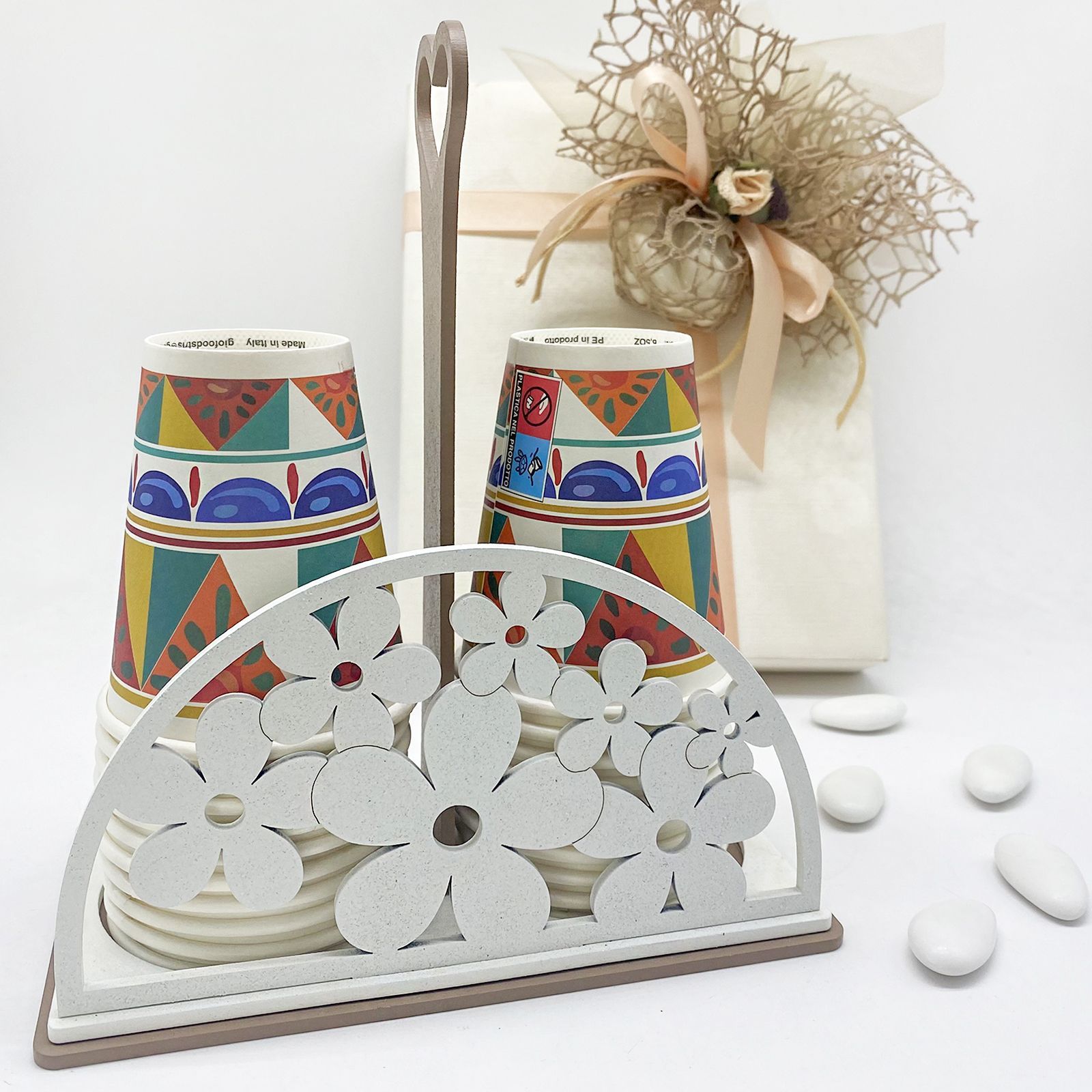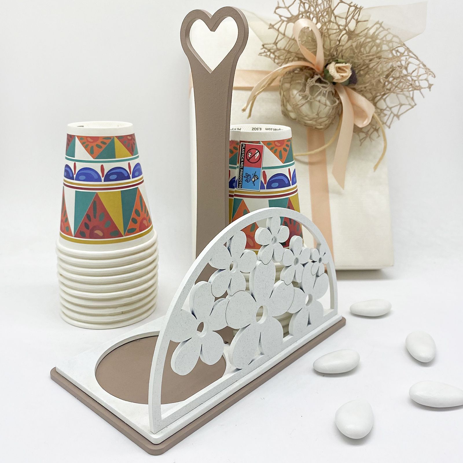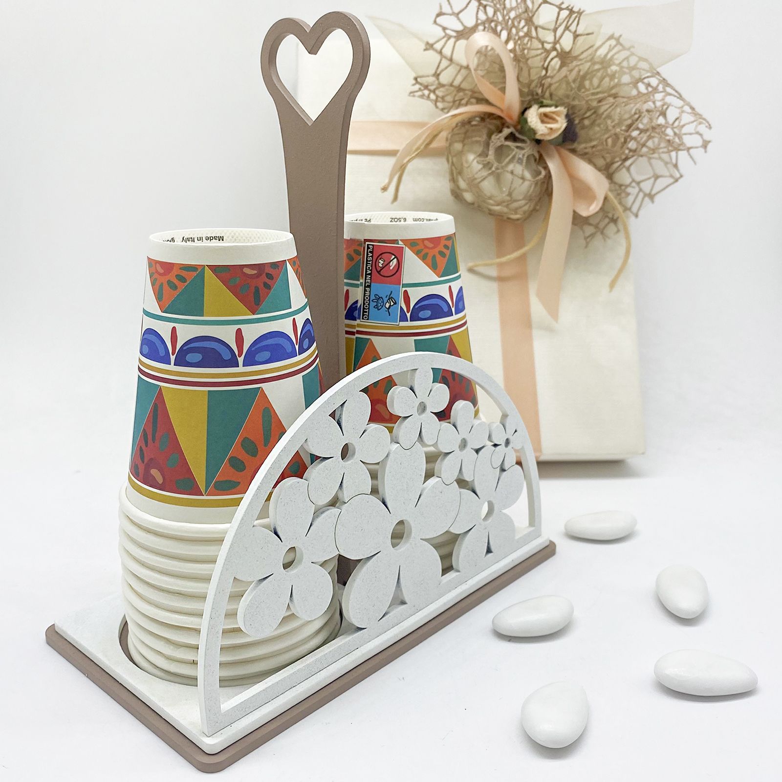 Immagina l'eleganza di questo portabicchieri in legno, con un manico a forma di cuore e ornato con fiori bianchi. Perfetto per comunione, cresima, matrimonio e anniversario, è una bomboniera raffinata e pratica.
