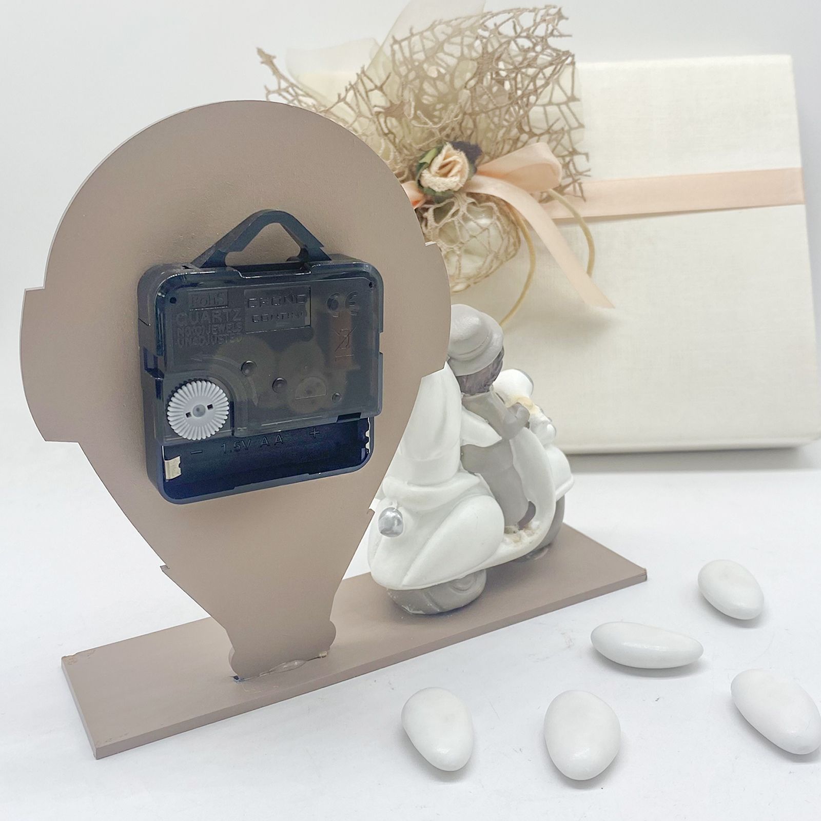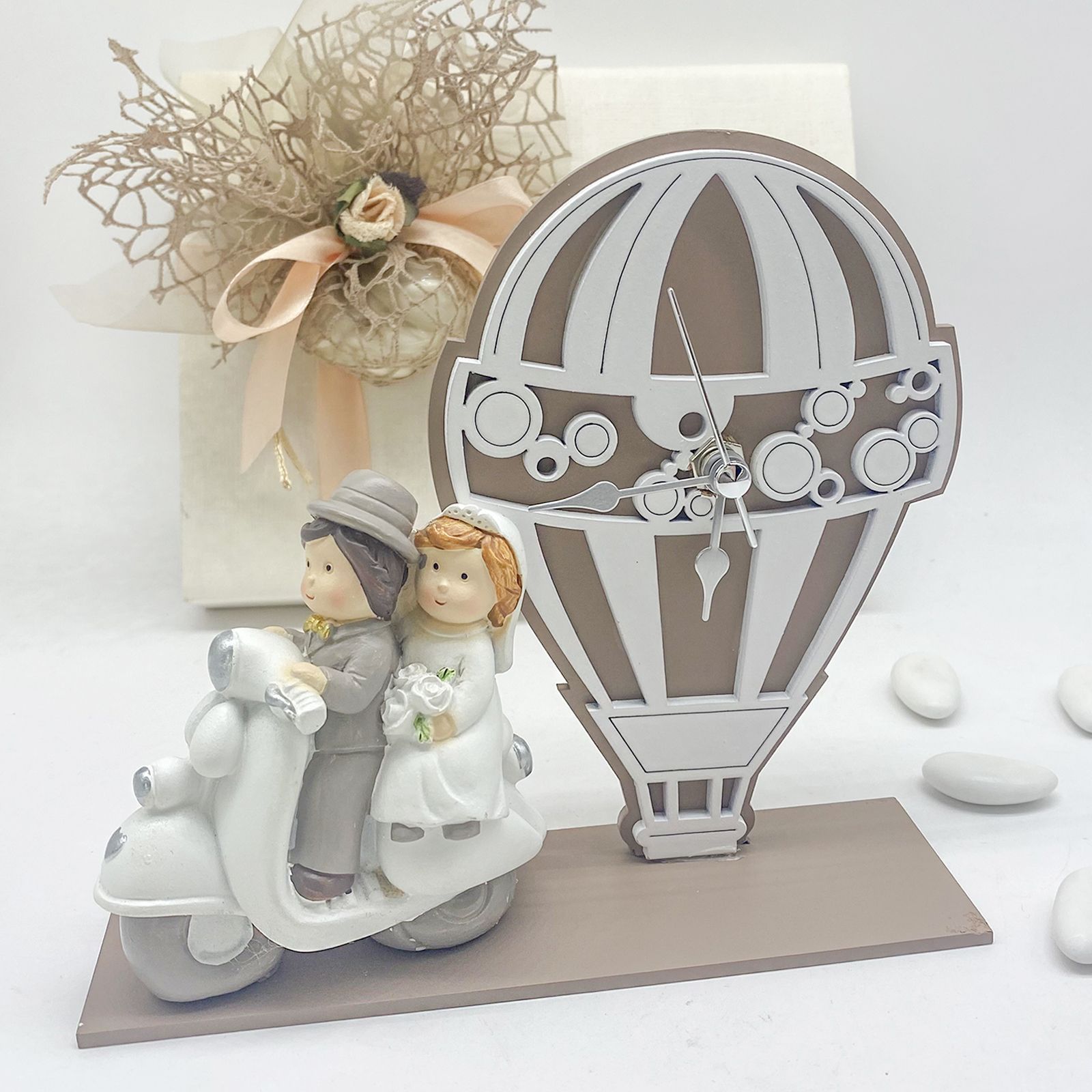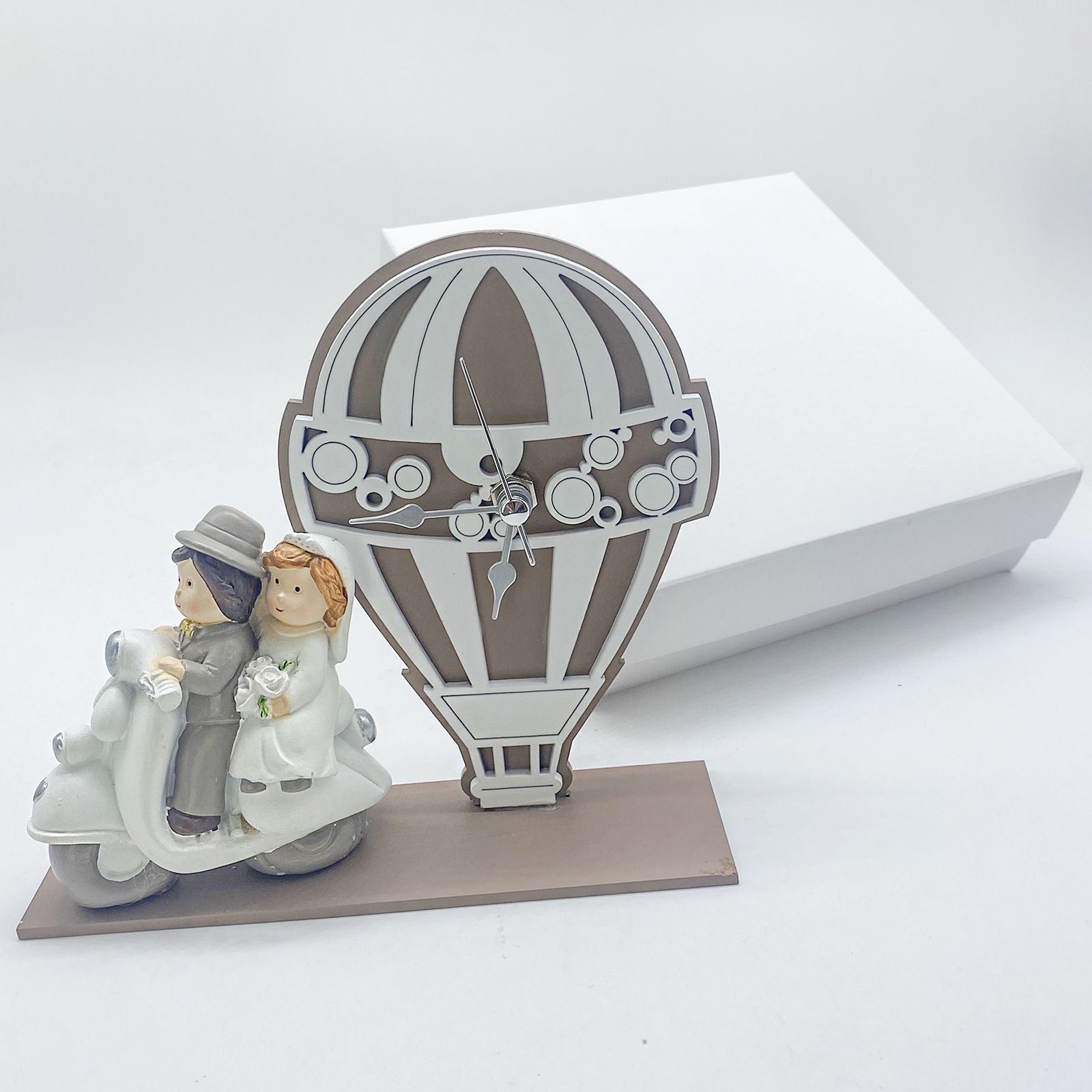 Per un matrimonio o un anniversario che merita di essere ricordato, questa bomboniera è la scelta perfetta. L'orologio a forma di mongolfiera, con la statuina di sposi su moto, rappresenta un gesto romantico e significativo che celebra l'unione e l'avventura condivisa.