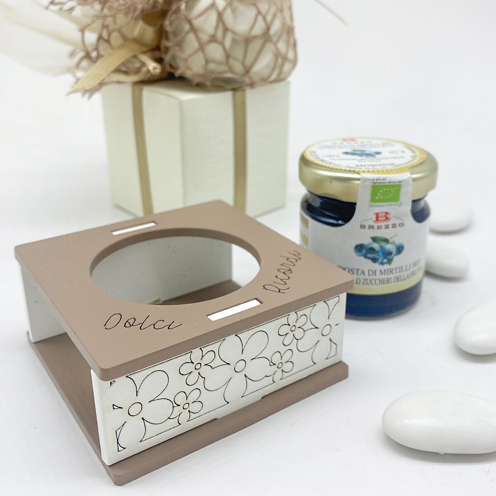 Hai mai pensato a un portamarmellata come idea unica per il tuo evento speciale? Questo raffinato accessorio, decorato con delicati fiorellini bianchi e la dolce scritta "Dolci ricordi", è perfetto per comunione, cresima, diciottanni, anniversario o matrimonio.