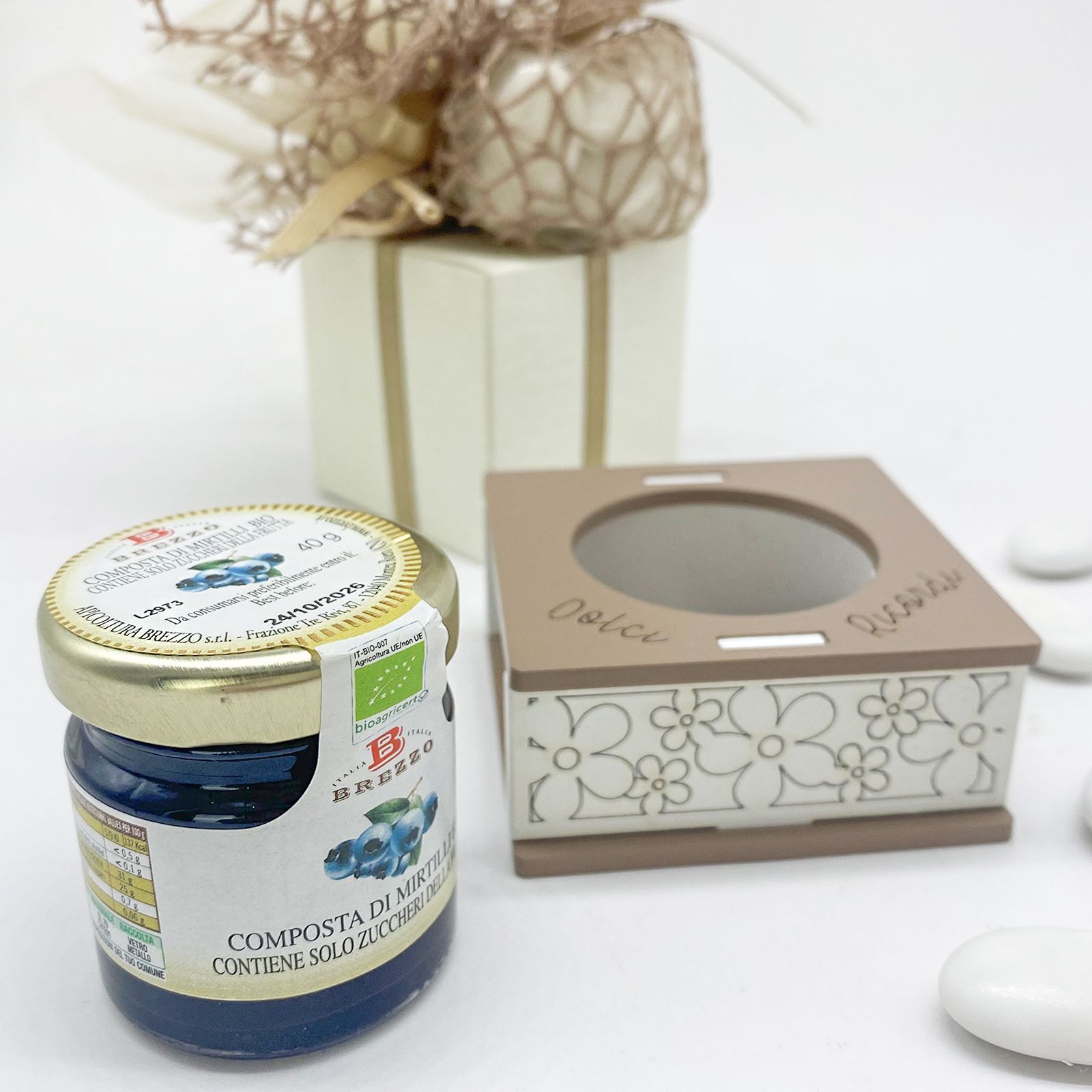Insieme al portamarmellata, è incluso un barattolino di composta di frutta (gusto casuale) per rendere la tua bomboniera ancora più speciale e personale.