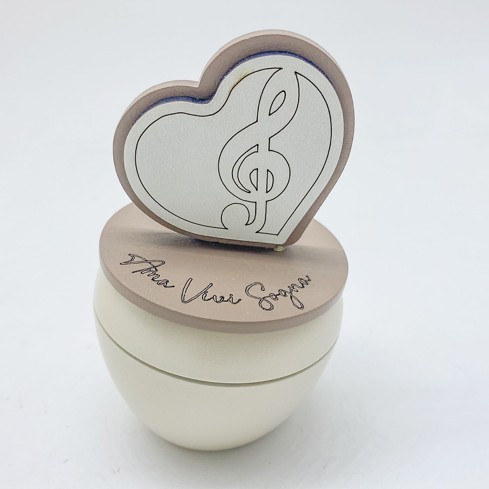 Elegante e versatile, questo portacandela di circa 9 cm x 3 cm è perfetto per comunioni, cresime, matrimoni e anniversari. Realizzato in plastica e legno nei colori bianco e tortora, è impreziosito da un coperchio con la scritta "ama, vivi, sogna" e un cuore con chiave di sol, ideale anche per eventi a tema musica.