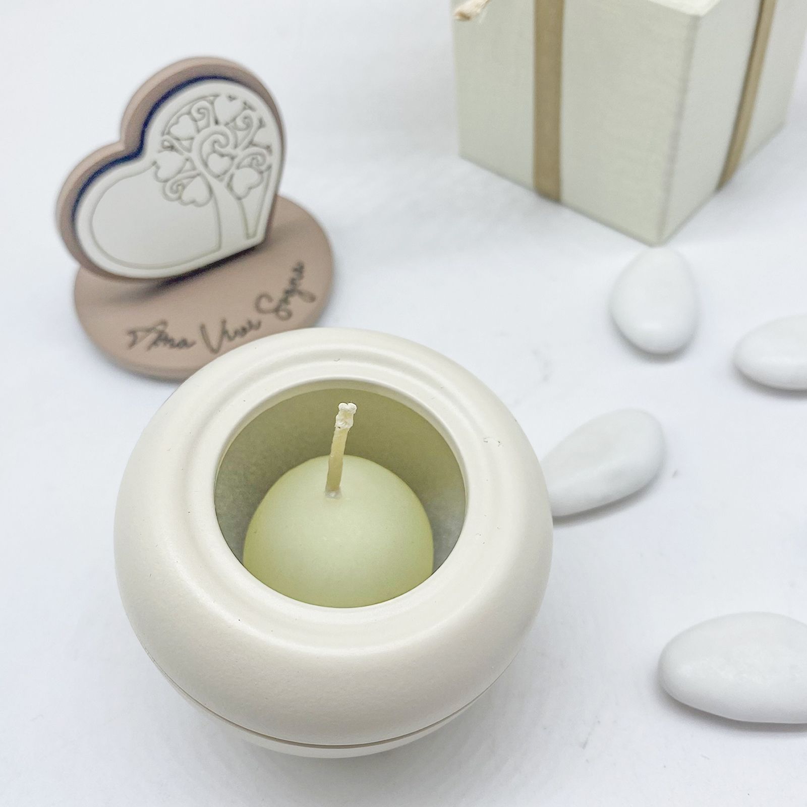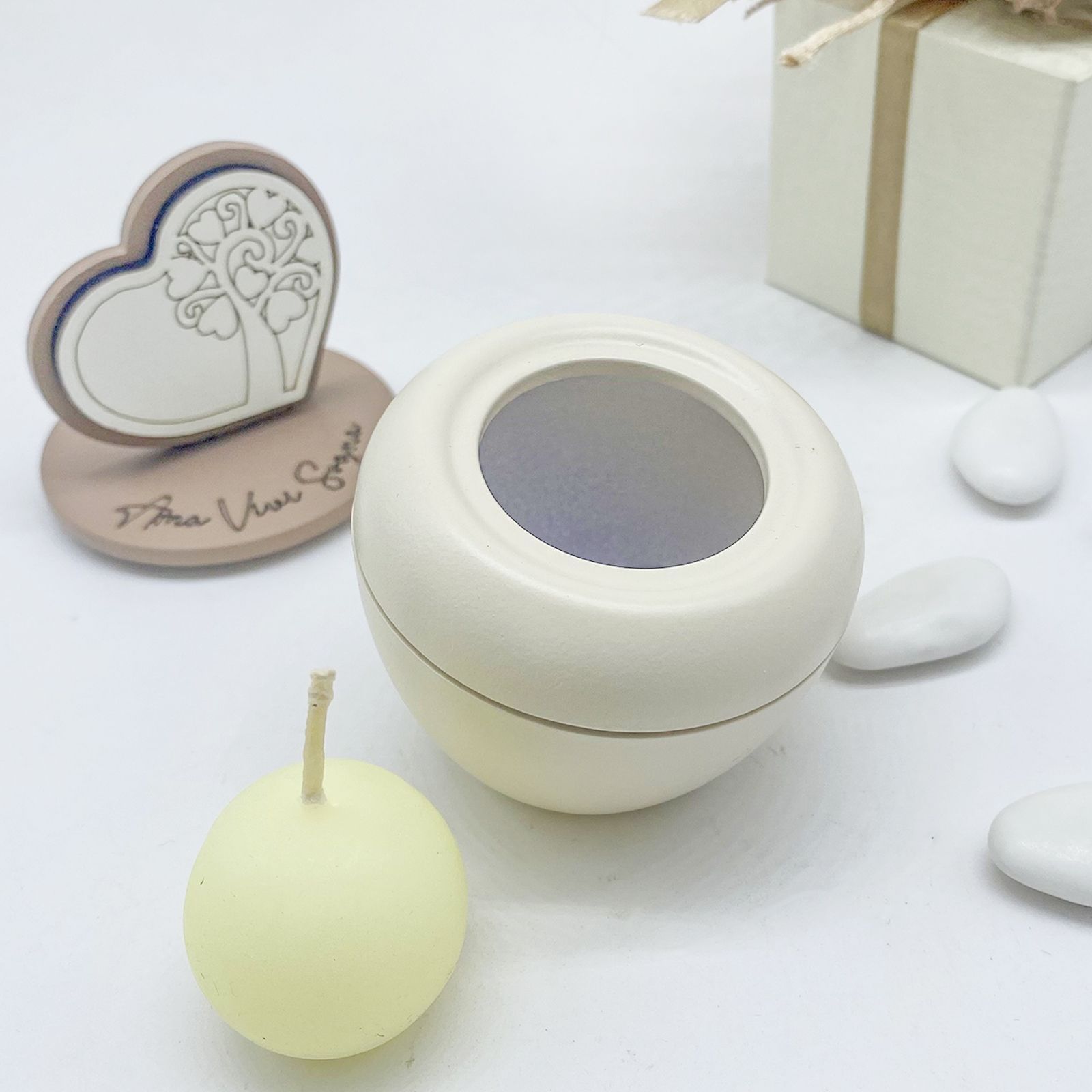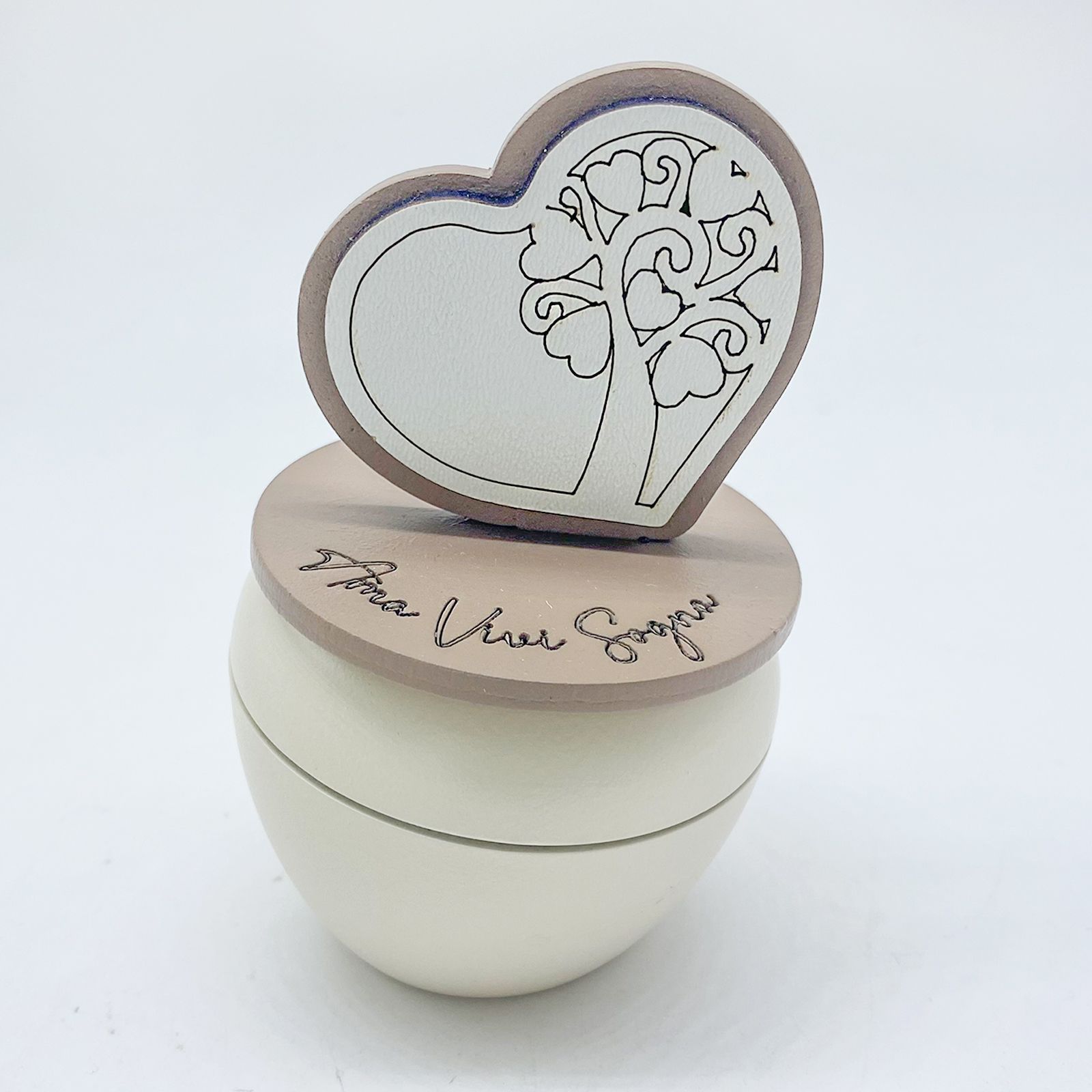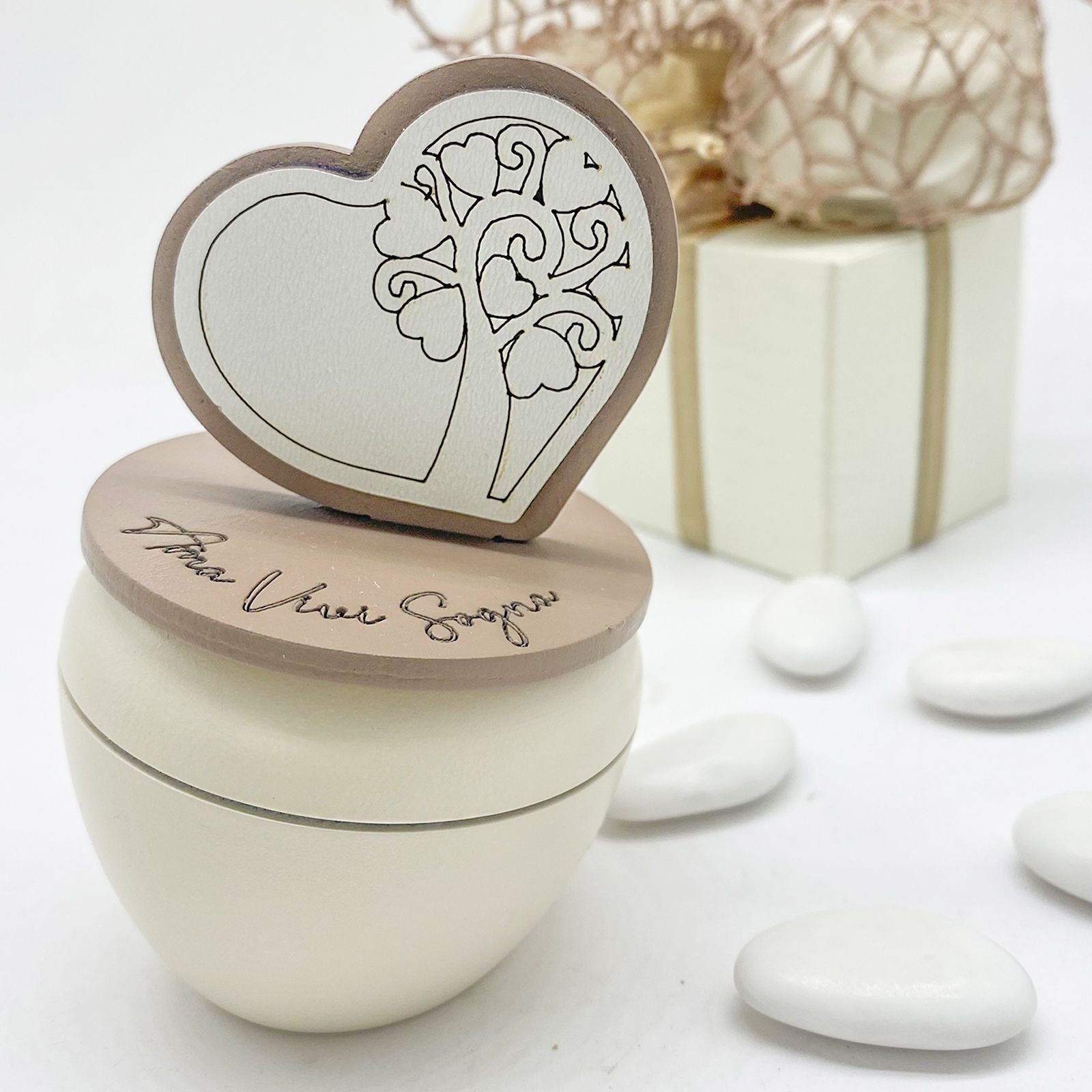 Caratterizzato da un design raffinato in bianco e tortora, il portacandela è decorato con una scritta ispiratrice "ama, vivi, sogna" e un albero della vita con foglie a forma di cuore. Questo simbolo rappresenta la crescita e l'amore eterno, rendendo ogni evento ancora più speciale.