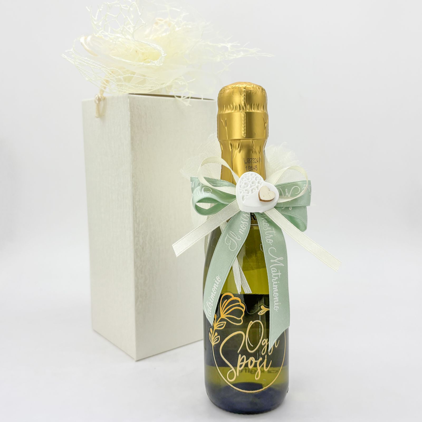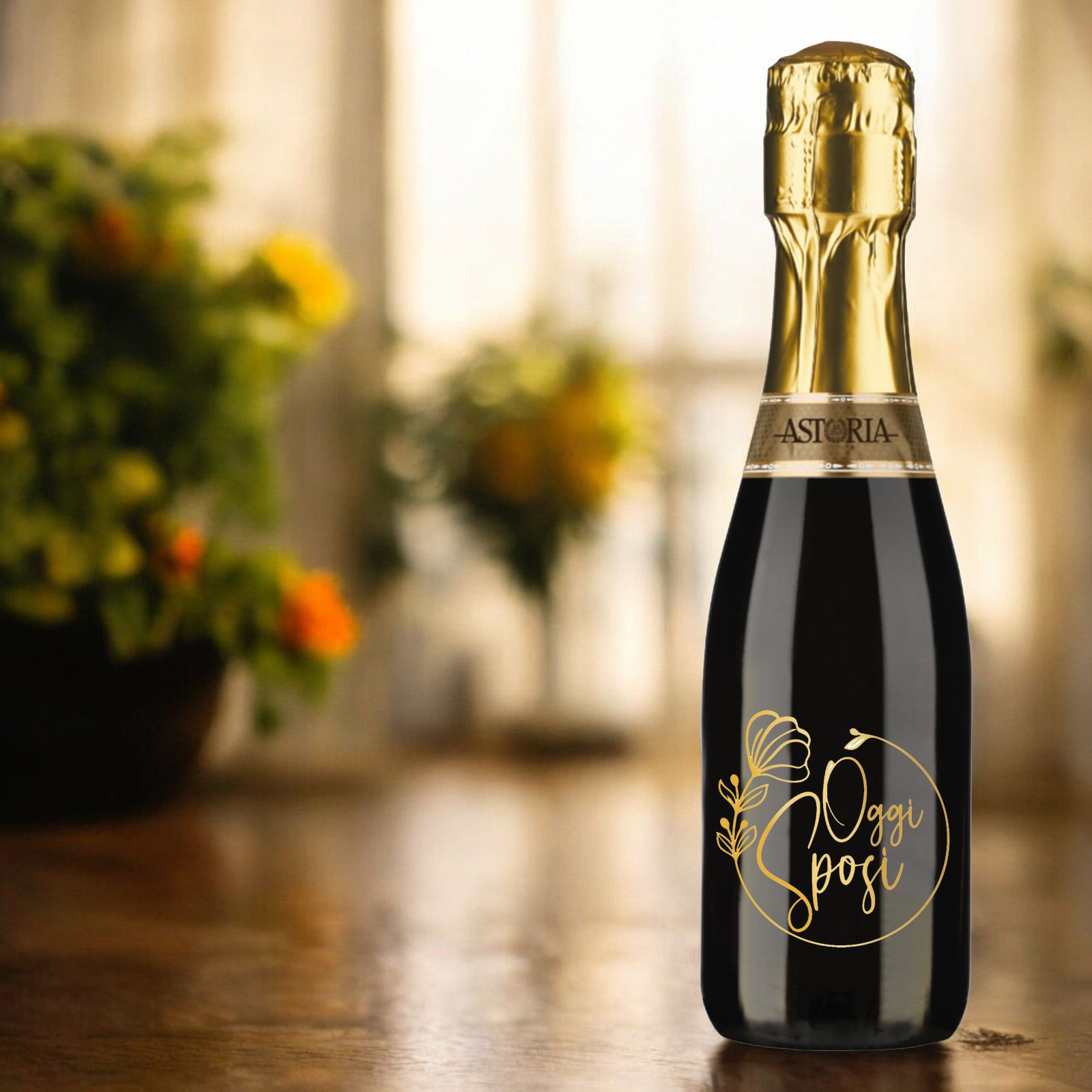 Questa bomboniera è un'idea particolare e originale per celebrare momenti speciali come un matrimonio, un anniversario o una promessa. La bottiglia di Prosecco Doc Extra Dry è decorata con la scritta "Oggi Sposi" e una delicata decorazione floreale, rendendola unica e indimenticabile.