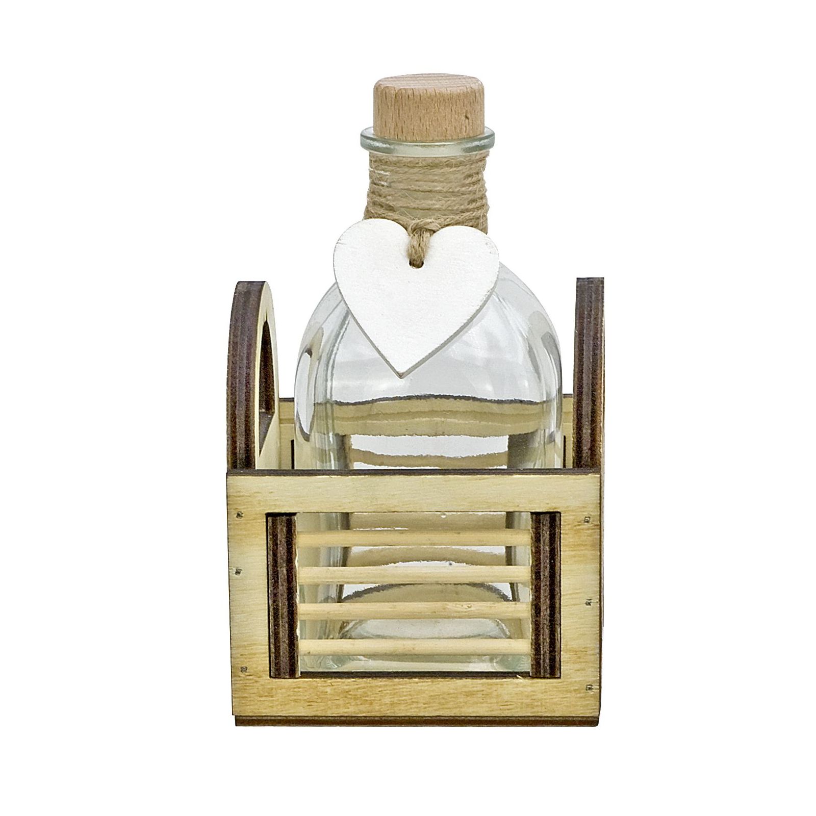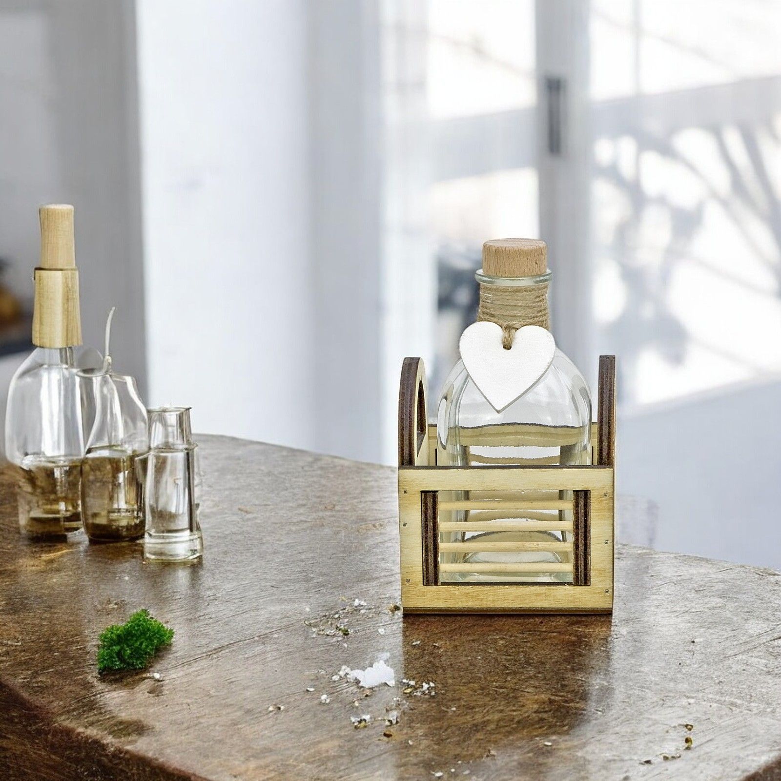 Ogni dettaglio di questa bomboniera completa è curato con passione: il cestino in legno, la bottiglia in vetro con tappo in sughero e il cuoricino bianco con spago creano un design raffinato. Con dimensioni di circa 16x9 cm, si adatta facilmente a ogni tipo di cerimonia, diventando un accessorio pratico e funzionale per la casa dei tuoi ospiti.