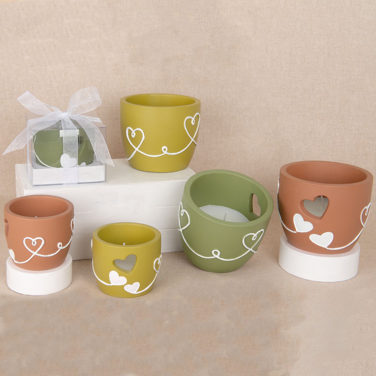 Eleganza e raffinatezza si uniscono nel nostro portacandela assortito in tre differenti colori, decorato con delicati cuoricini, una bomboniera originale perfetta per celebrare matrimoni, anniversari, comunioni e cresime.