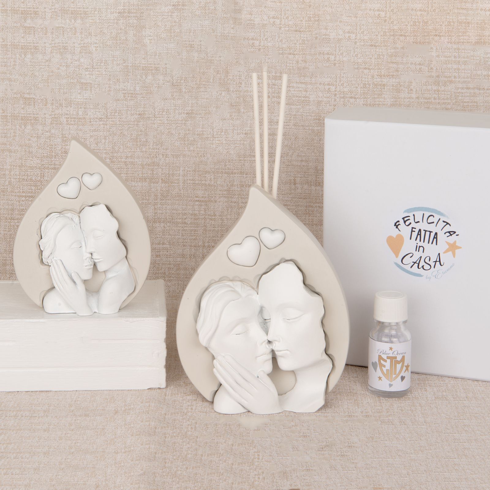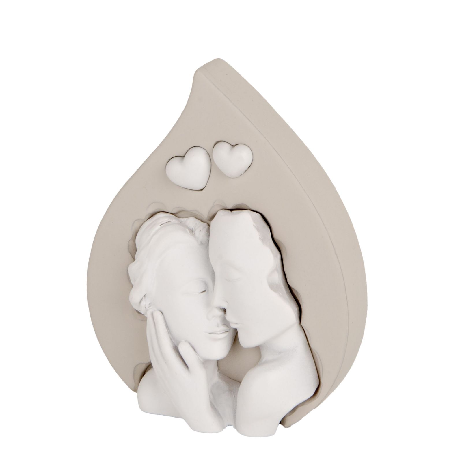 Questa icona è un simbolo di amore e felicità, perfetto per ogni occasione speciale come un matrimonio, un anniversario o una promessa. Realizzata in resina di alta qualità, rappresenta due innamorati abbracciati e due cuori racchiusi in una delicata goccia. Le dimensioni di questa bomboniera sono di 11 cm di altezza, ideale da regalare come segno di gratitudine agli invitati alla cerimonia.