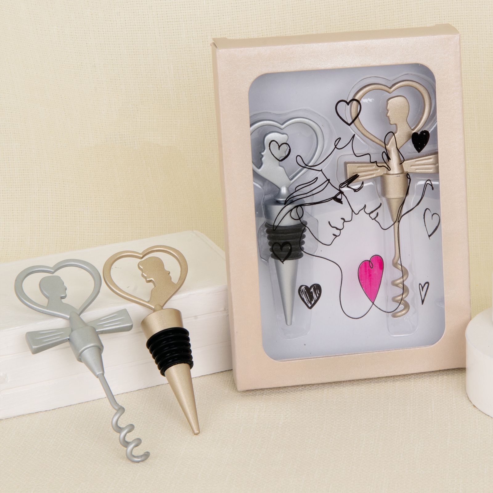Un'idea originale ed economica per ringraziare i tuoi invitati alla cerimonia è questo set tappo e cavatappo decorati. Realizzati in metallo e dal design romantico, il tappo è decorato con un cuore e la sagoma di lei, mentre il cavatappi presenta un cuore e la sagoma di lui. Le dimensioni di questo set sono di cm 12 e i colori disponibili sono bianco e tortora.