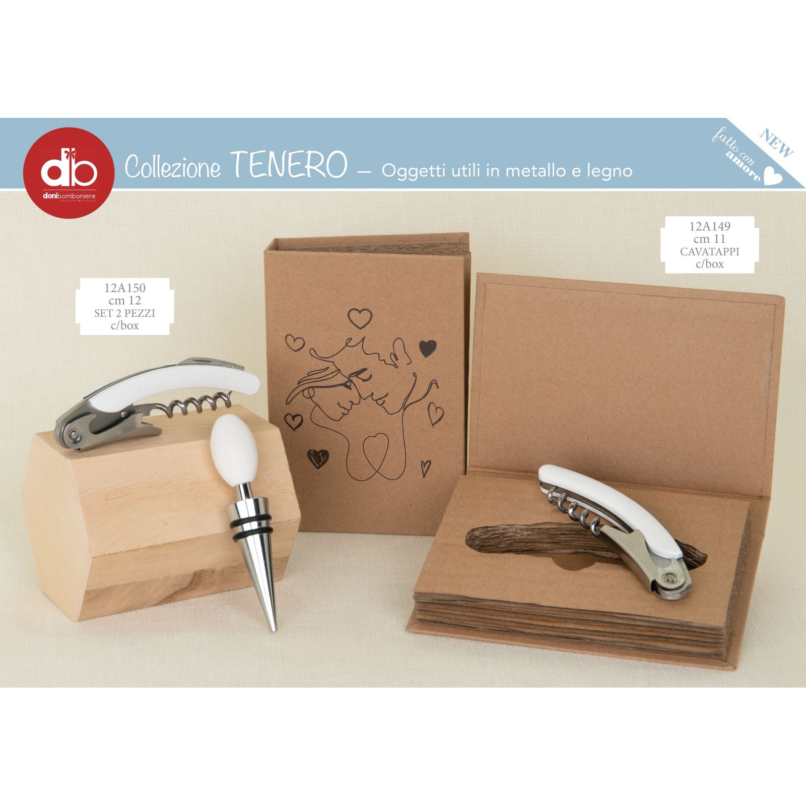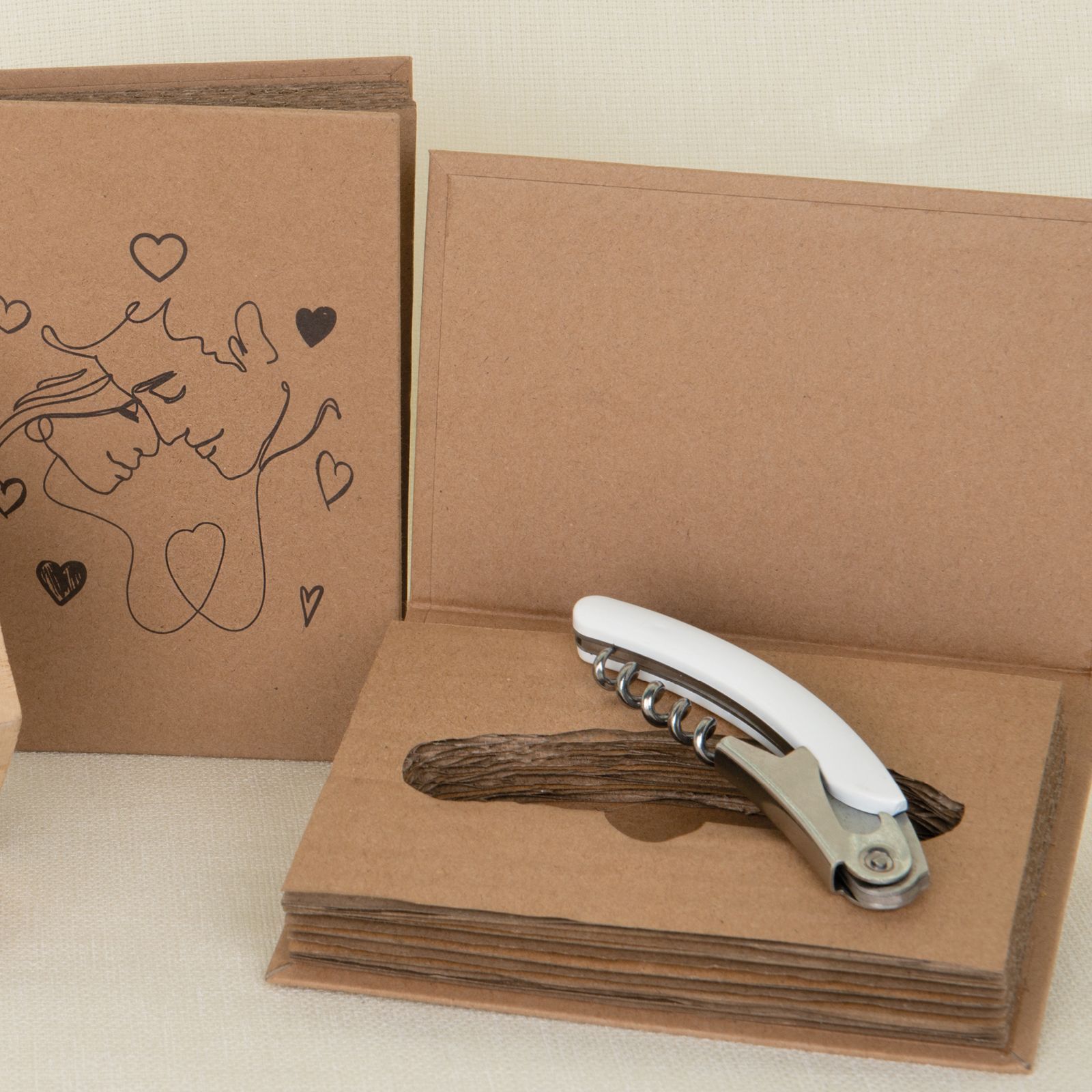 Il cavatappi è un'idea originale ed economica per le tue bomboniere da regalare agli invitati al matrimonio o all'anniversario. Con le sue dimensioni di circa 11 cm, questo cavatappi in metallo si presenta in una elegante scatola avana a libro con un romantico disegno di innamorati in omaggio.