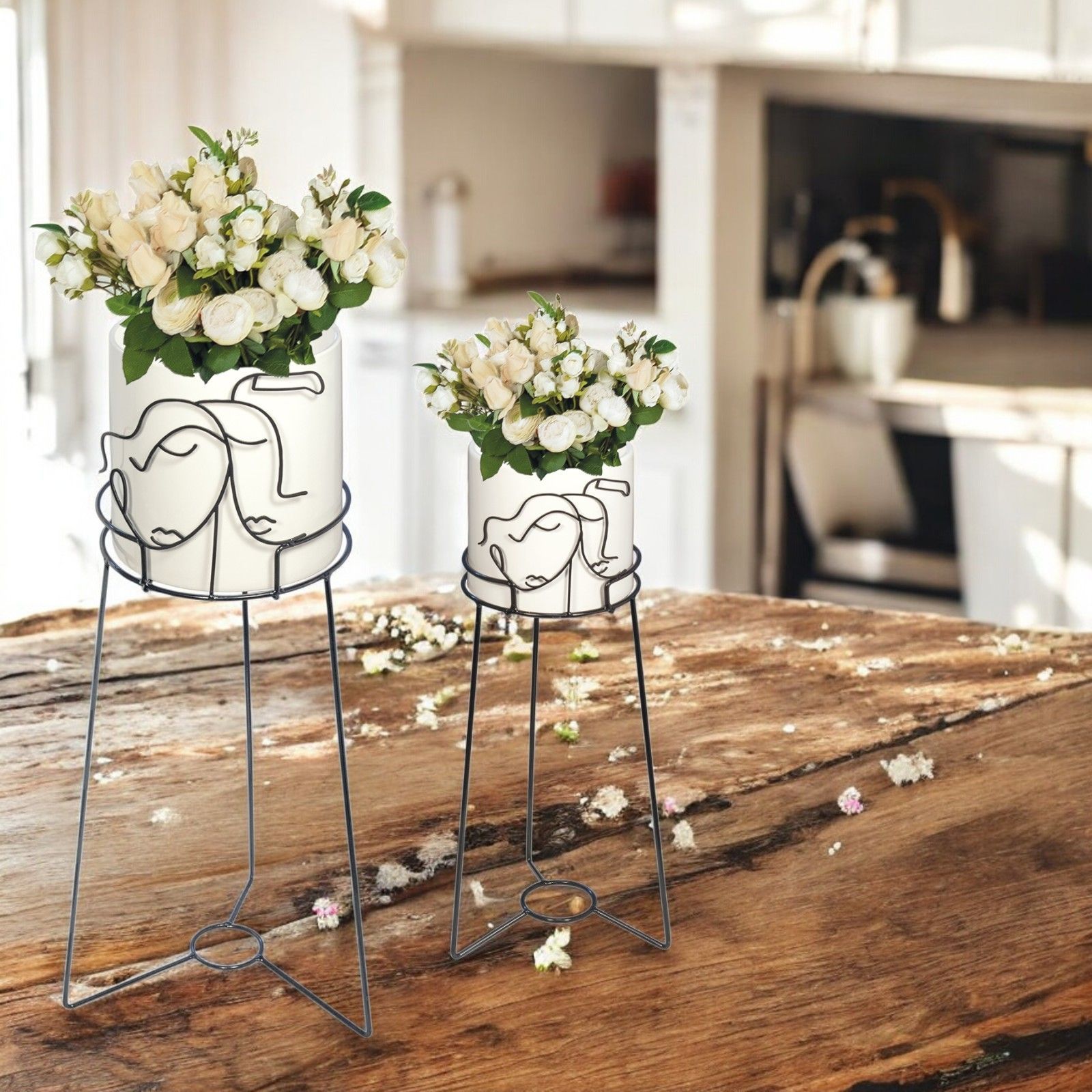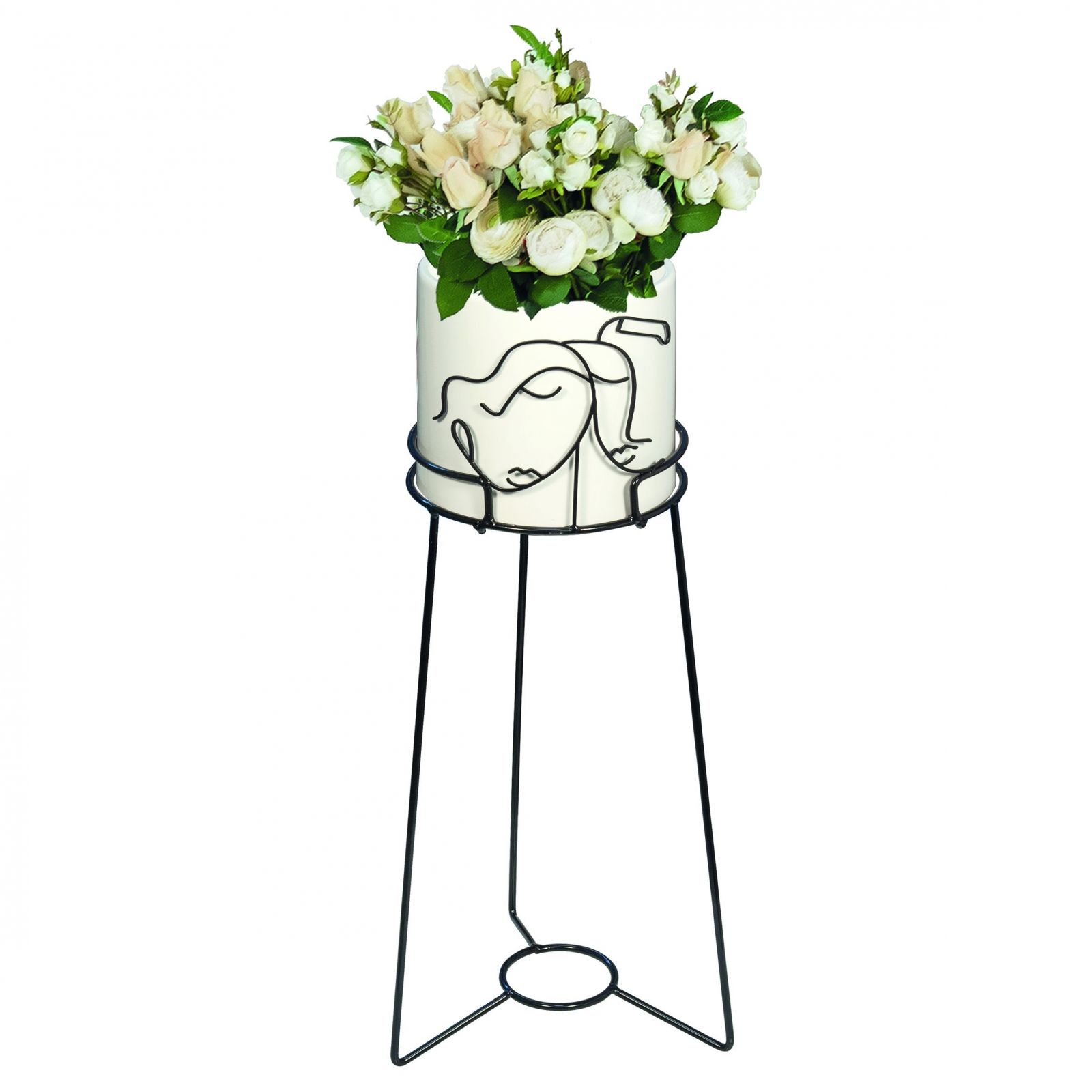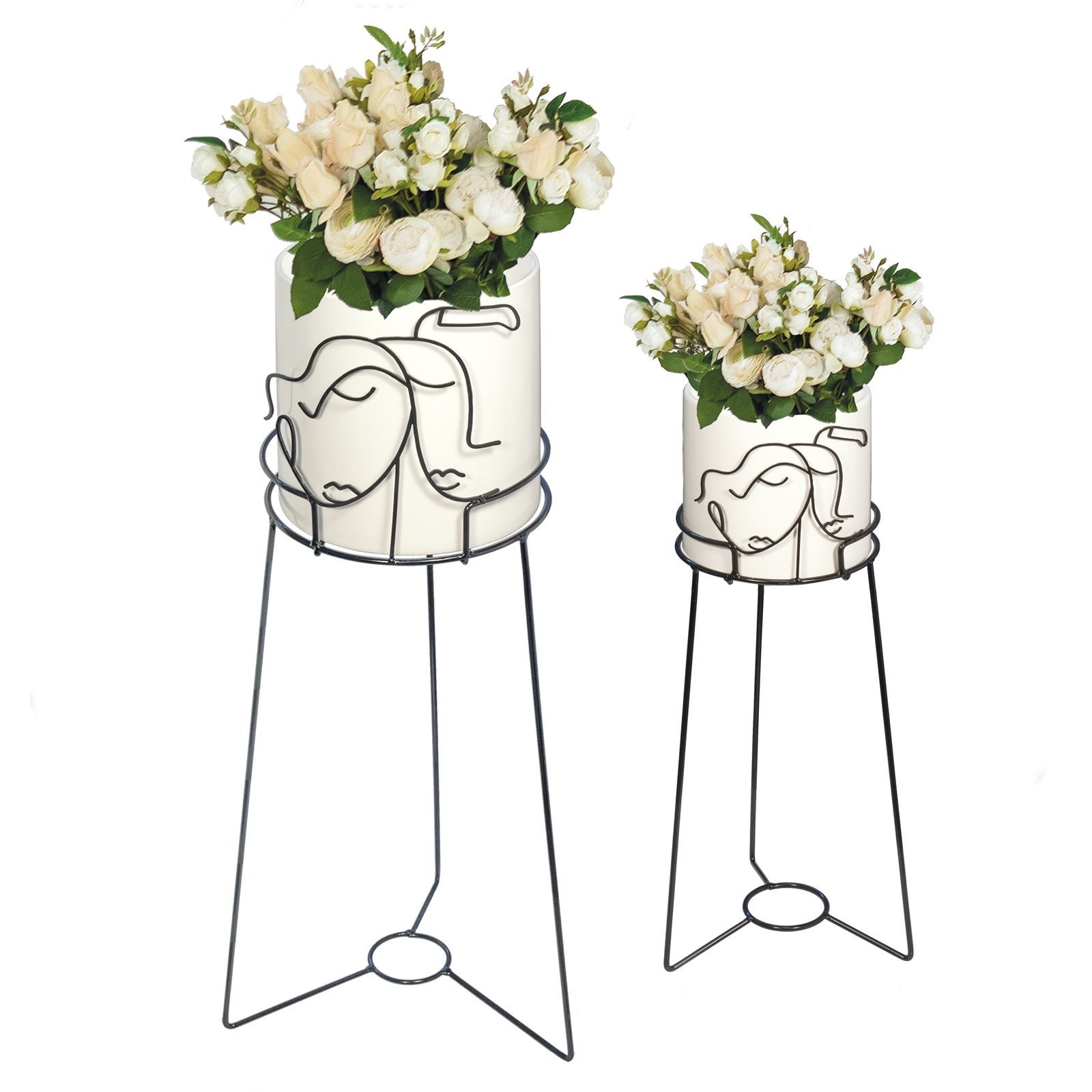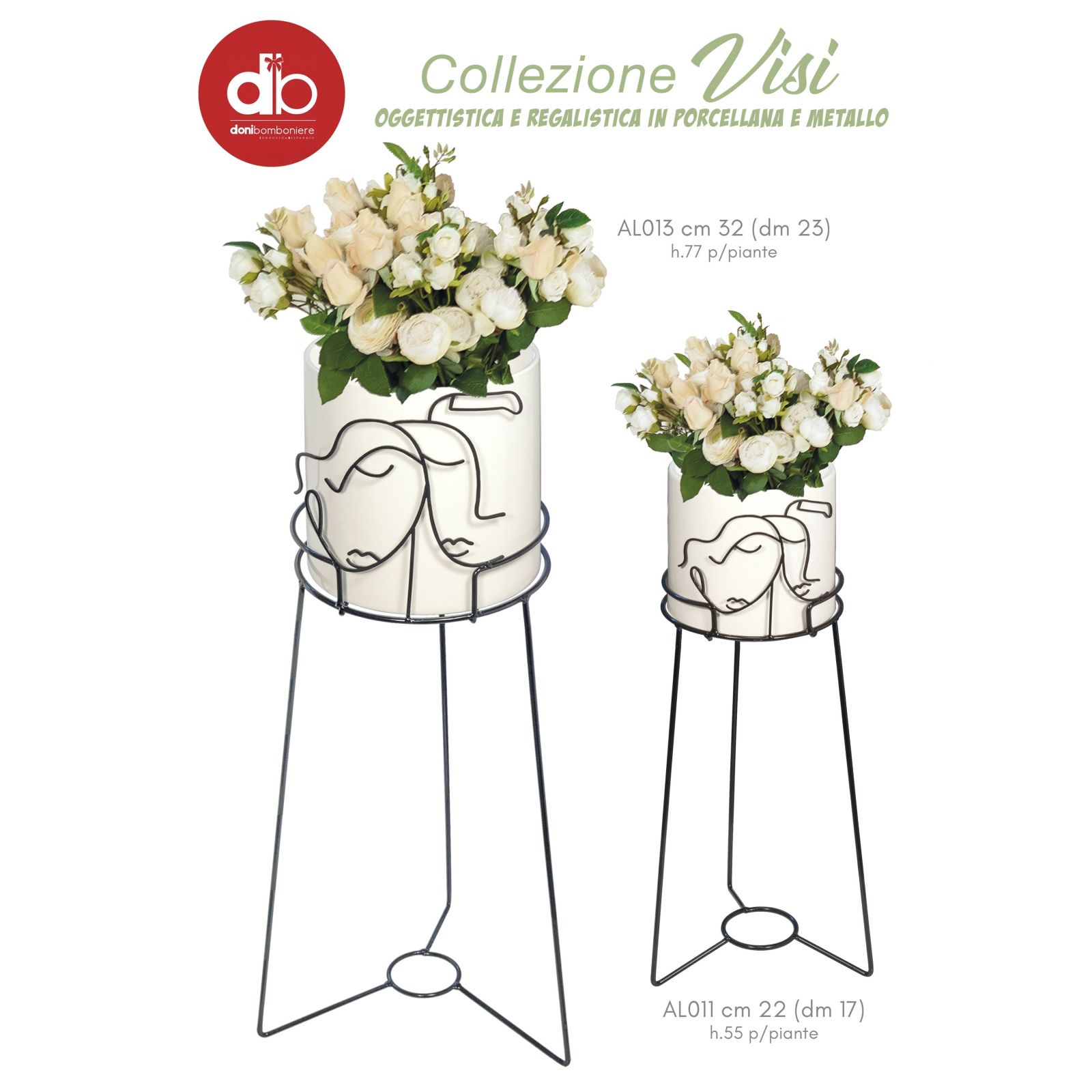 Il vaso portapiante con supporto in metallo con coppia di innamorati stilizzati è un'idea originale e particolare per bomboniere da regalare agli invitati in occasione di matrimoni o anniversari. Questo elegante oggetto, disponibile nei colori bianco e nero, è realizzato in metallo e porcellana e può essere scelto in due diverse dimensioni: Standard (CM.22 (DM.17) H.55) o Grande (CM.32 (DM.23) H.77).