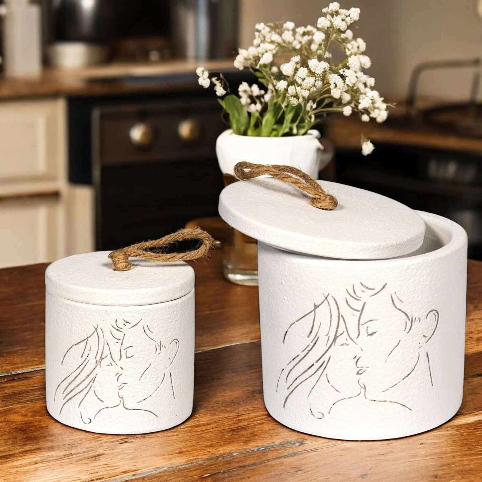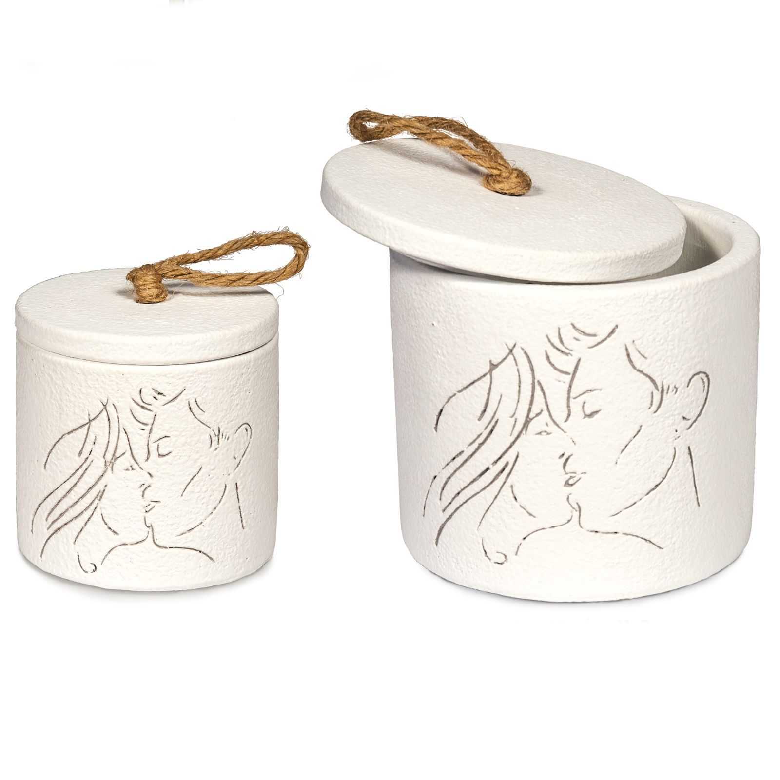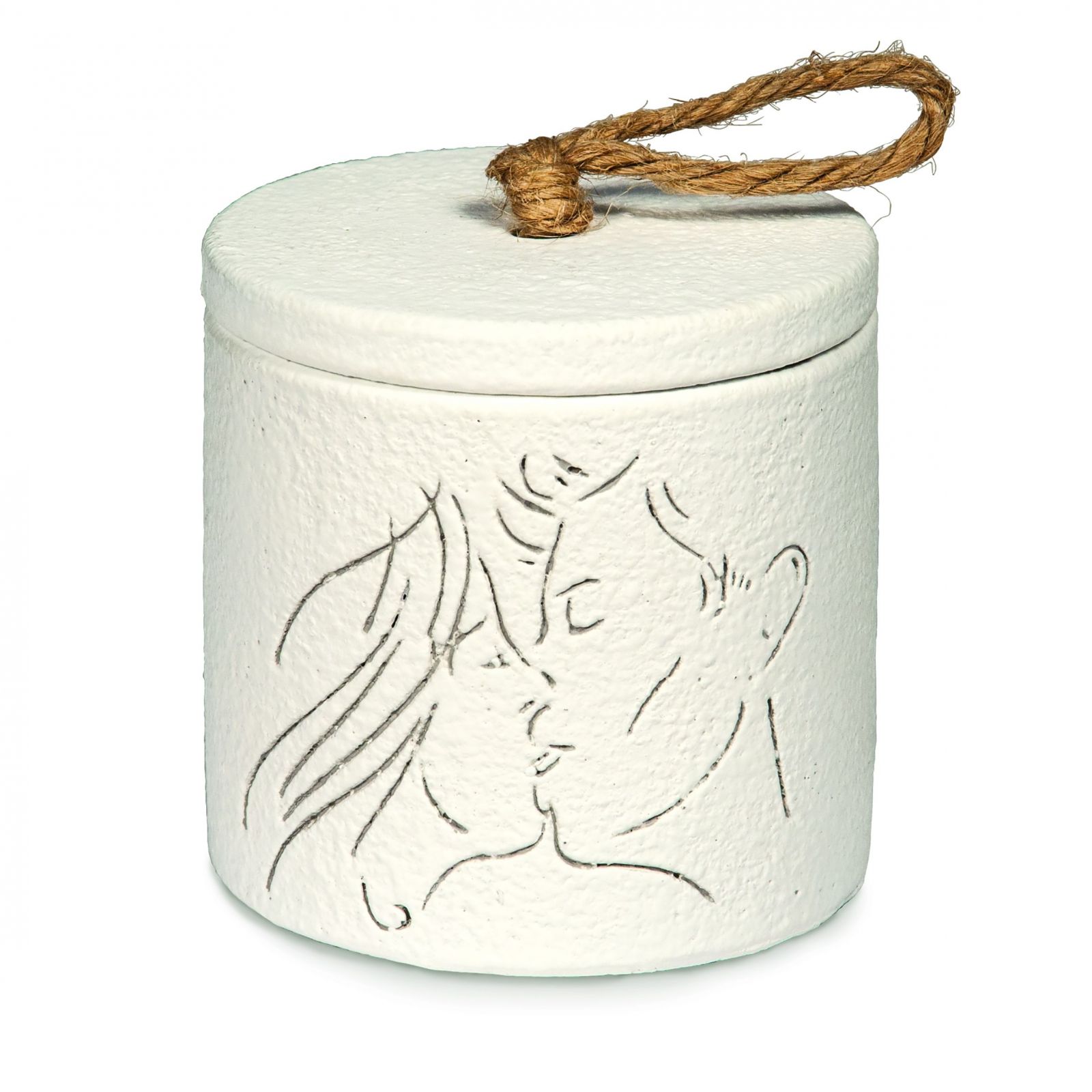 Disponibile in due dimensioni – Standard (dm. 8 x h. 8 cm circa) e Grande (dm. 11,5 x h. 11 cm circa) – questa bomboniera si adatta perfettamente a qualsiasi tipo di cerimonia. Il colore bianco e la raffigurazione di innamorati che si baciano la rendono romantica ed elegante, un dettaglio perfetto per completare le vostre partecipazioni.