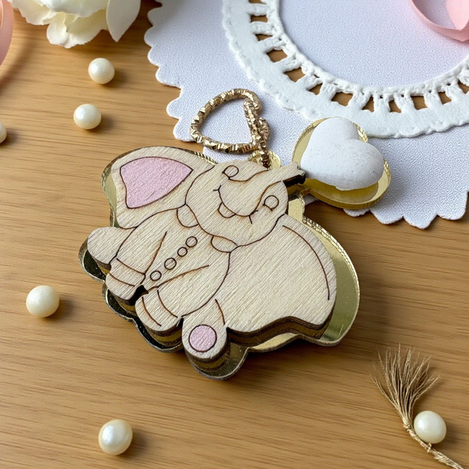 Realizzata con materiali di alta qualità, questa applicazione è un mix perfetto tra il plexiglass oro specchiato e il legno, creando un effetto luminoso e raffinato. Il cuoricino bianco in gesso e i ciondoli in metallo a forma di cuore aggiungono un tocco di dolcezza, rendendo ogni bomboniera unica e indimenticabile.