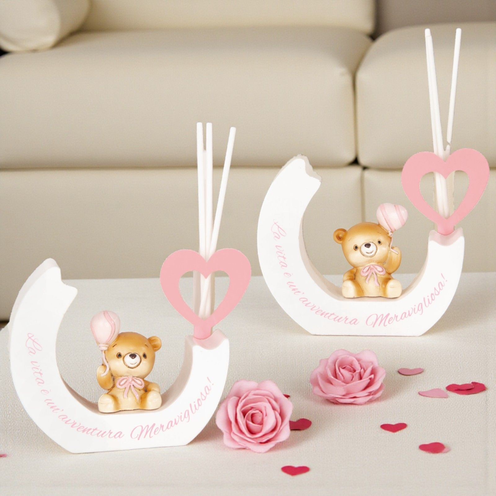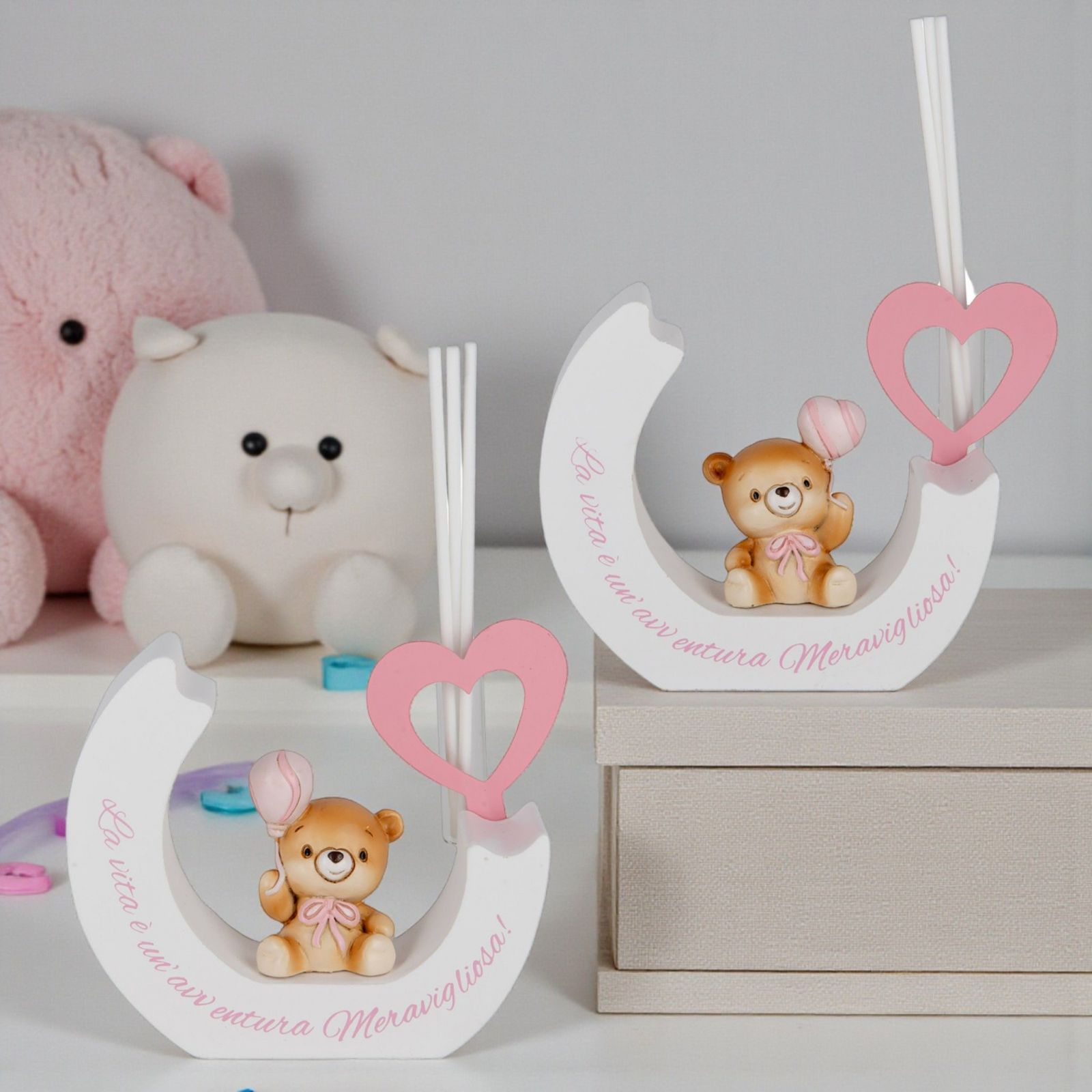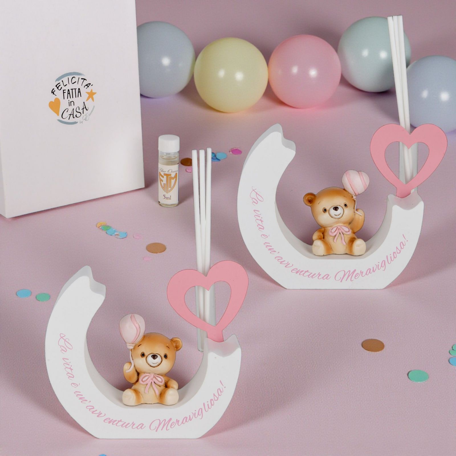 Scopri un’idea bomboniera unica e carica di significato: il diffusore essenza con orsetto e palloncino. Questo adorabile oggetto, con la dolce scritta "La vita è un'avventura meravigliosa", è perfetto per celebrare momenti speciali come il battesimo della tua bimba o il suo primo compleanno. Ogni volta che si diffonde la fragranza, si ricorda il valore dei piccoli istanti che rendono la vita straordinaria.